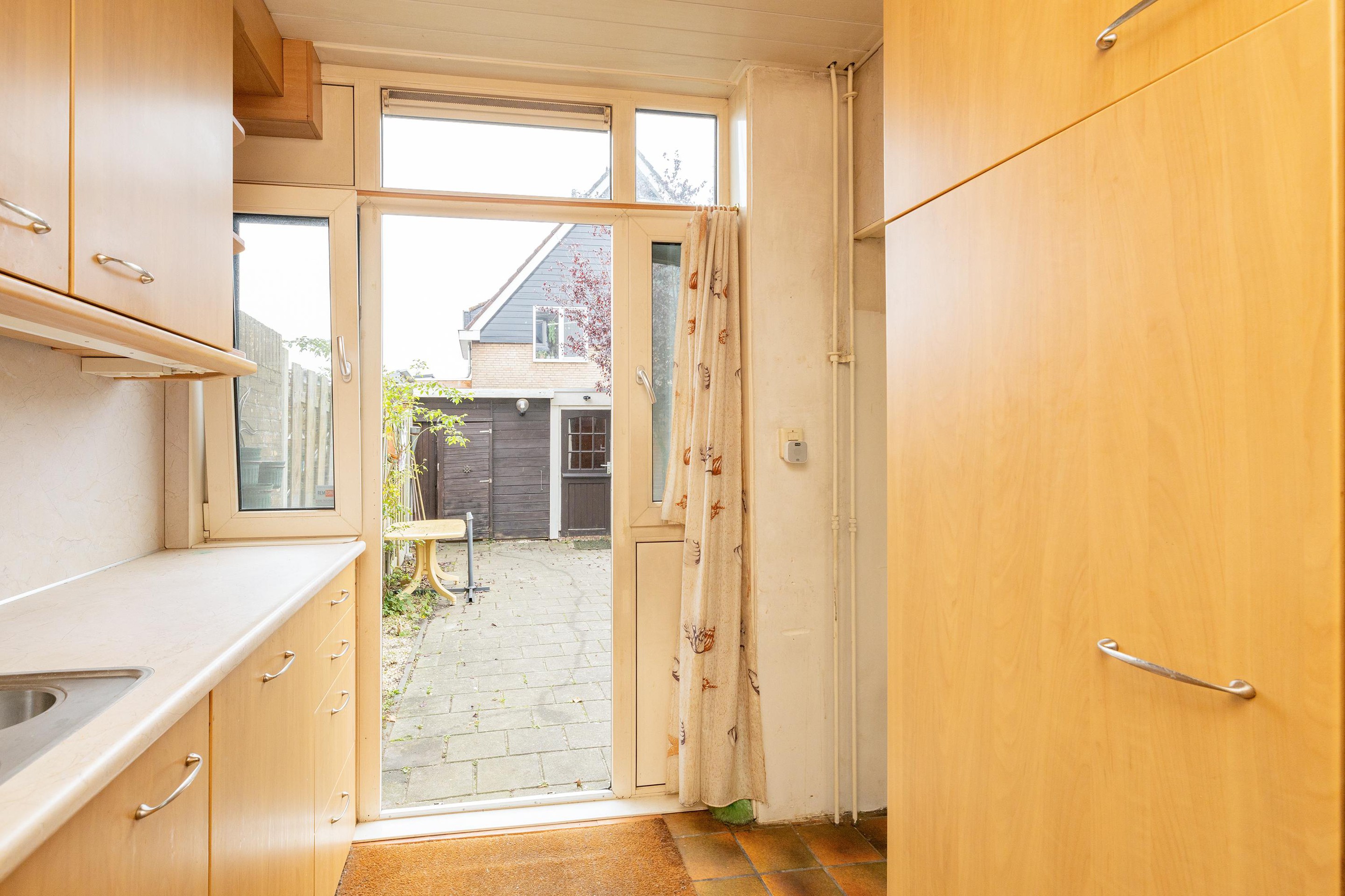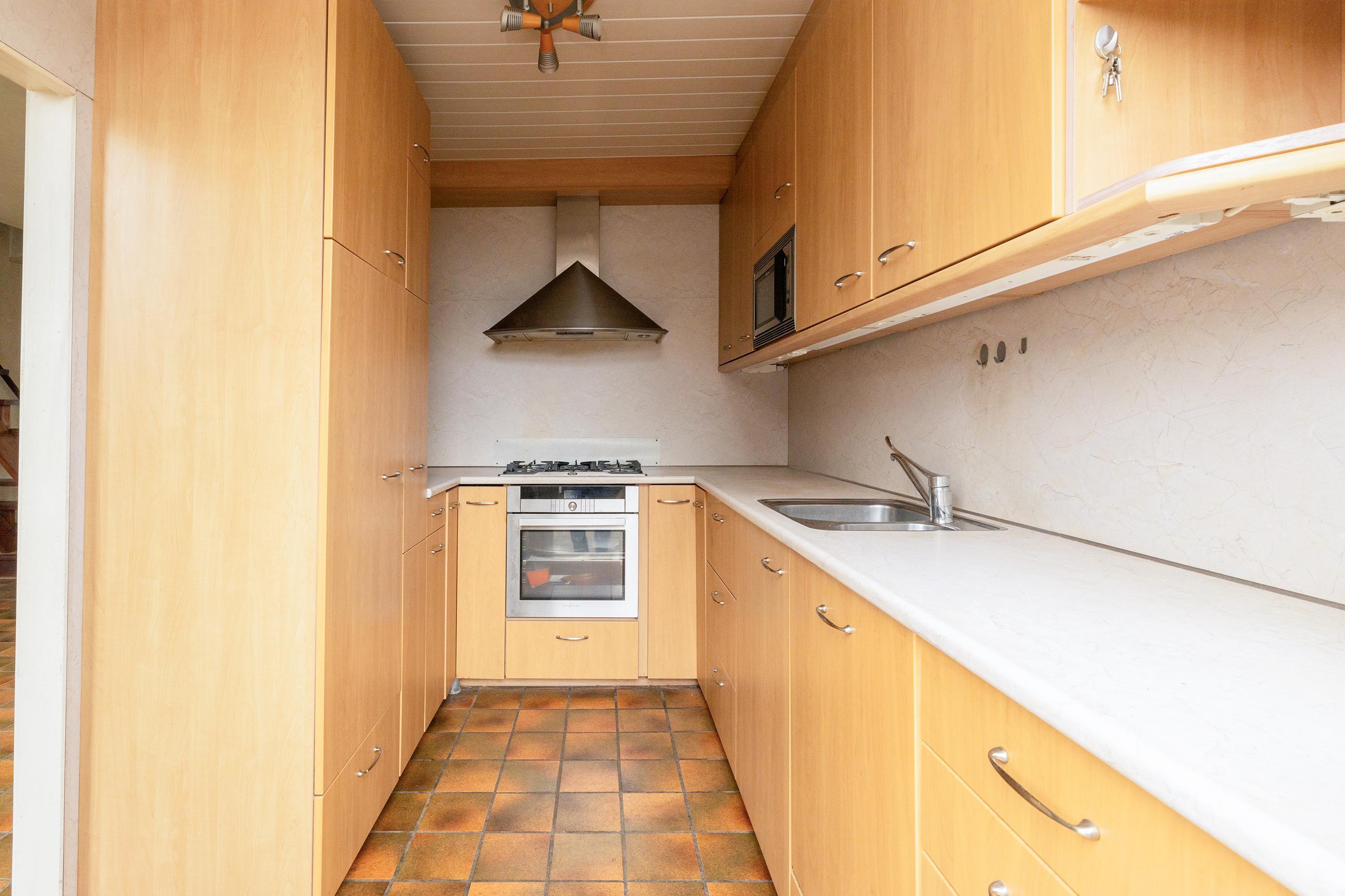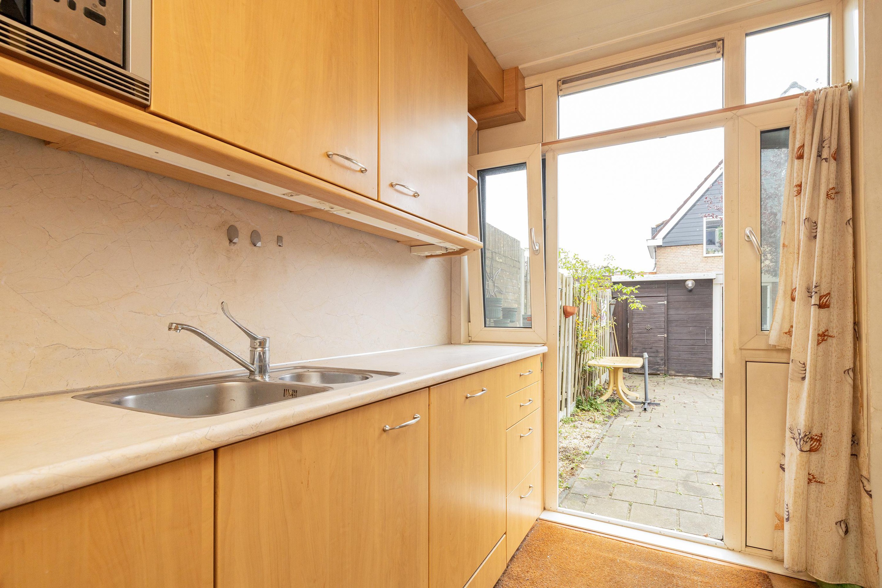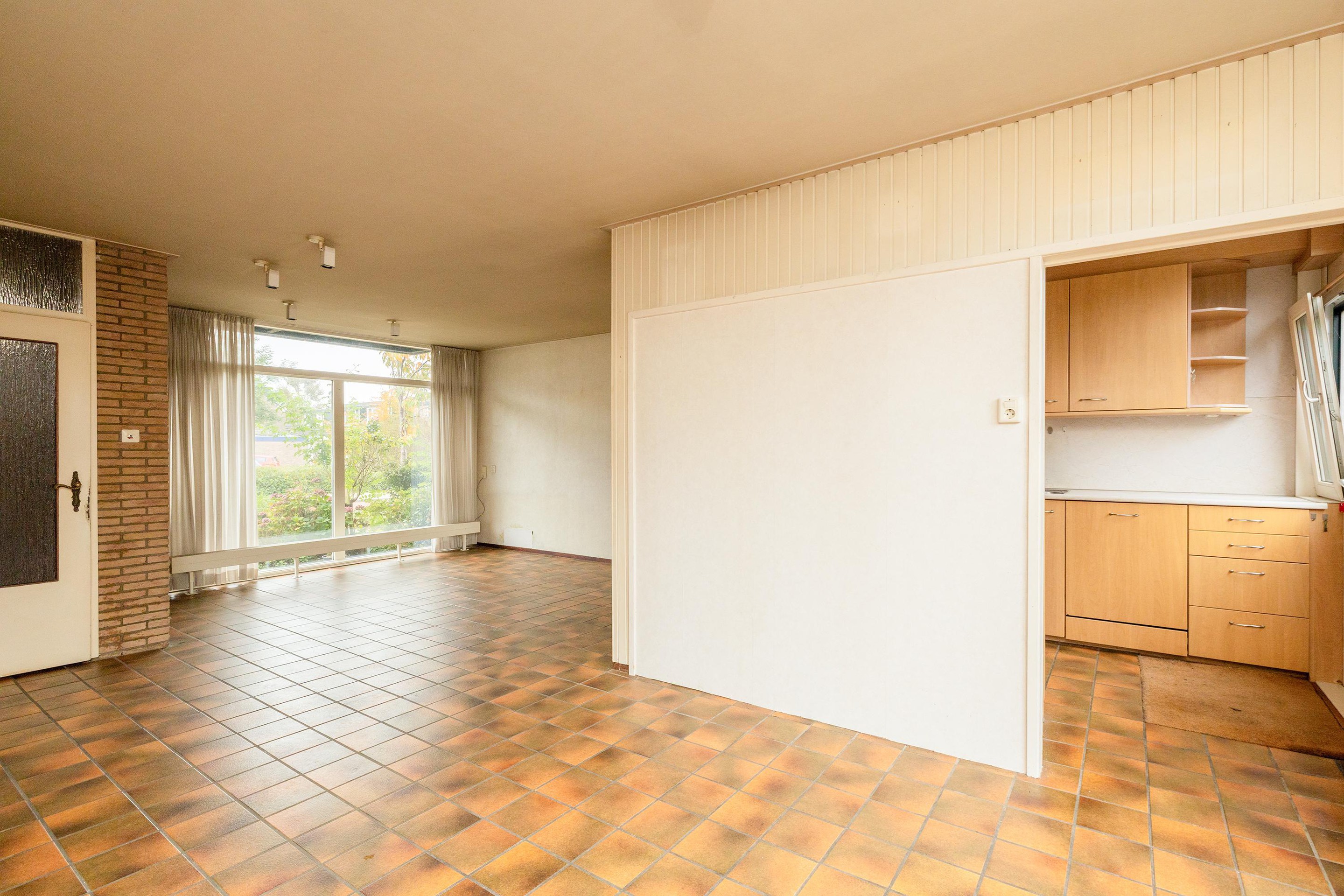 De plavuizen vloer loopt vanuit de hal drempelloos door de gehele benedenverdieping. Rechtdoor komen we in de woonkamer. De grote raampartijen zorgen voor lekker veel licht en aan de achterzijde (Westen), bij het eetkamer gedeelte, zijn er dubbele openslaande deuren naar de achtertuin. Bij de hardhouten trap, rechts van de woonkamer, is nog extra kastruimte. Links achterin is de keuken, die voorzien is van een gaskookstel met afzuigkap, een oven en lekker veel kastruimte. Ook hier is een deur naar de tuin.