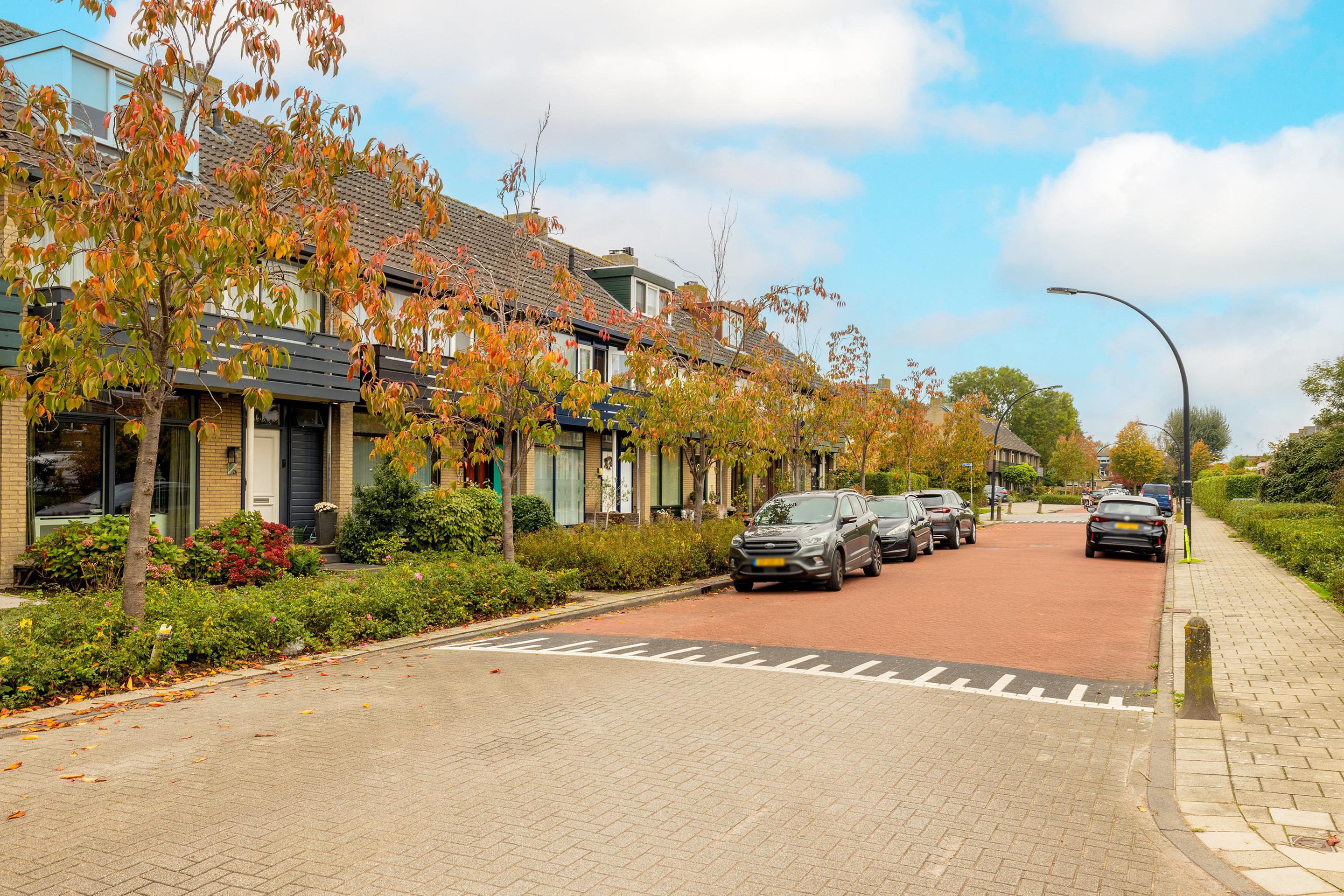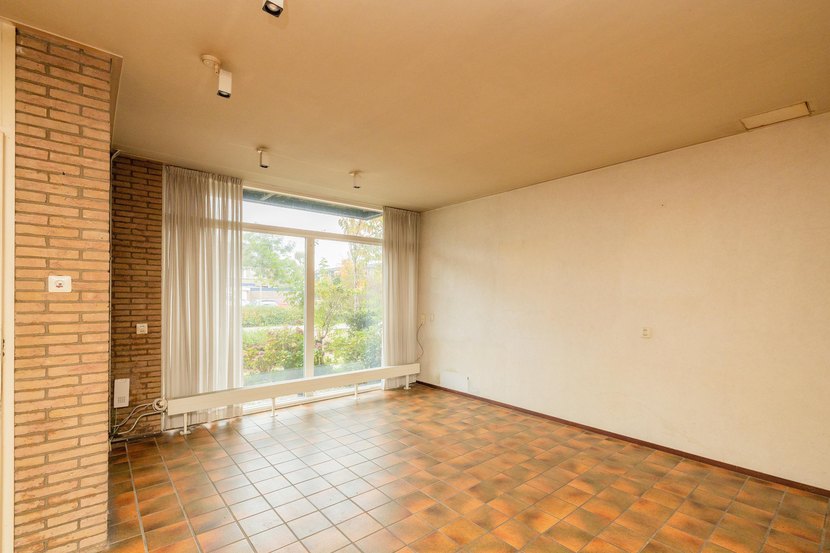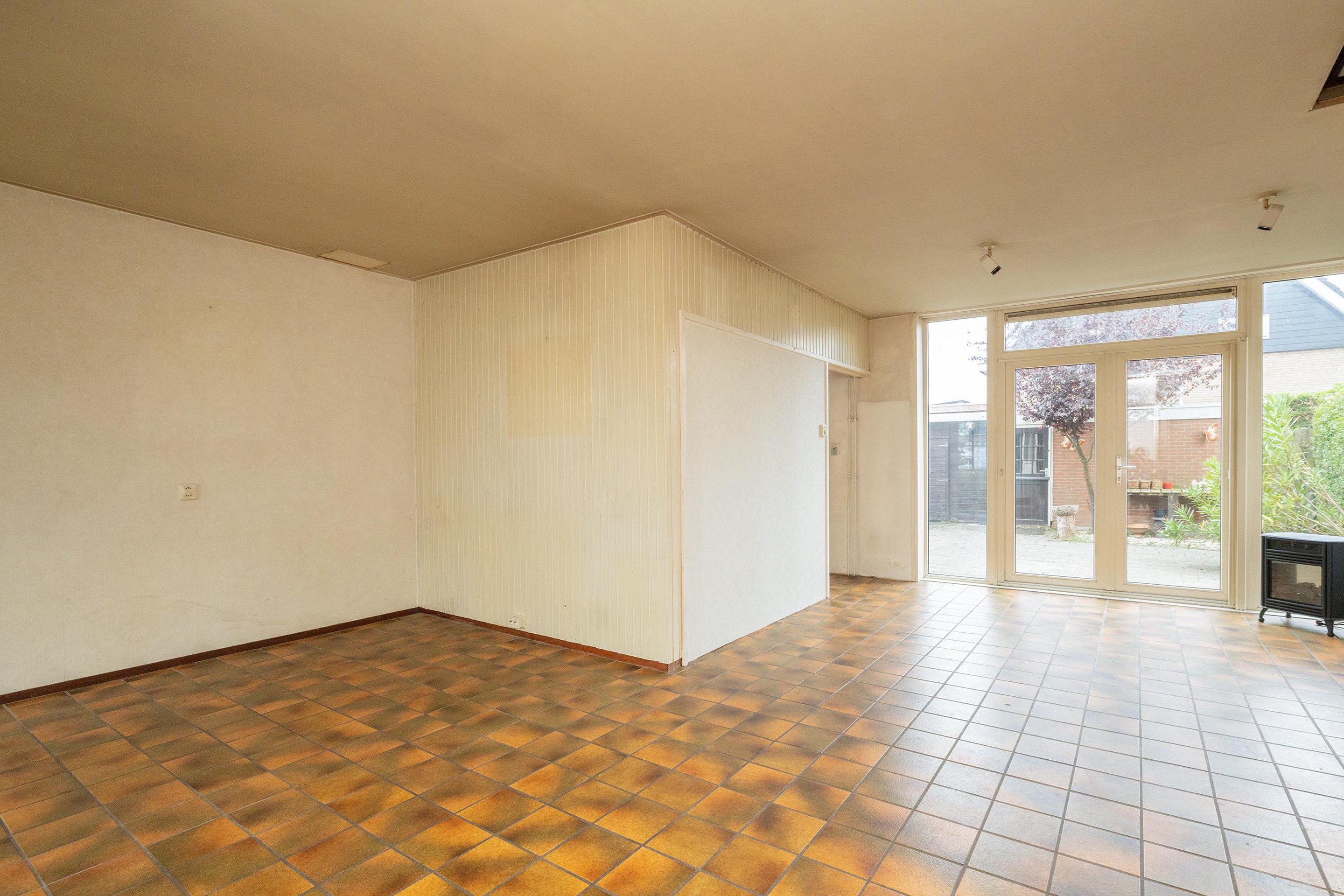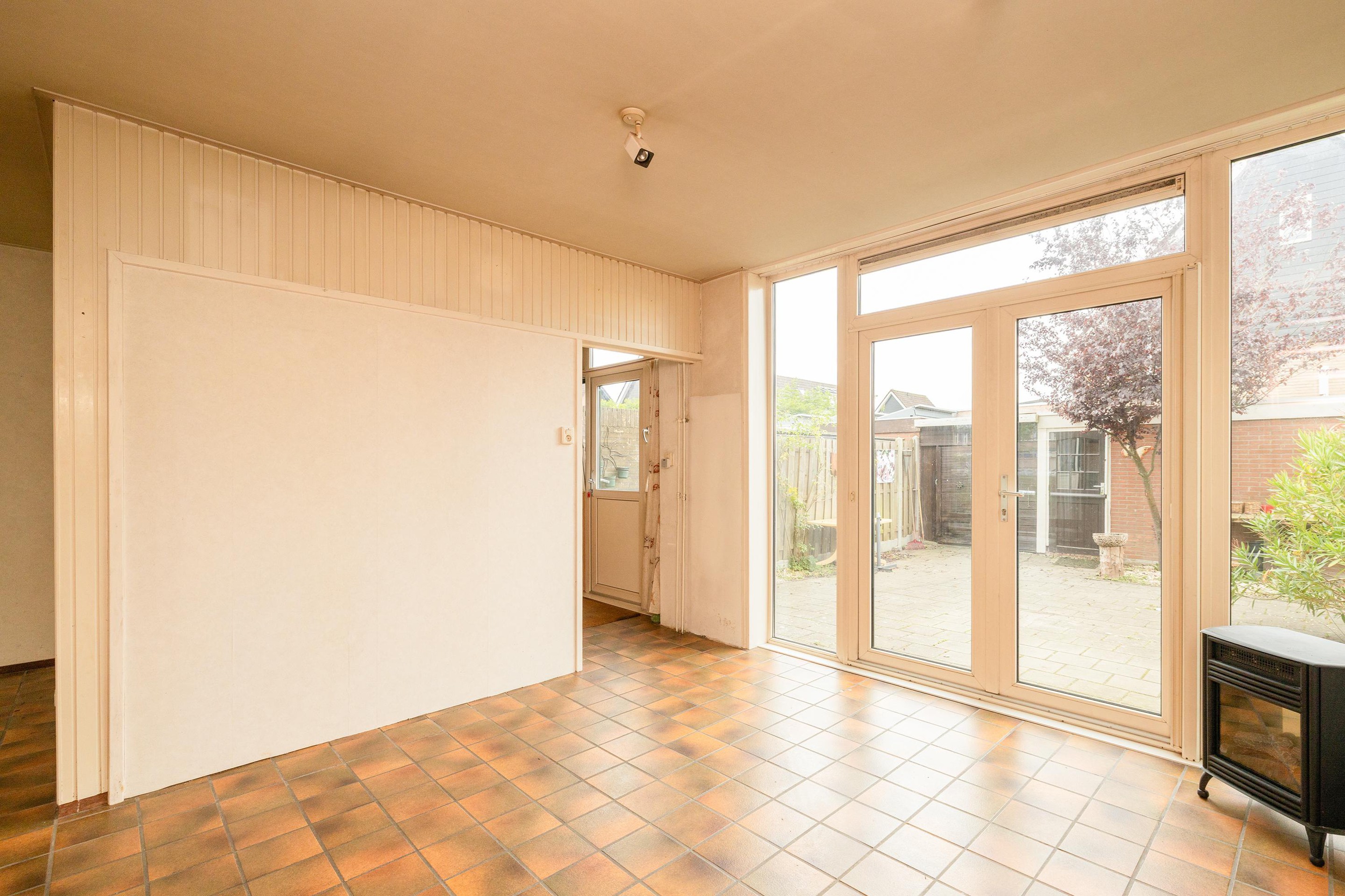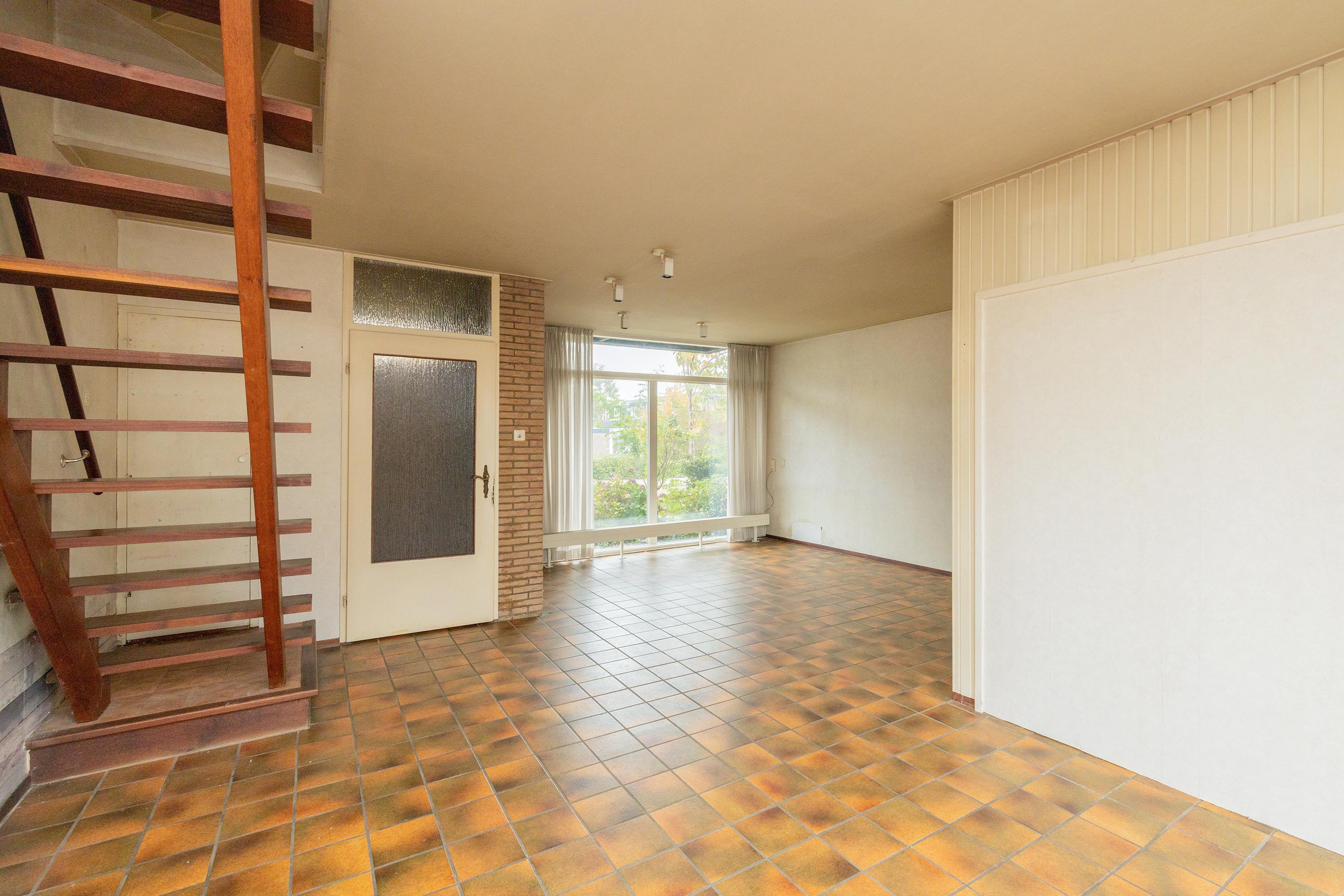 De plavuizen vloer loopt vanuit de hal drempelloos door de gehele benedenverdieping. Rechtdoor komen we in de woonkamer. De grote raampartijen zorgen voor lekker veel licht en aan de achterzijde (Westen), bij het eetkamer gedeelte, zijn er dubbele openslaande deuren naar de achtertuin. Bij de hardhouten trap, rechts van de woonkamer, is nog extra kastruimte. Links achterin is de keuken, die voorzien is van een gaskookstel met afzuigkap, een oven en lekker veel kastruimte. Ook hier is een deur naar de tuin.