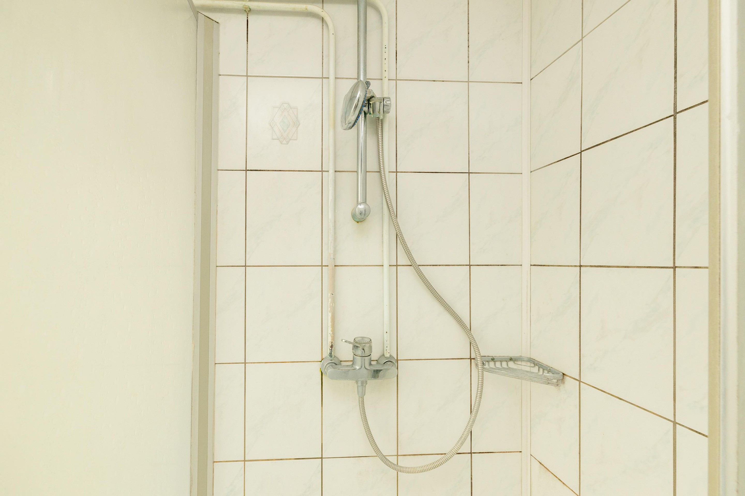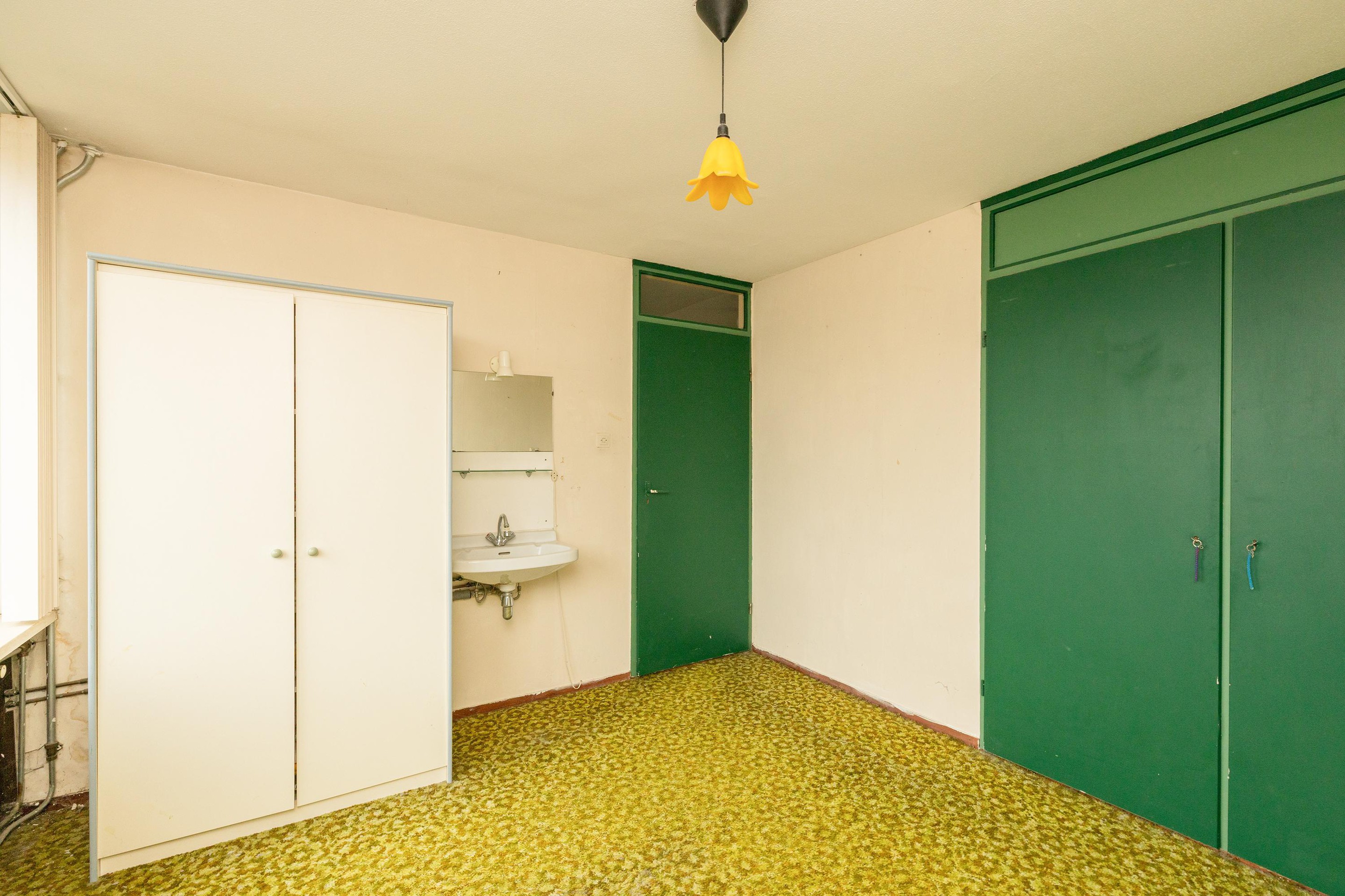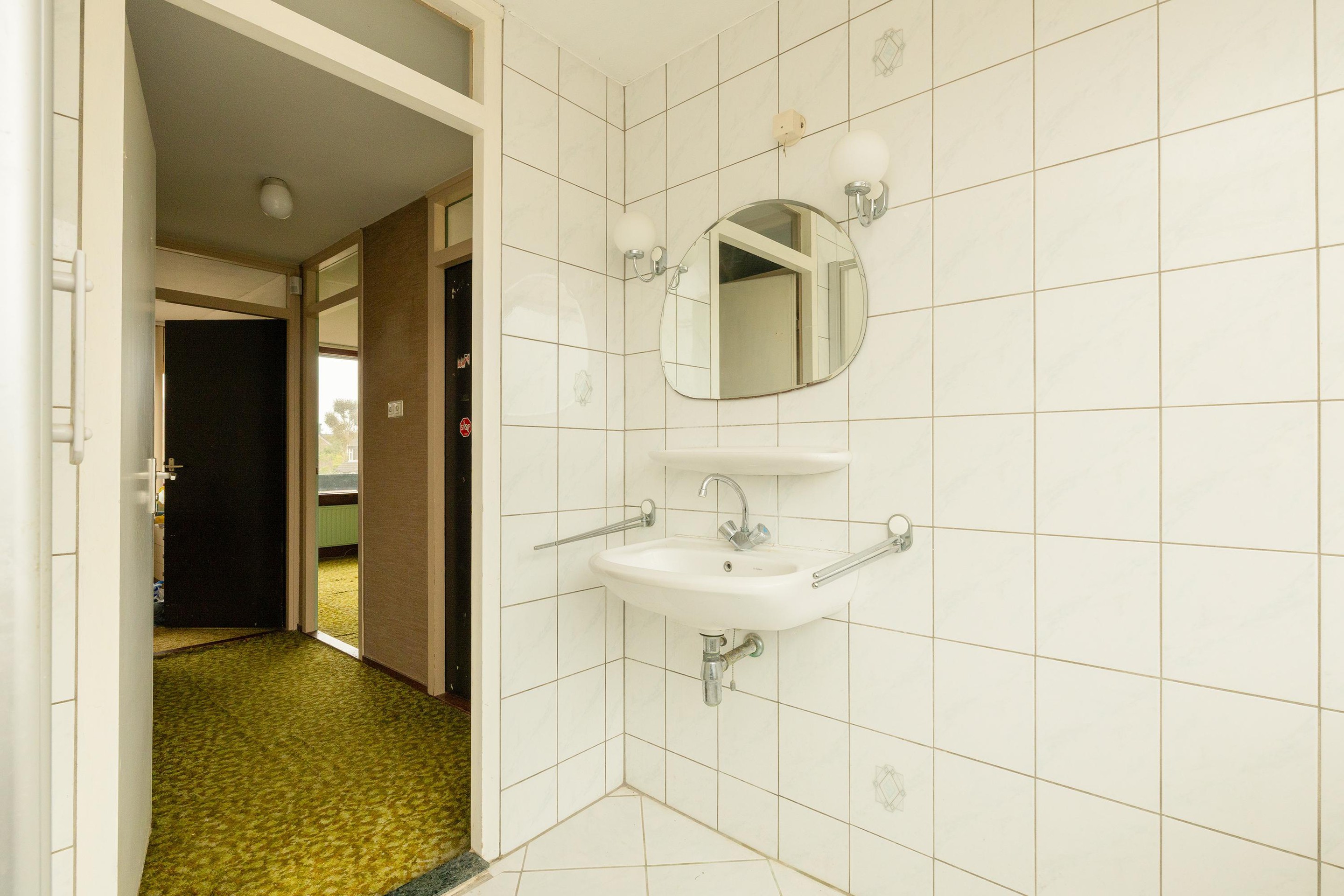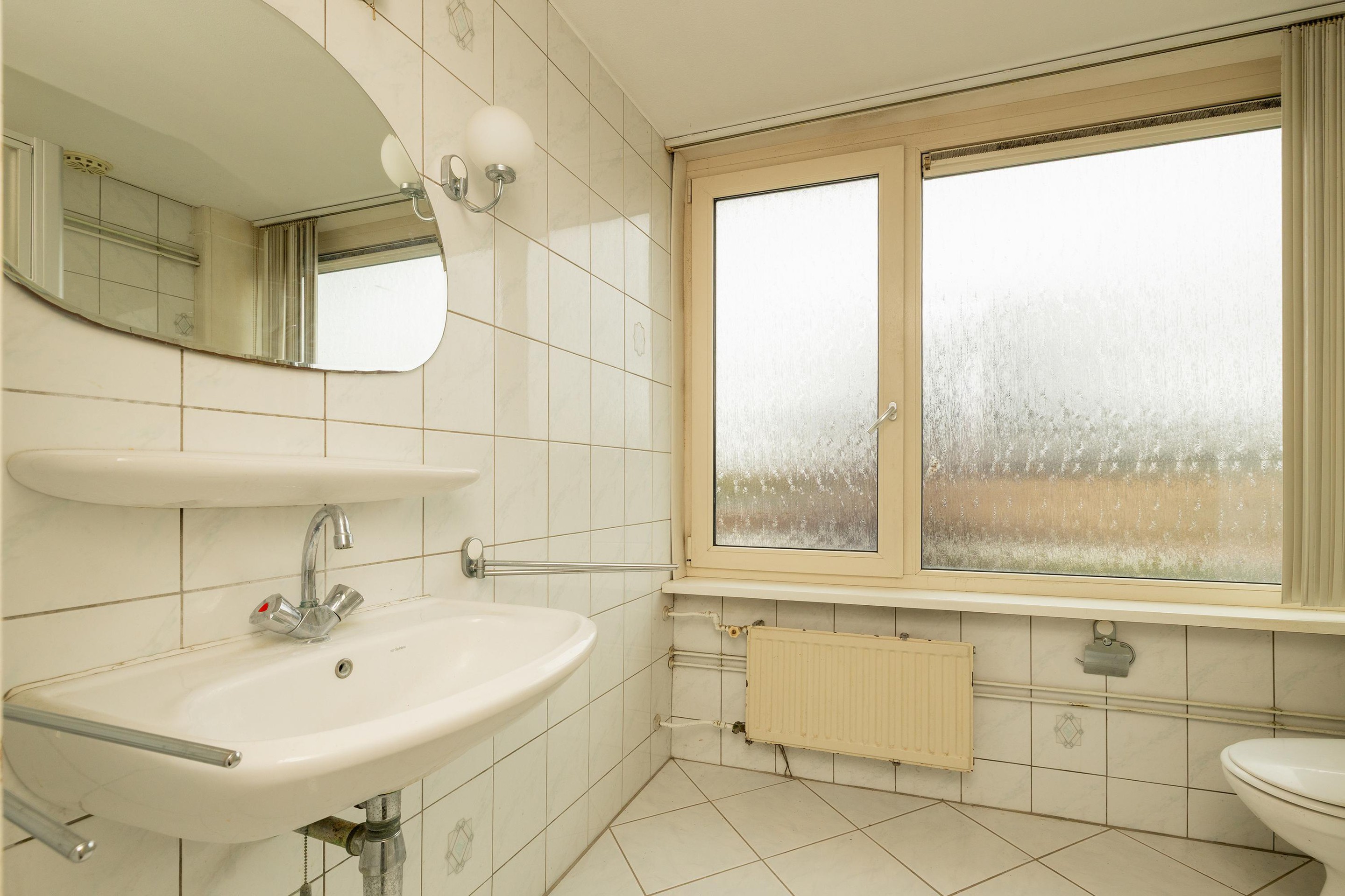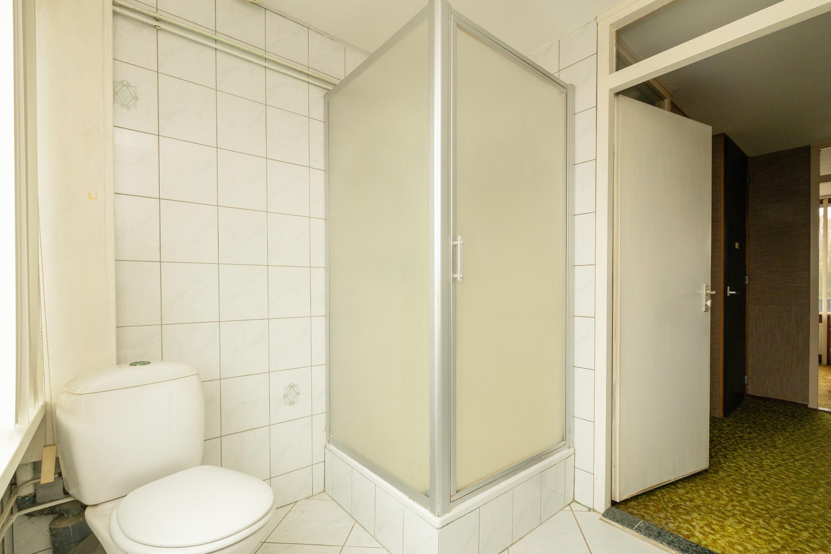 Aan de achterzijde links is de derde slaapkamer. Hier is het andere deel van de vaste kast. Bovendien heeft deze kamer een eigen wastafel. Rechts achterin is de badkamer met een tweede toilet, een separate douchecabine en een wastafel met planchet en spiegel. Ook hier veel licht door de grote ramen.