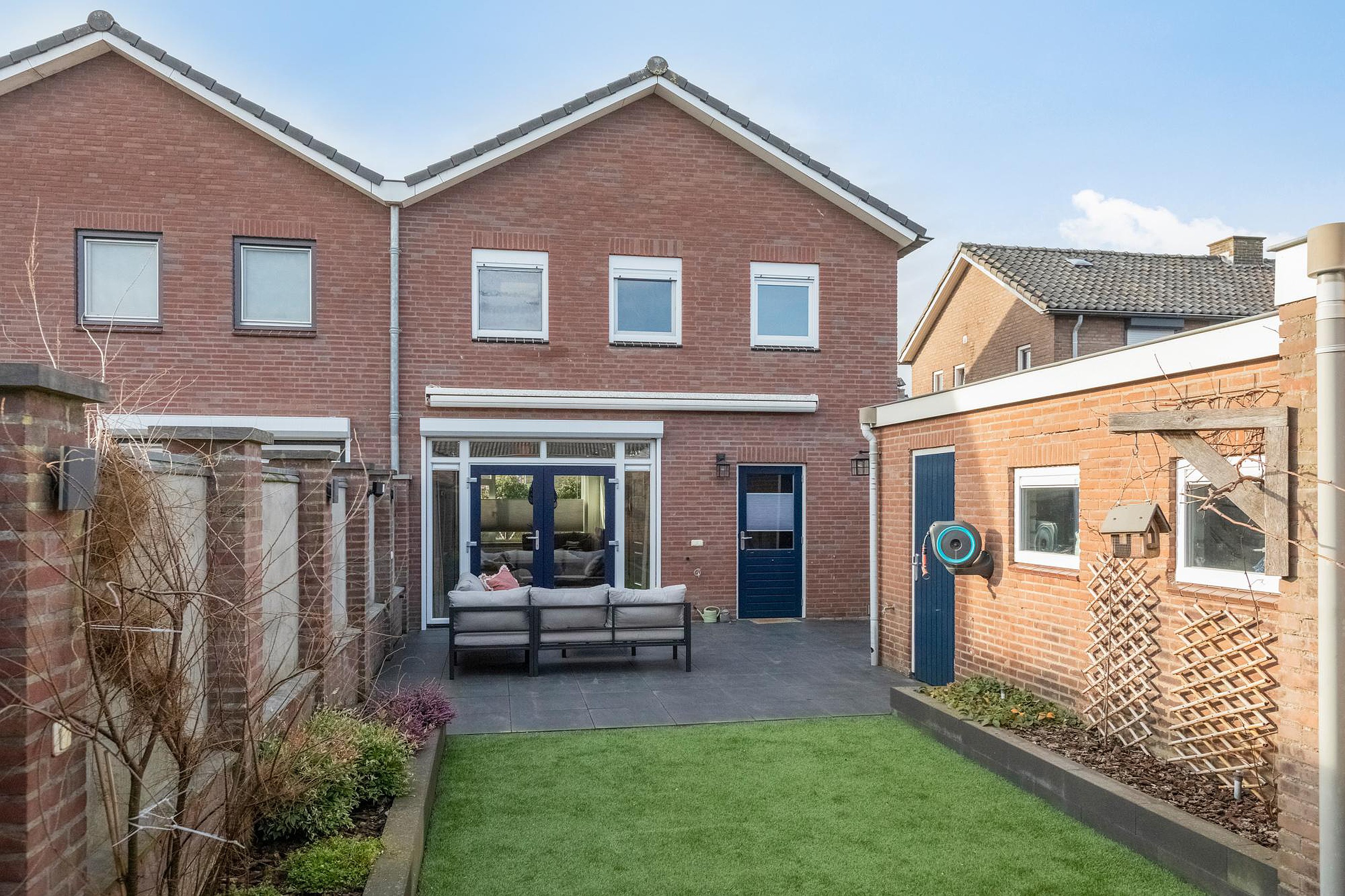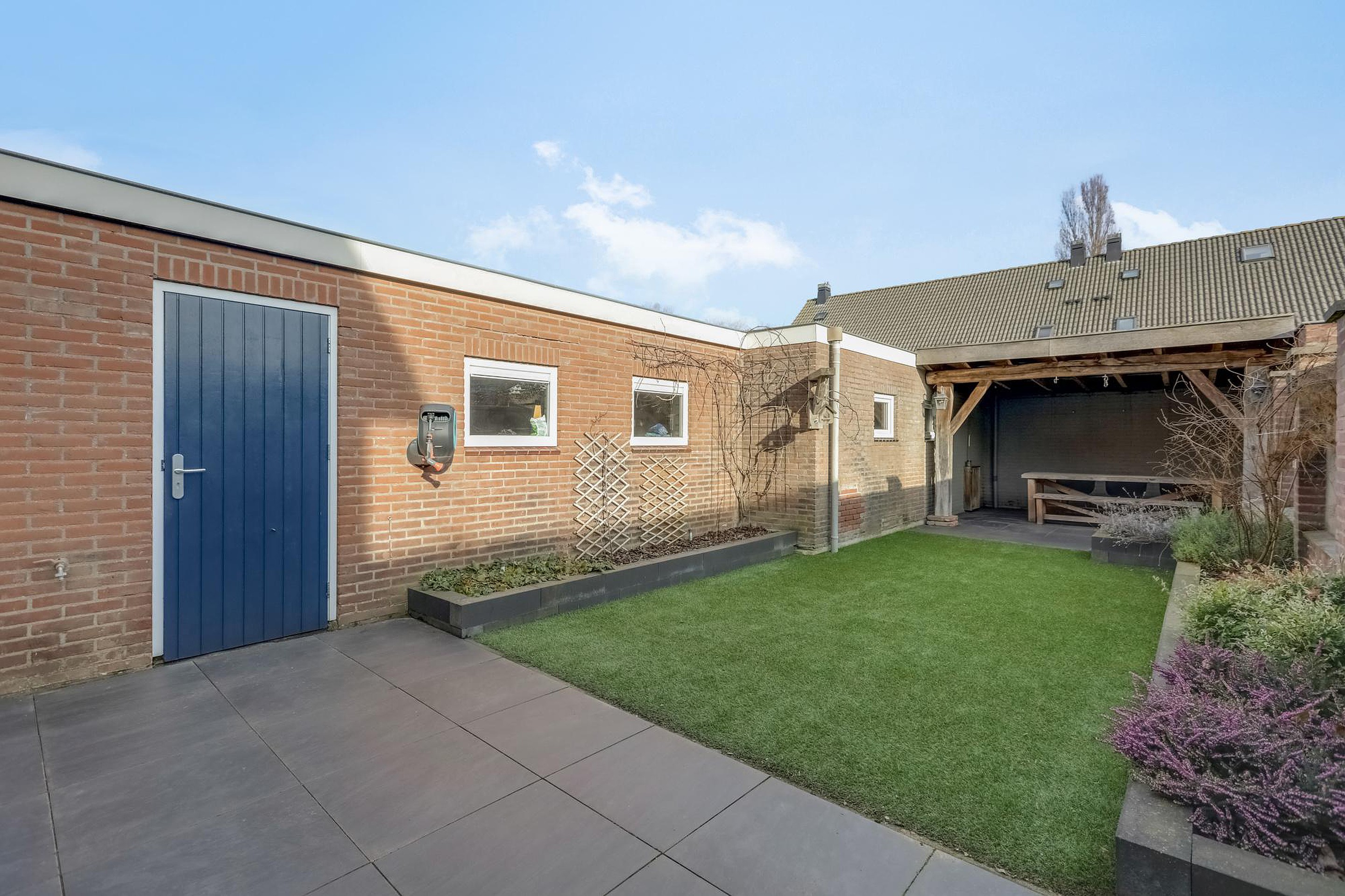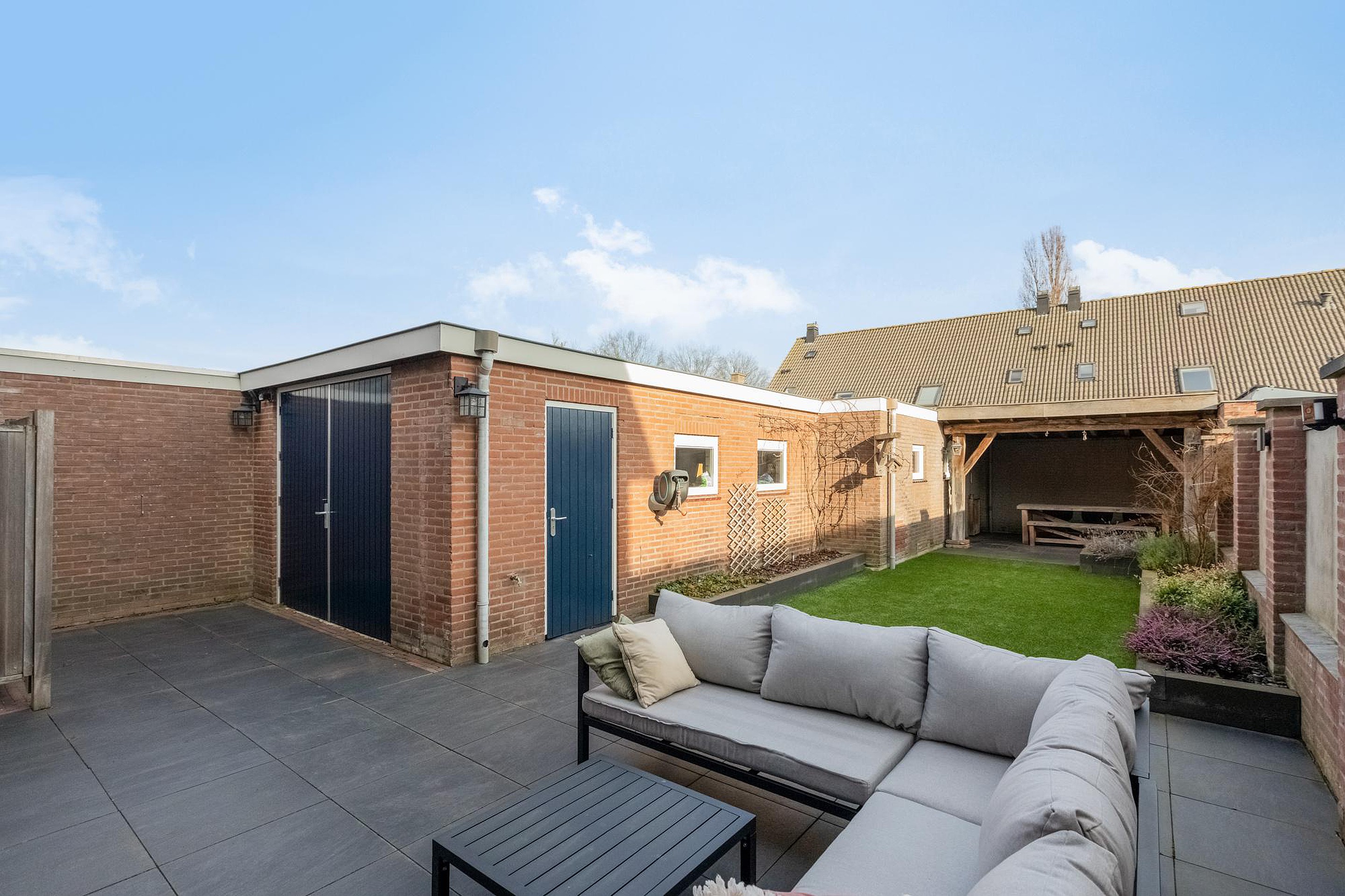 Via een openslaande houten poort is de achtertuin bereikbaar waar zich ook de garage van 53 m2 met een pulspomp bevindt. Deze garage is ideaal als stallingsruimte maar biedt ook volop mogelijkheden als hobby- of werkplaats. De verzorgde achtertuin ligt op het oosten en beschikt over een overkapping, kunstgras, borders met beplanting en een ruim terras dat zich uitstrekt bij de openslaande tuindeuren van de woonkamer. De mooie groene voortuin is keurig aangelegd en de inrit biedt voldoende ruimte om eigen auto’s op eigen terrein te parkeren.