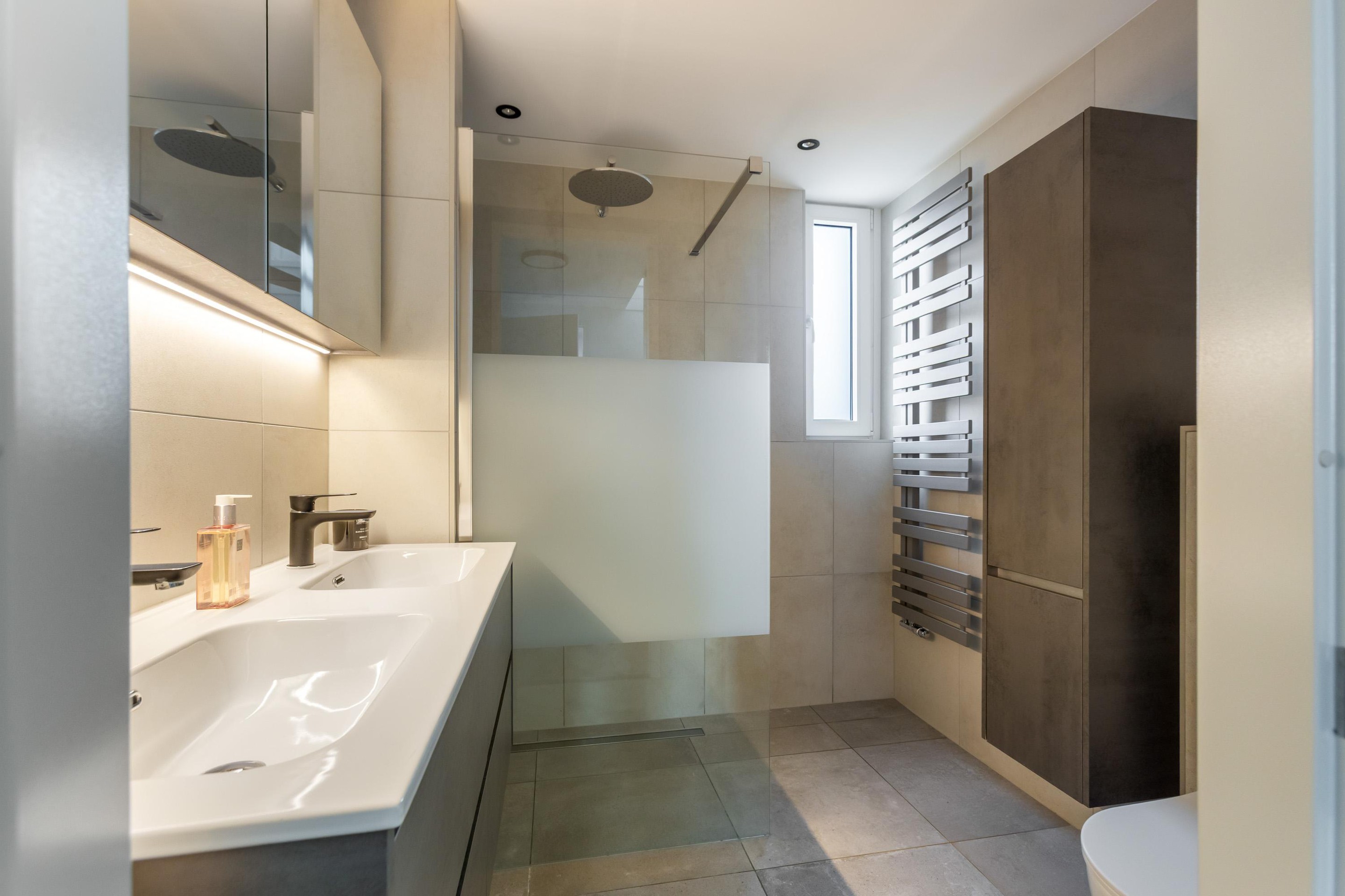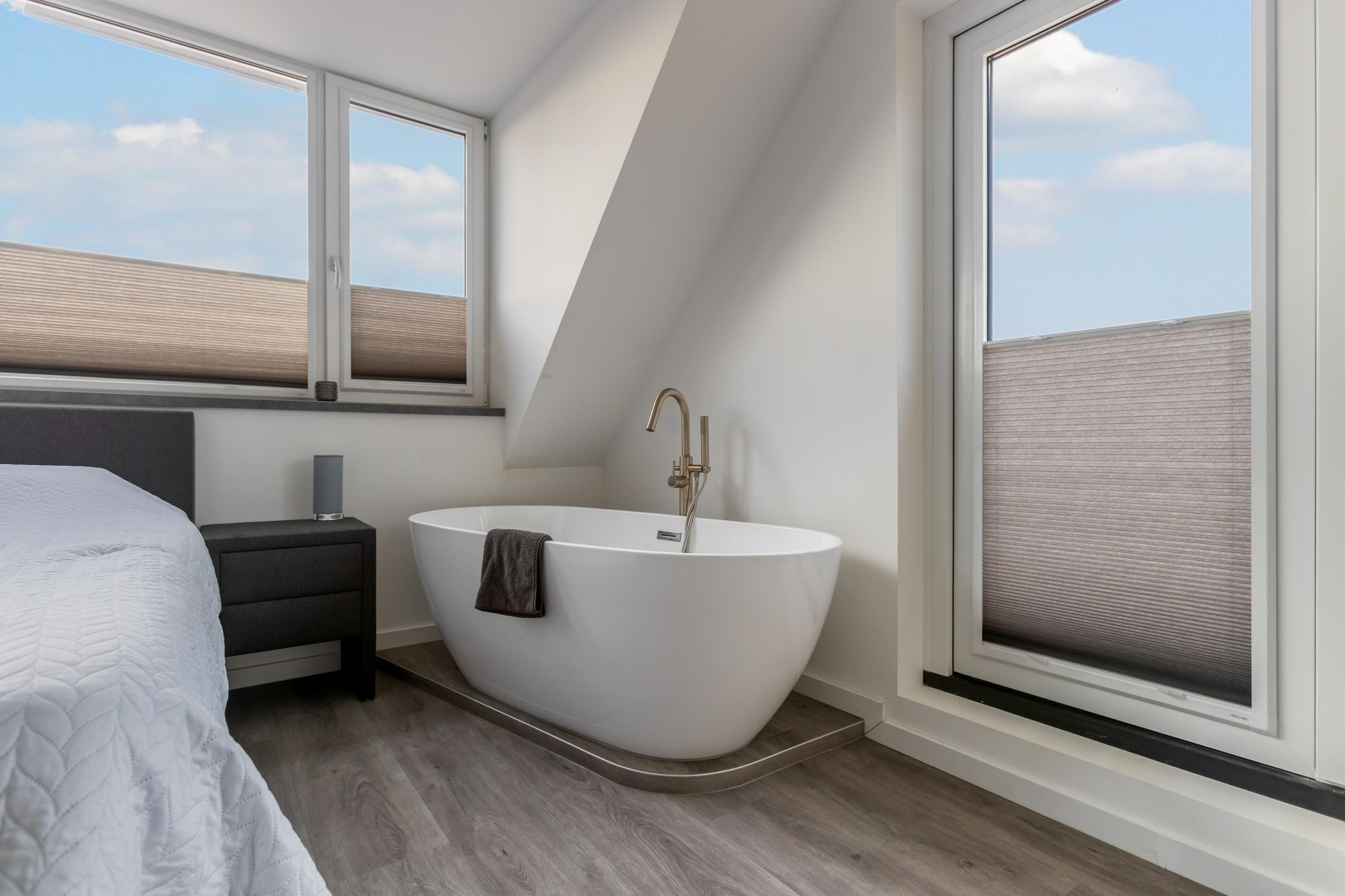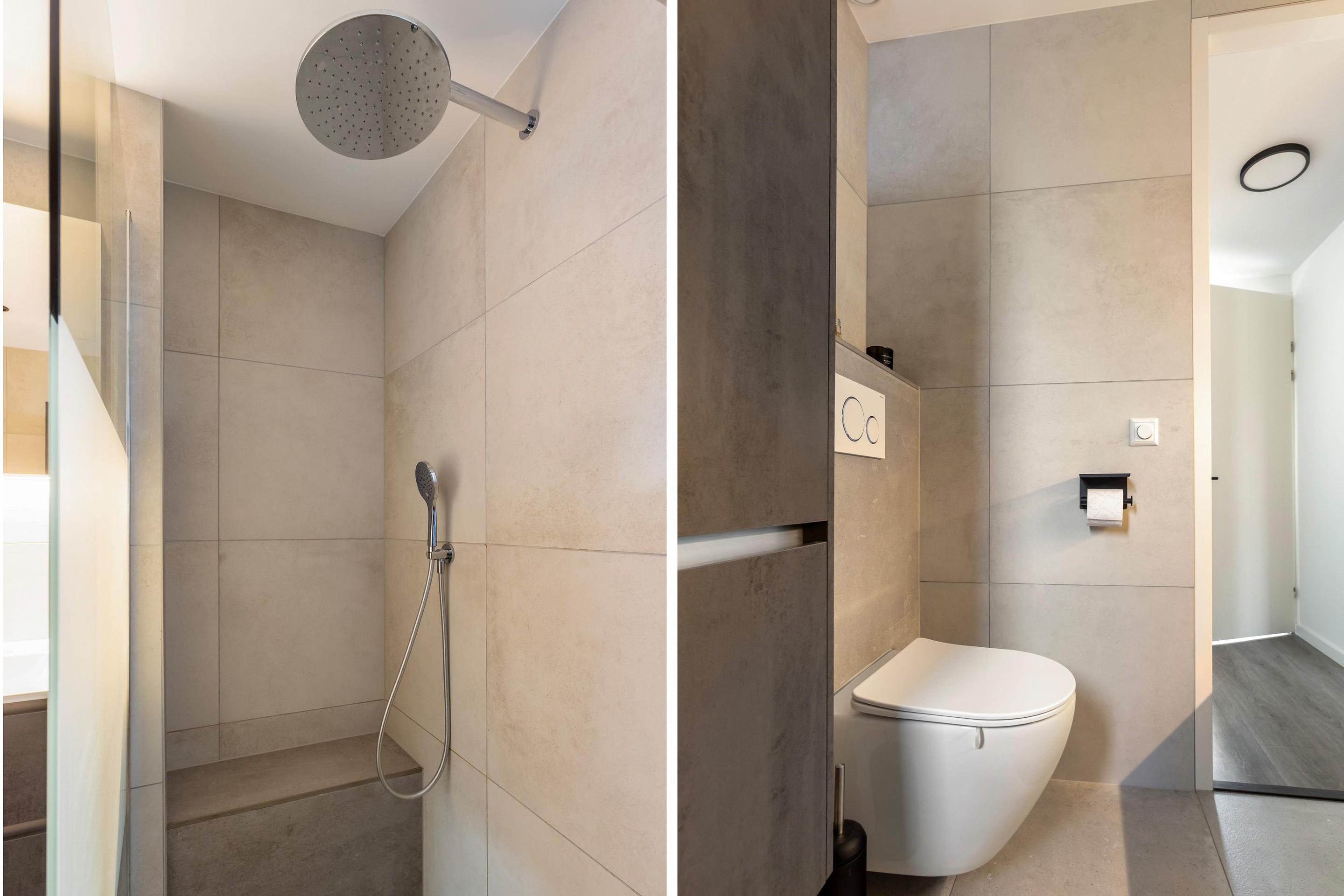 De eerste verdieping telt twee ruime slaapkamers, beide voorzien van een PVC-vloer en airconditioning. De hoofdslaapkamer aan de achterzijde beschikt bovendien over een stijlvol bad en biedt toegang tot een riant balkon/terras van circa 17 m2, gesitueerd boven de aangebouwde garage – een heerlijke plek om in alle privacy van de zon te genieten. De moderne badkamer is smaakvol afgewerkt en voorzien van een inloopdouche, dubbele wastafel met verwarmde en verlichte spiegel en een tweede toilet.