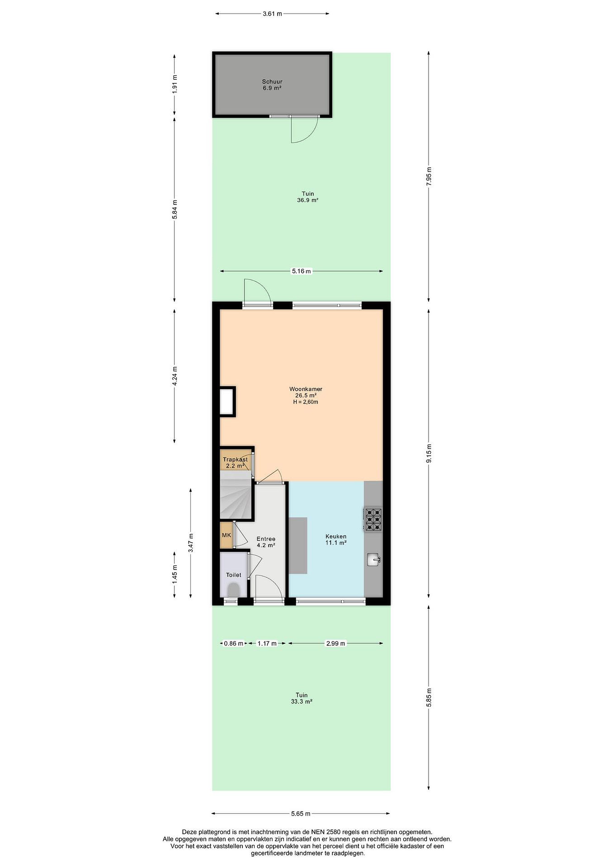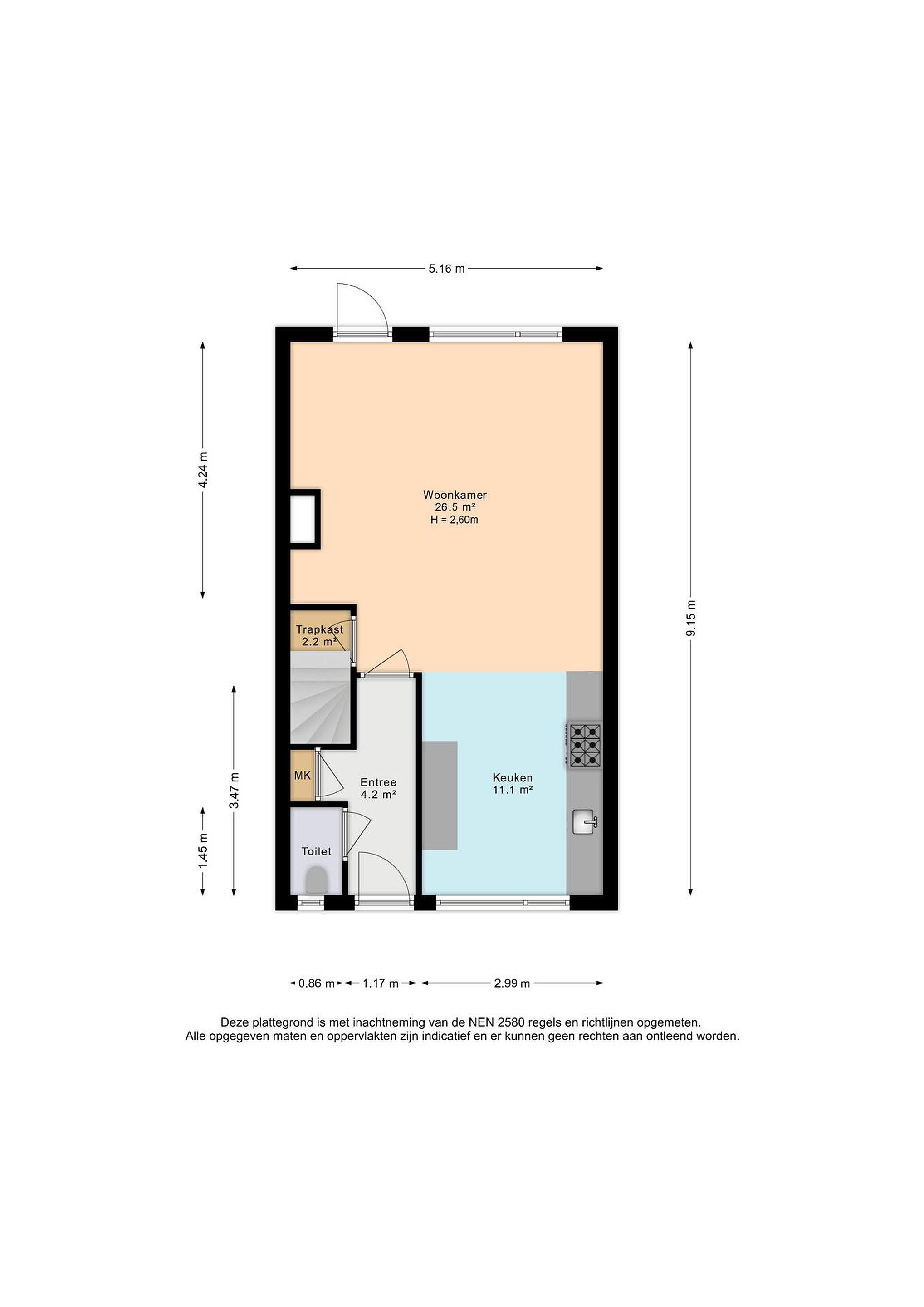 Bovenstaande informatie is door ons met de hoogst nodige zorgvuldigheid samengesteld. Door ons wordt echter geen enkele aansprakelijkheid aanvaard voor enige onvolledigheid, onjuistheid of anderszins, dan wel de gevolgen daarvan. Alle opgegeven maten en oppervlakten zijn indicatief. De woning is gemeten met gebruikmaking van de Meetinstructie, die is gebaseerd op de normen zoals vastgelegd in NEN 2580. De Meetinstructie is bedoeld om een meer eenduidige manier van meten toe te passen voor het geven van een indicatie van gebruiksoppervlakte. De Meetinstructie sluit verschillen in meetuitkomsten niet volledig uit, door bijvoorbeeld interpretatieverschillen, afrondingen of beperkingen bij het uitvoeren van de meting. Hoewel wij de woning zorgvuldig hebben opgemeten, wordt noch door ons kantoor, noch door de verkoper enige aansprakelijkheid aanvaard voor afwijkingen in de opgegeven maten. Koper wordt in de gelegenheid gesteld om de opgegeven maten te (laten) controleren.