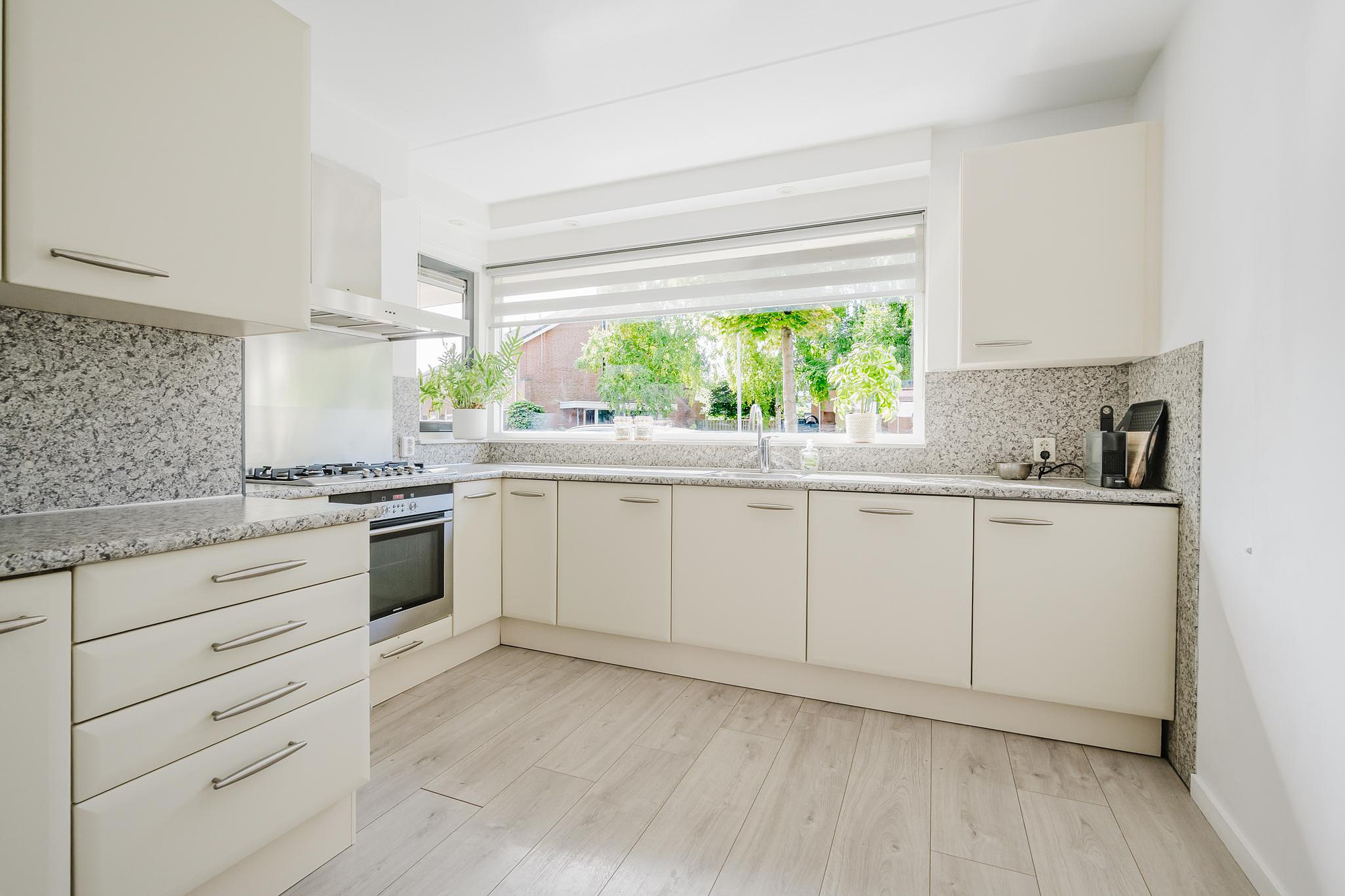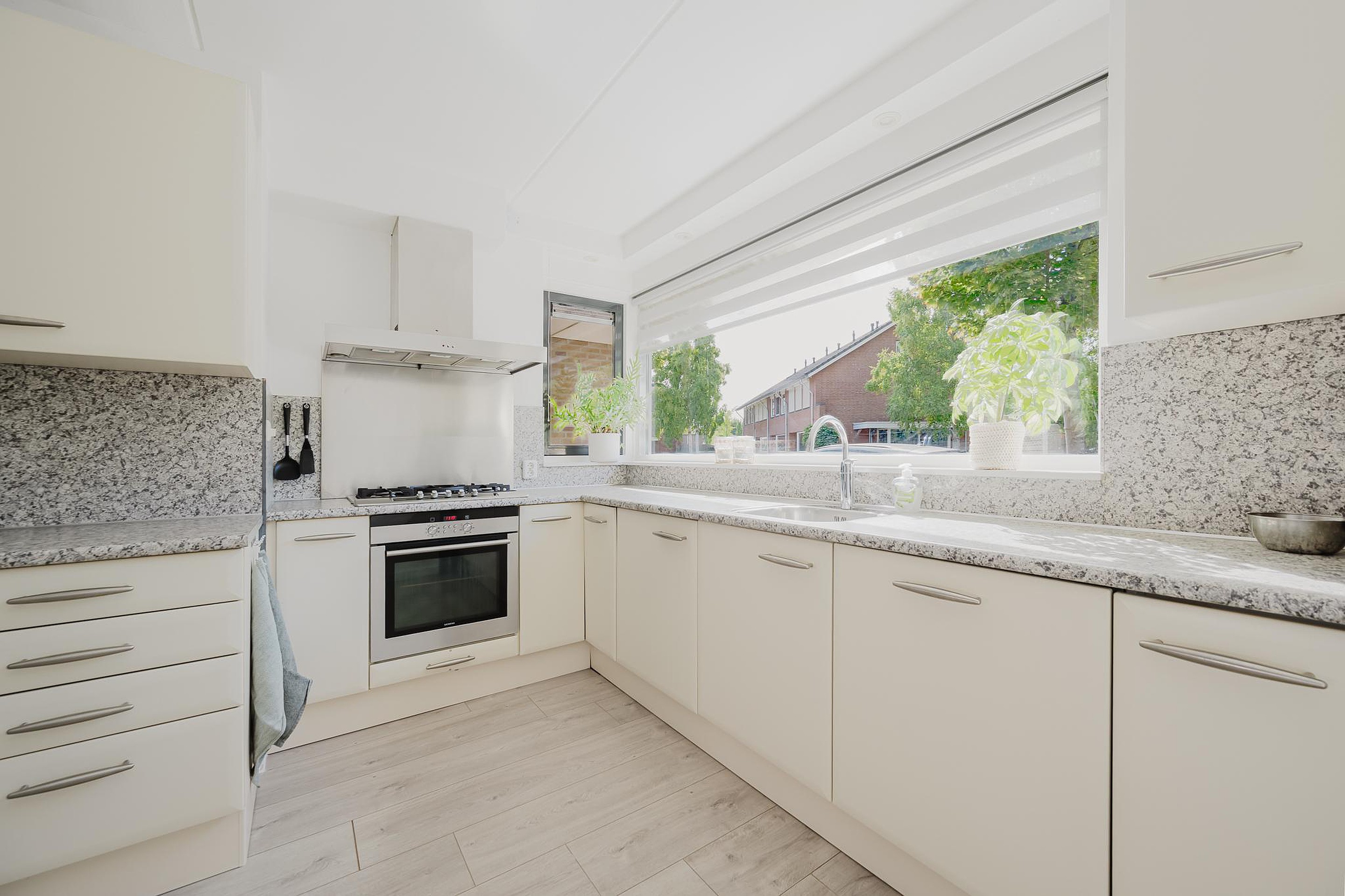 Aan de voorzijde van de woning bevindt zich de ruime open keuken welke is voorzien van een kunststof blad met veel opbergruimte, twee koelkasten, een vriezer, een Miele vaatwasser (2024) en is voorzien van een 5-pits gaskookplaat, een oven en een losse magnetron.