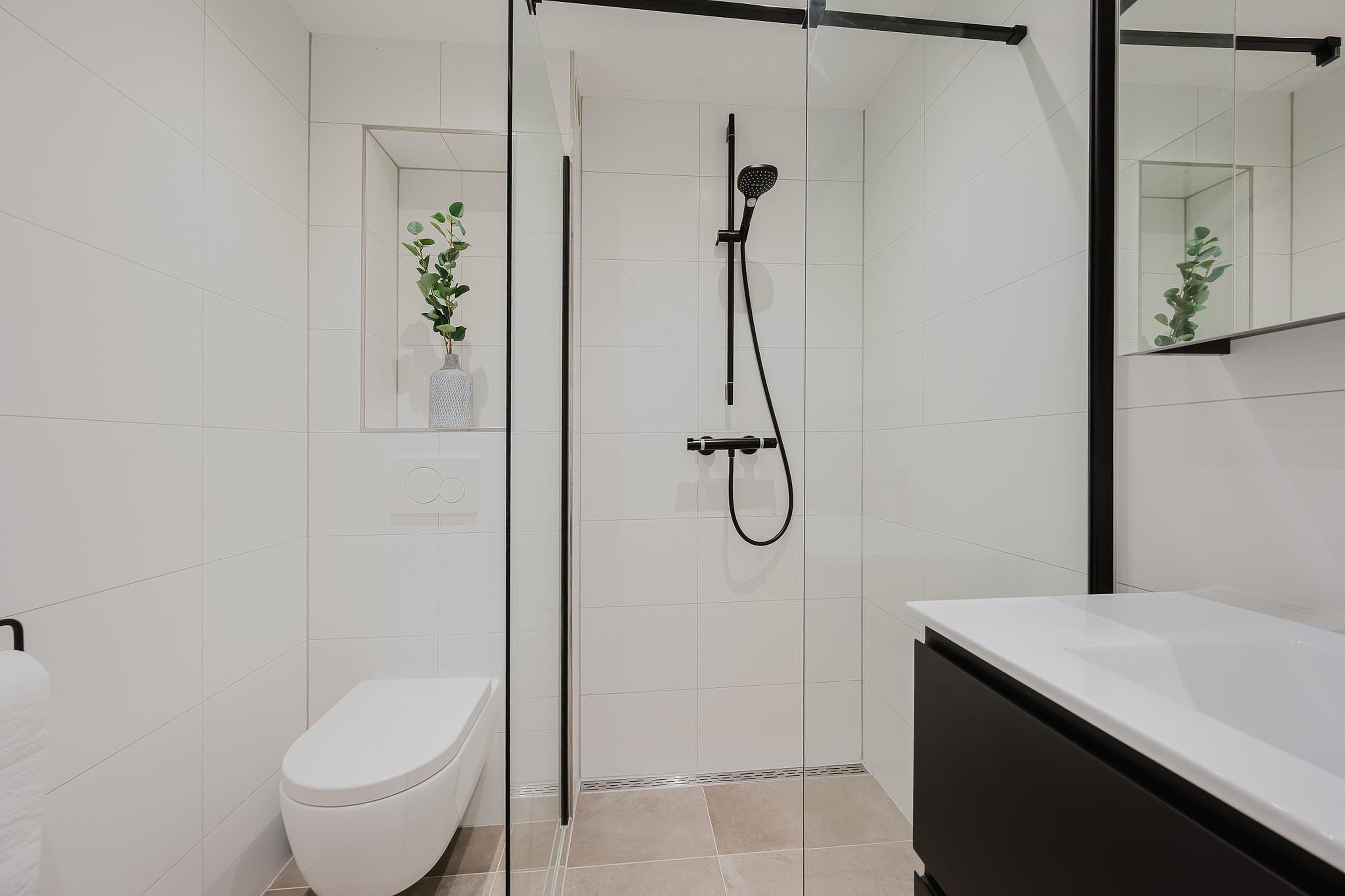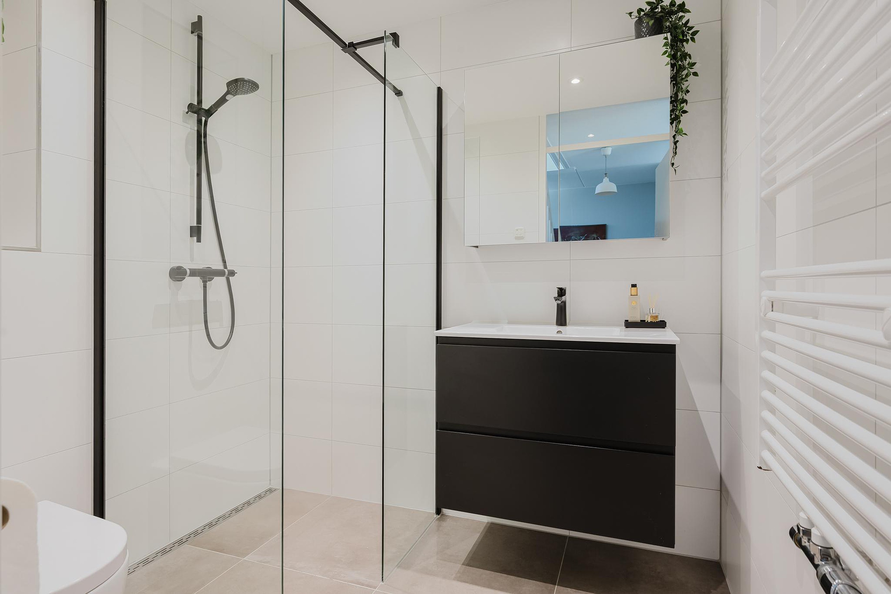 De badkamer is in 2021 volledig gerenoveerd en is voorzien van een tijdloze en sfeervolle afwerking. De badkamer is volledig betegeld, heeft een ruime inloopdouche, een hangend toilet en is voorzien van een hangende wastafel- met meubel en een spiegelkast.