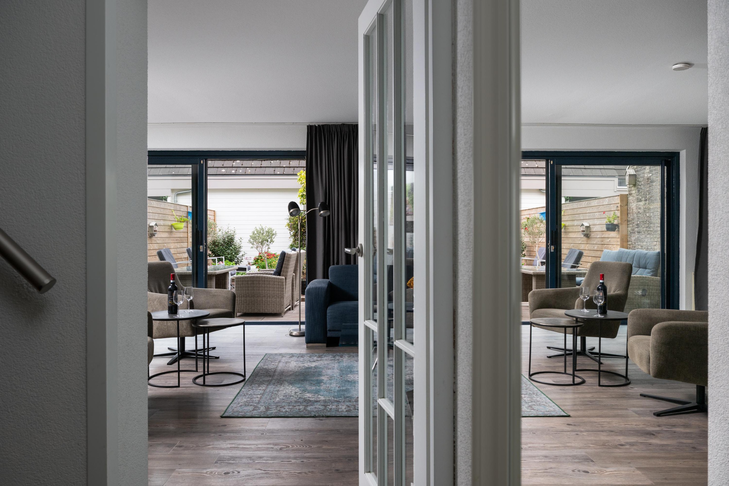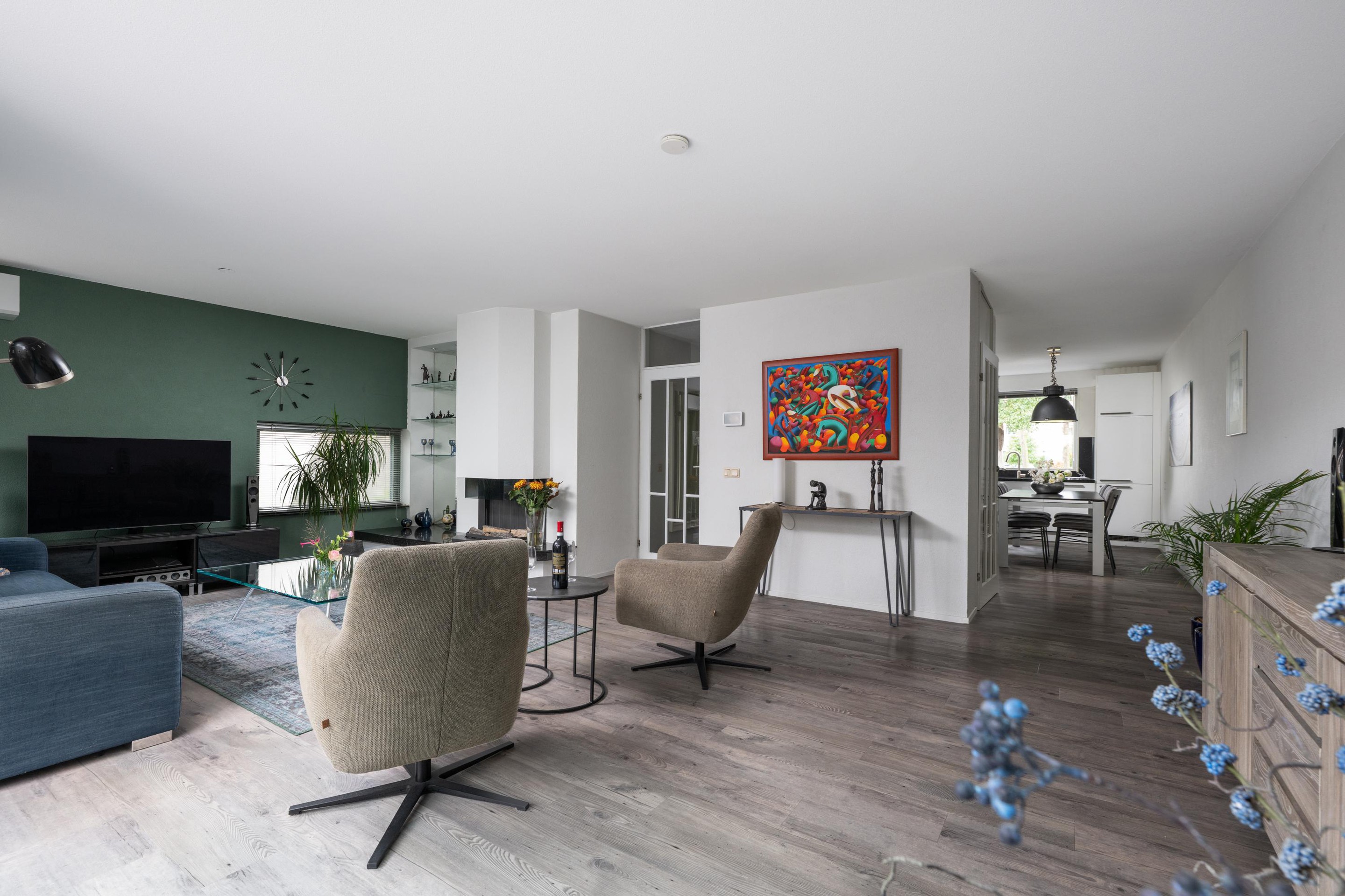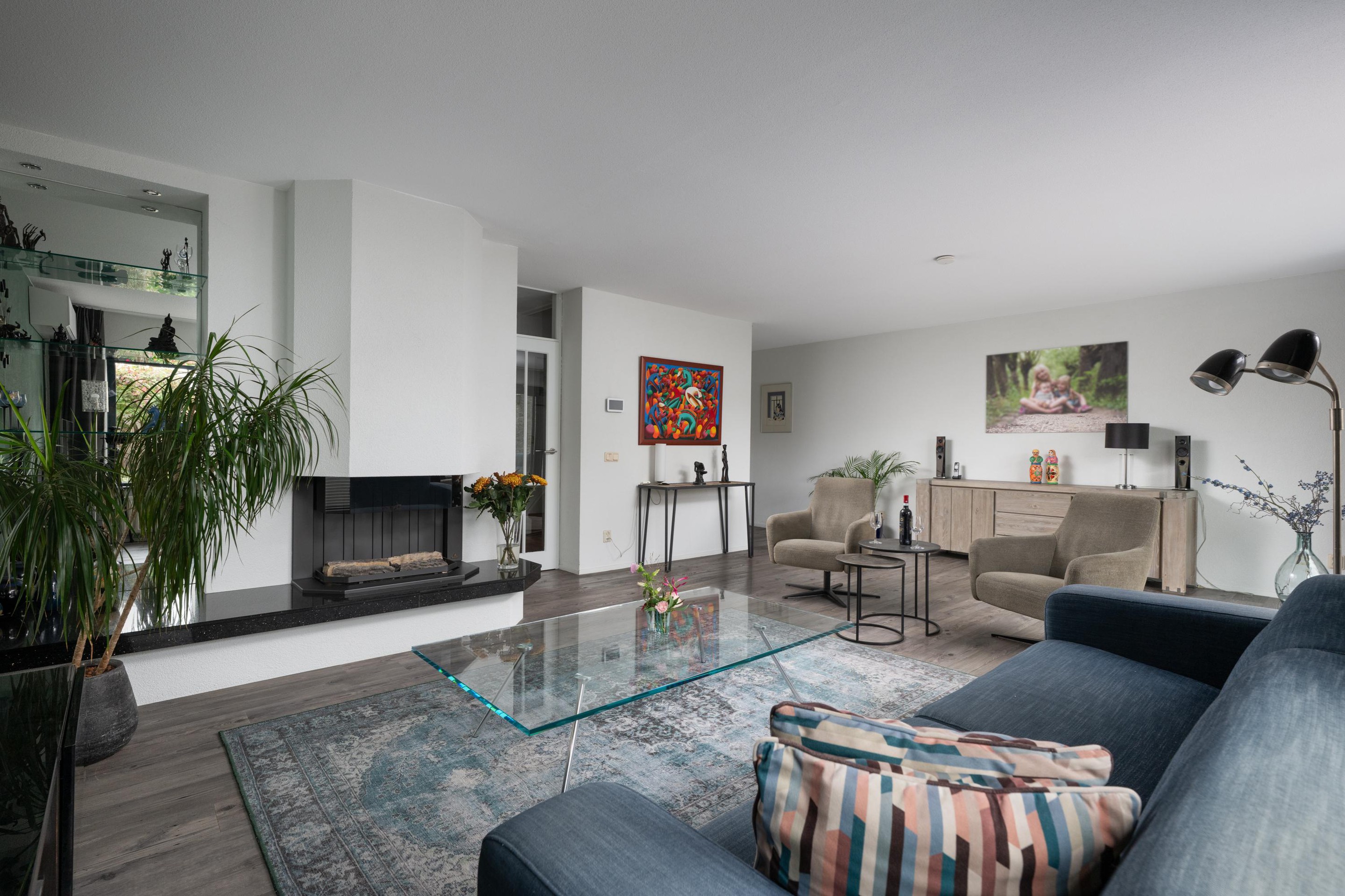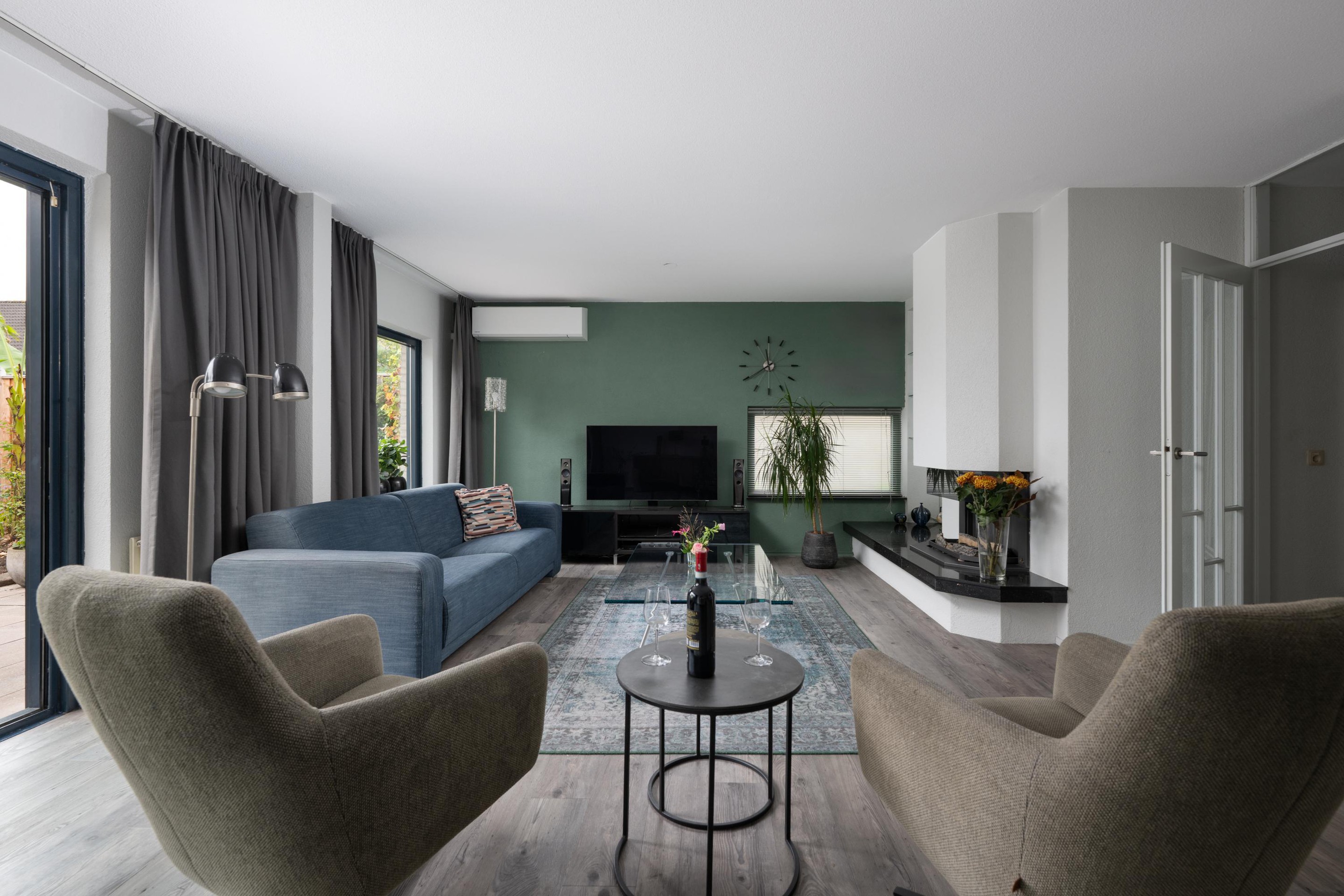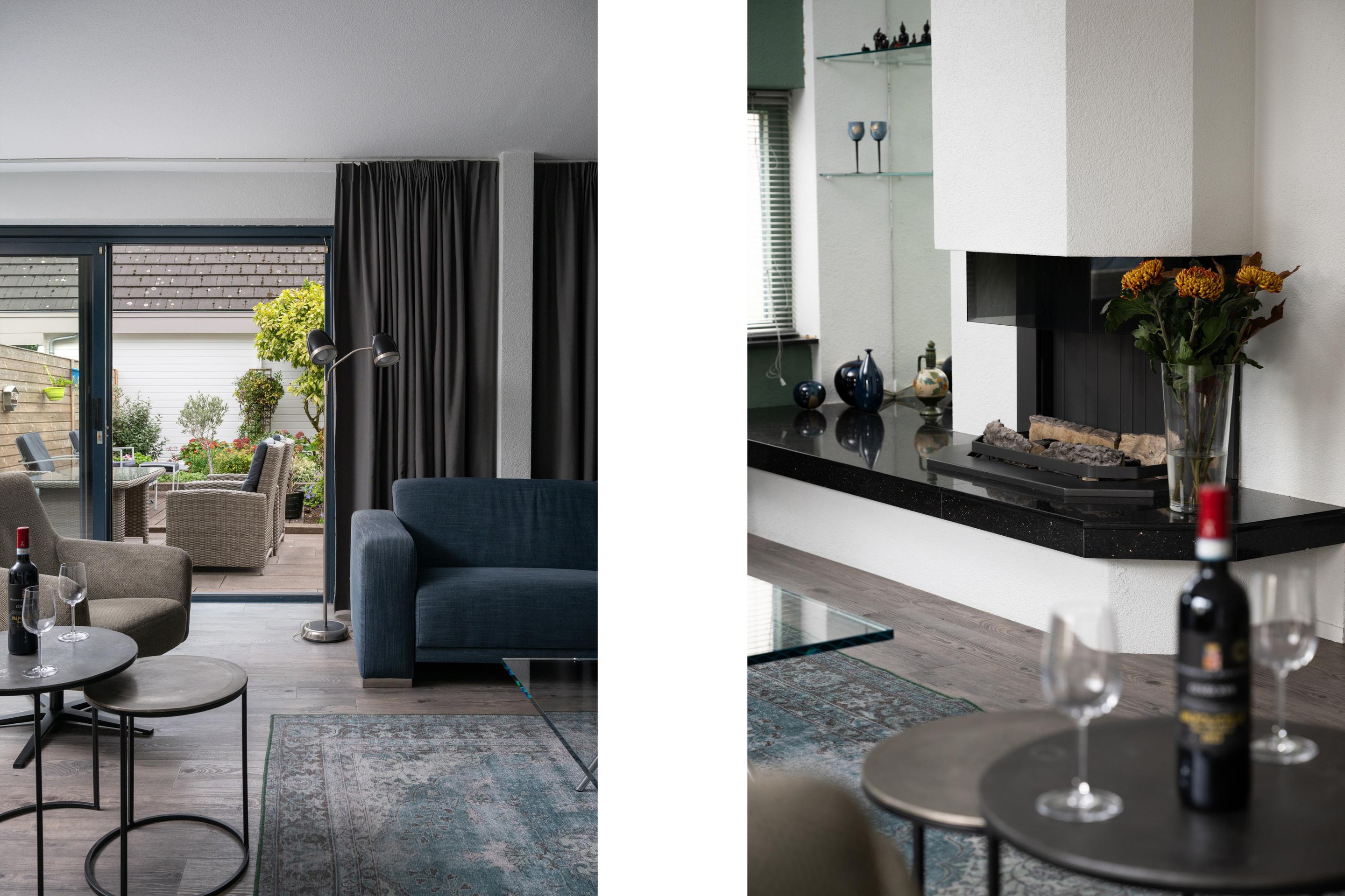 De ruime woonkamer is licht en sfeervol dankzij de grote raampartijen, de gashaard en de vloerverwarming. In 2021 is er een airco geplaatst die kan koelen én verwarmen en de schuifpui zorgt hier voor een fijne lichtinval.