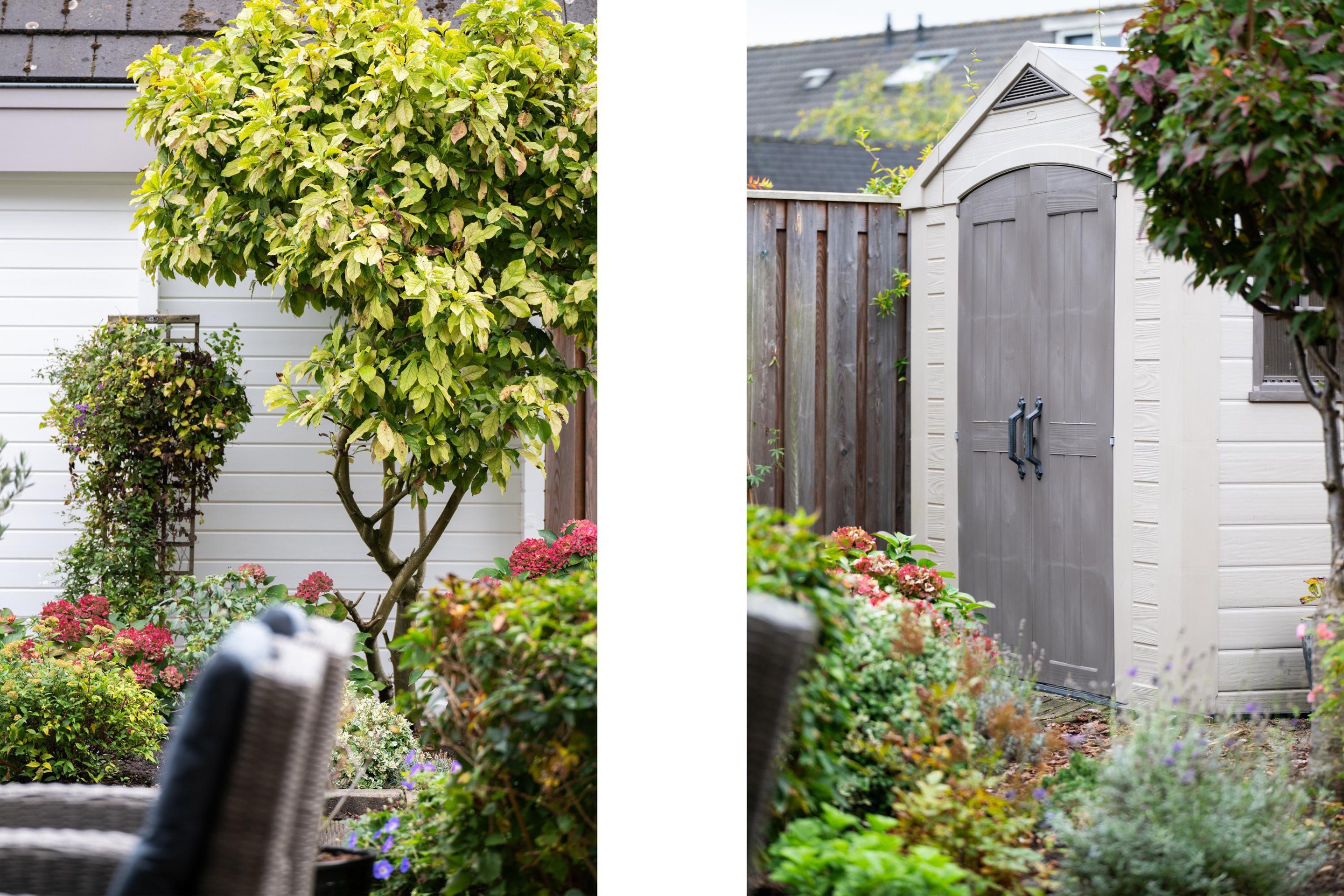 Vanuit de woonkamer loop je zo de tuin op het zuidwesten in, een fijne, zonnige plek met veel privacy. De tuin loopt deels rondom de woning, heeft een zonnescherm en een doorgang naar de voortuin.