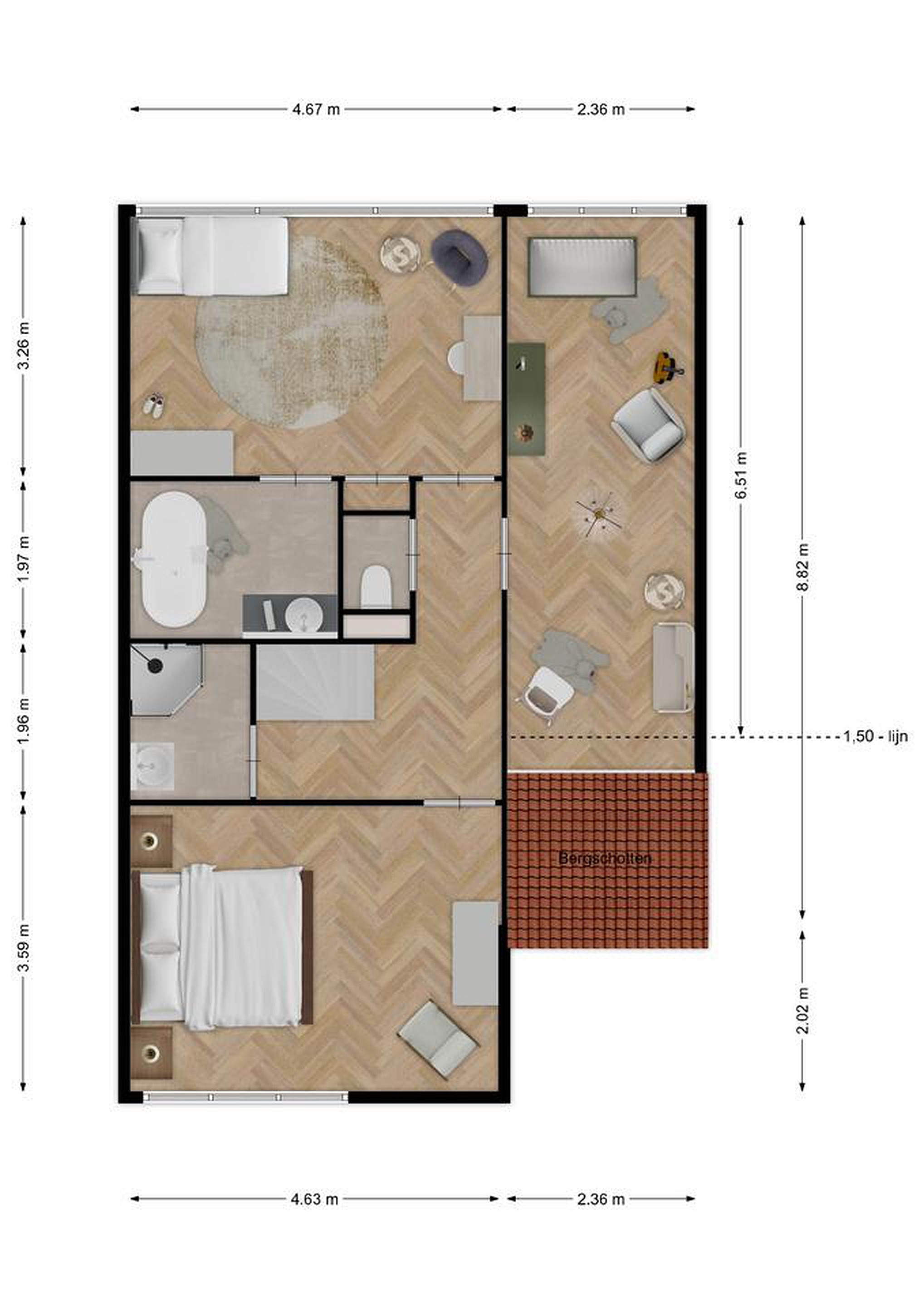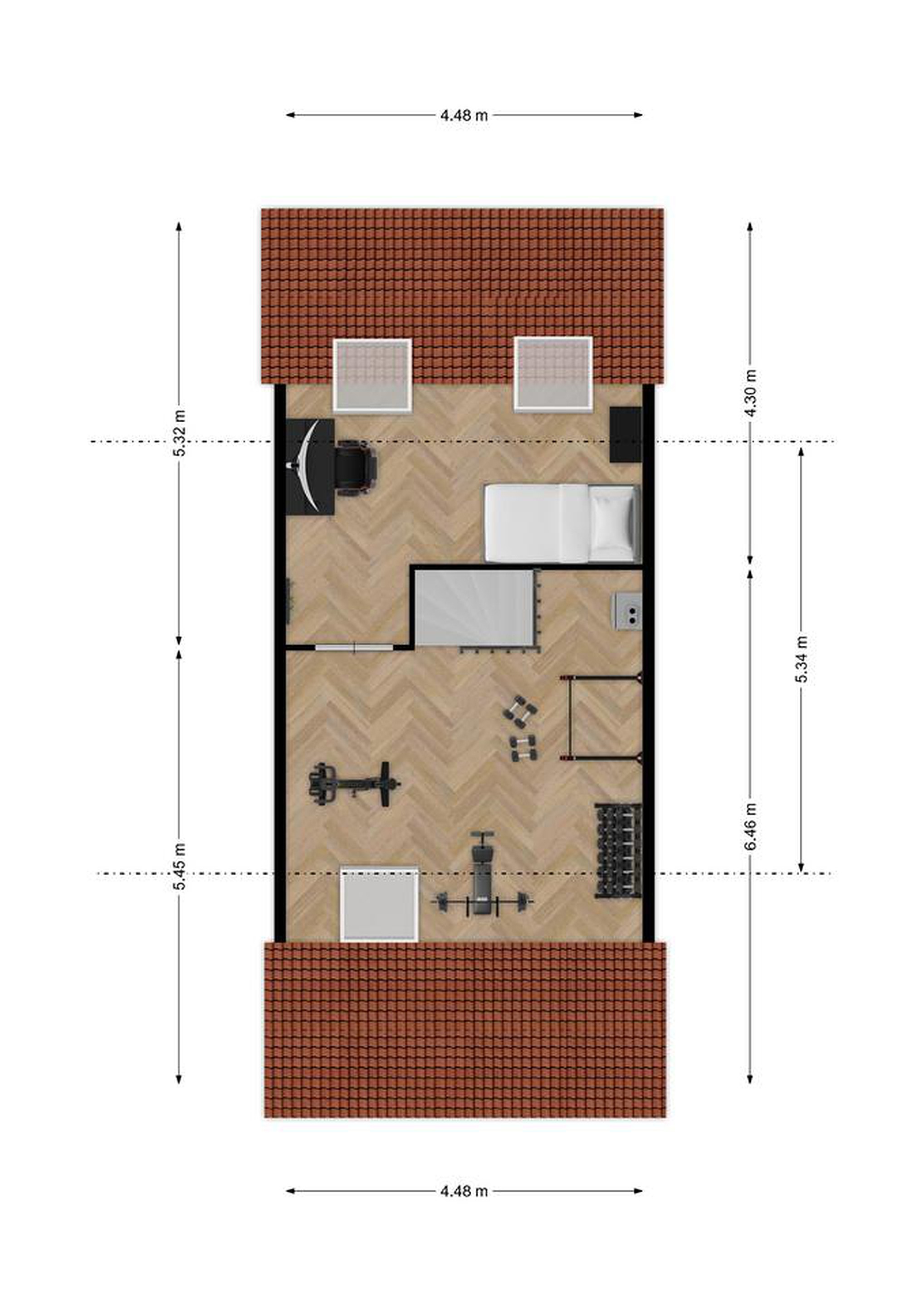 Op de tweede verdieping vind je de vierde slaapkamer met dakramen en bergschotten voor extra opbergruimte. Hier bevinden zich ook de cv-installatie en de aansluitingen voor wasmachine.