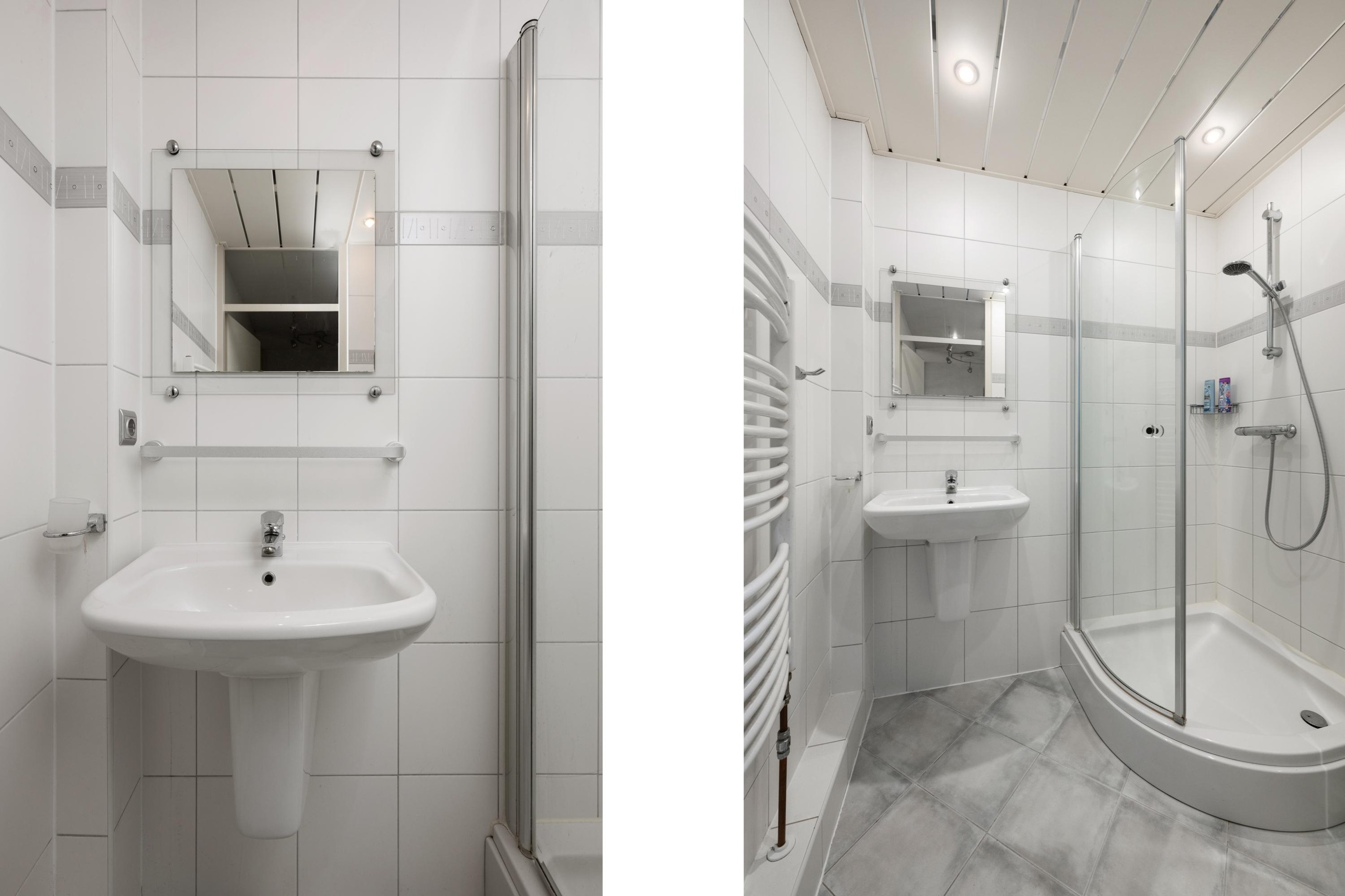 De master bedroom beschikt over airco en een en suite badkamer met onder andere een ligbad. Daarnaast is er een tweede badkamer met douche, wastafel en radiator, en een separaat toilet op de overloop.