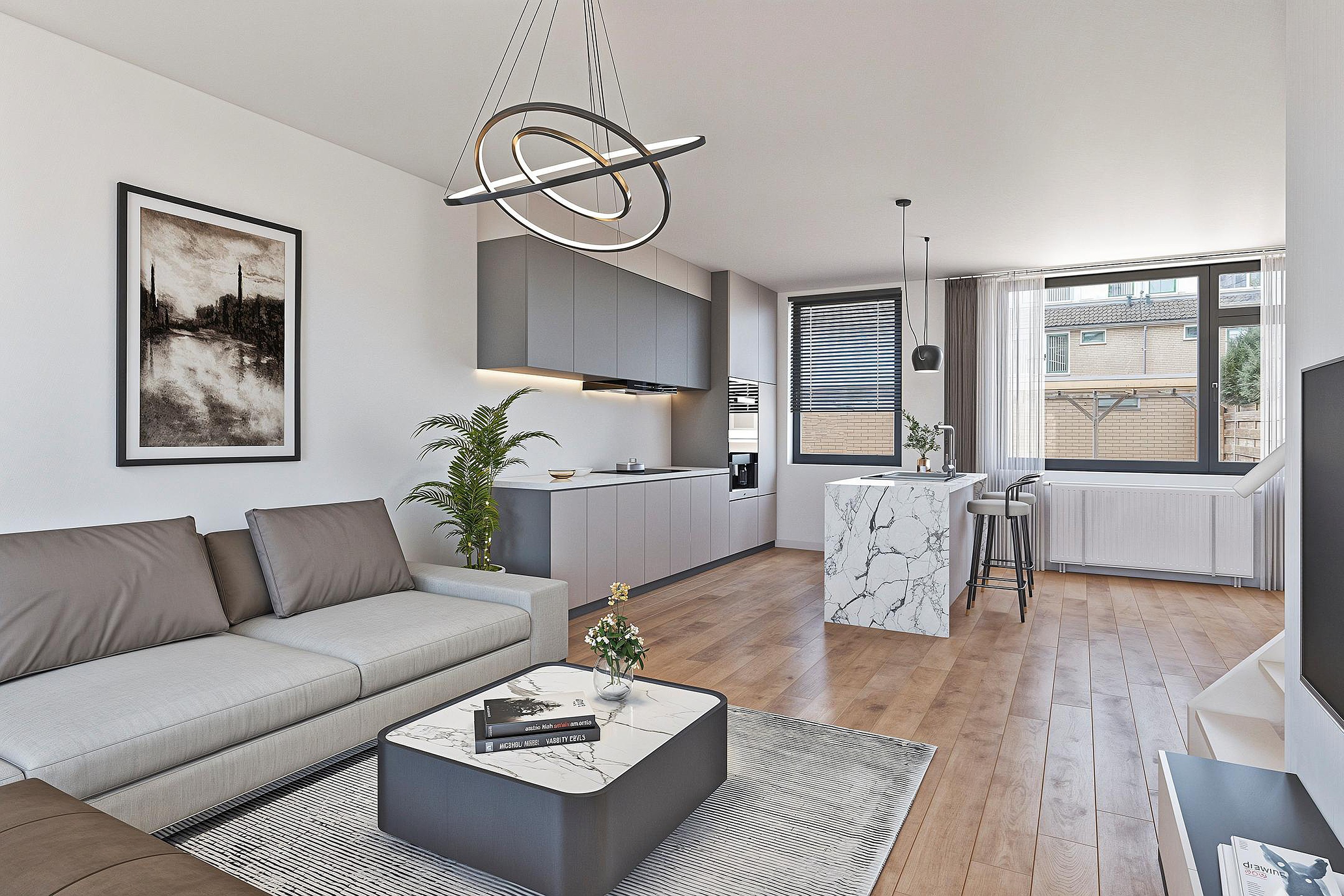 De woonkamer vormt het hart van de begane grond. Dankzij de grote ramen geniet je van veel natuurlijk licht en een prachtig uitzicht op het groen en water. Er is volop ruimte voor een comfortabele zithoek en een gezellige eettafel.