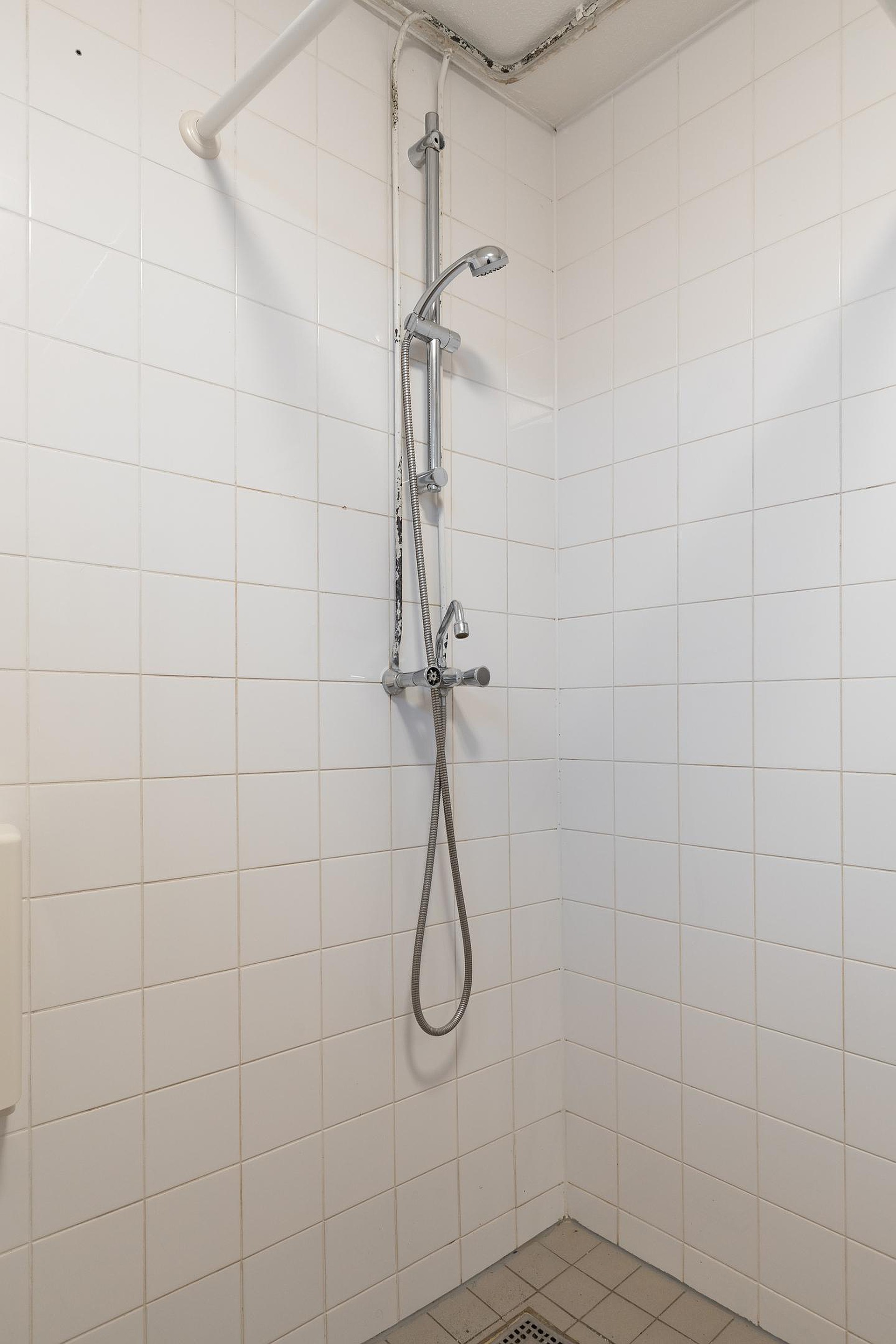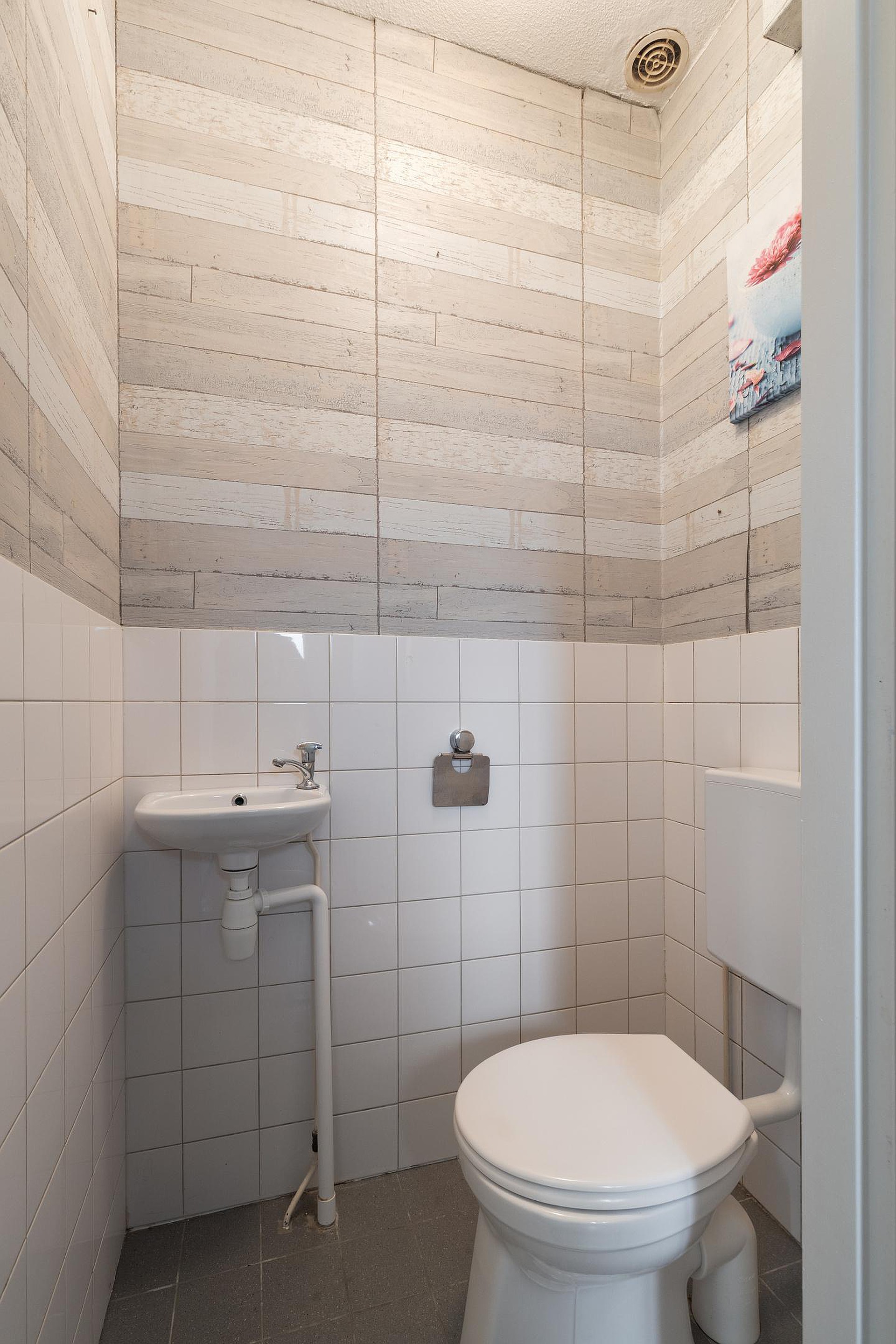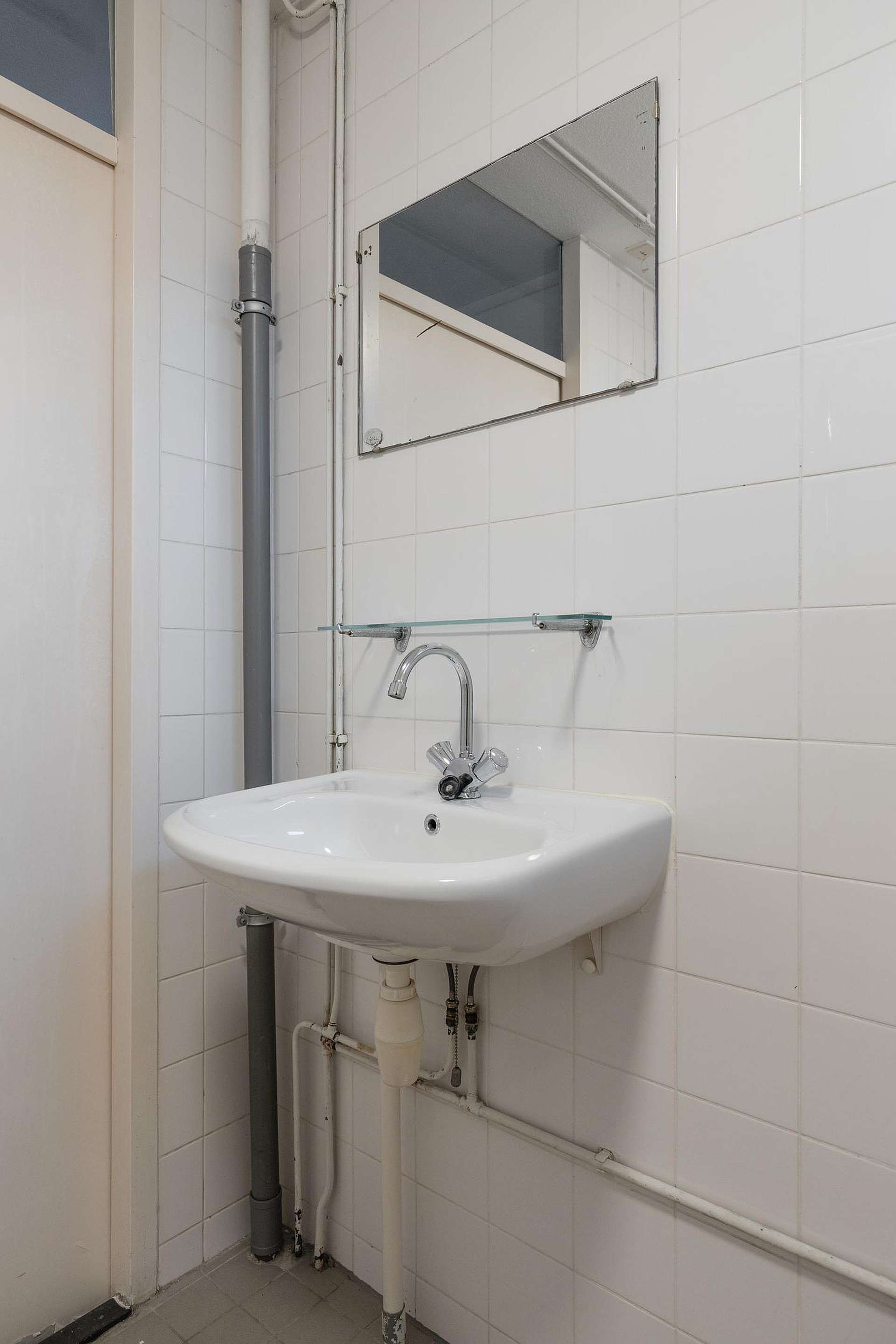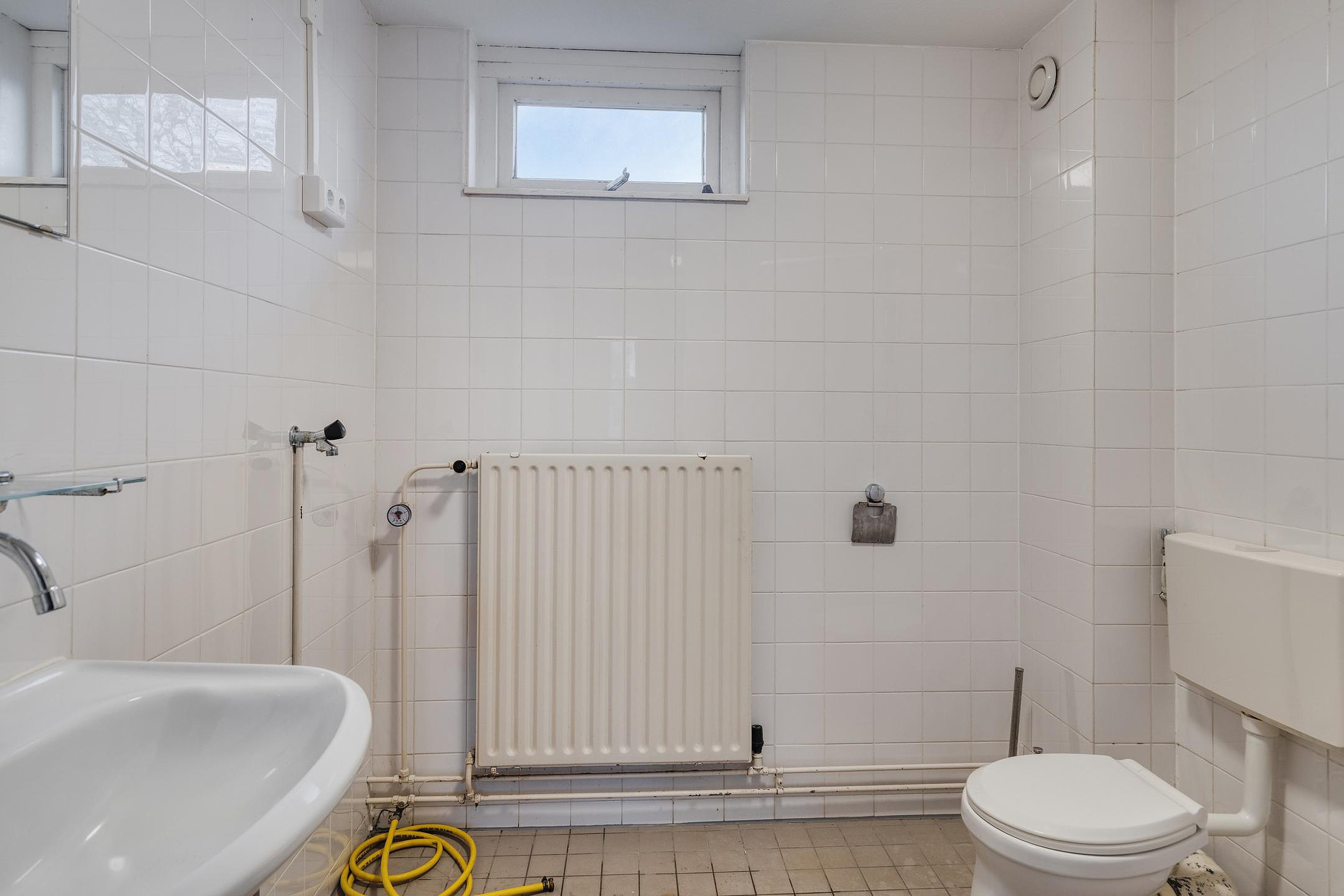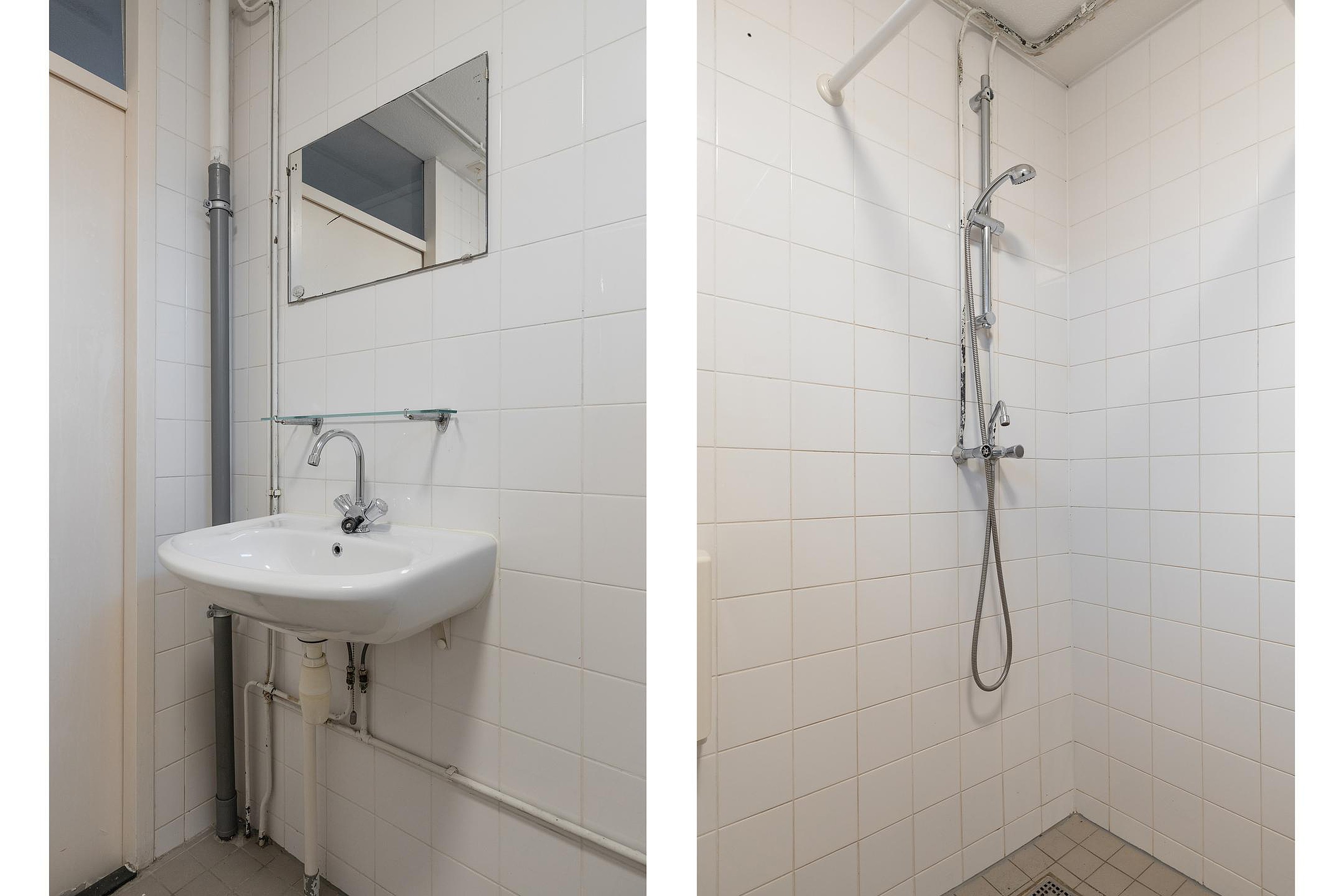 De badkamer is functioneel en voorzien van een douche, toilet en wastafel, maar biedt mogelijkheden voor een frisse, moderne update.