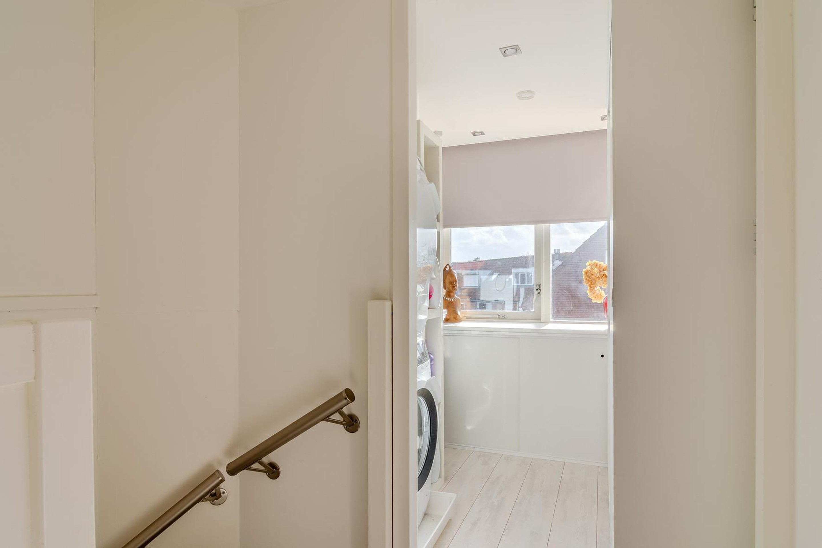 Via een vaste trap bereik je de overloop met wasruimte en een ruime derde slaapkamer met dakkapel.