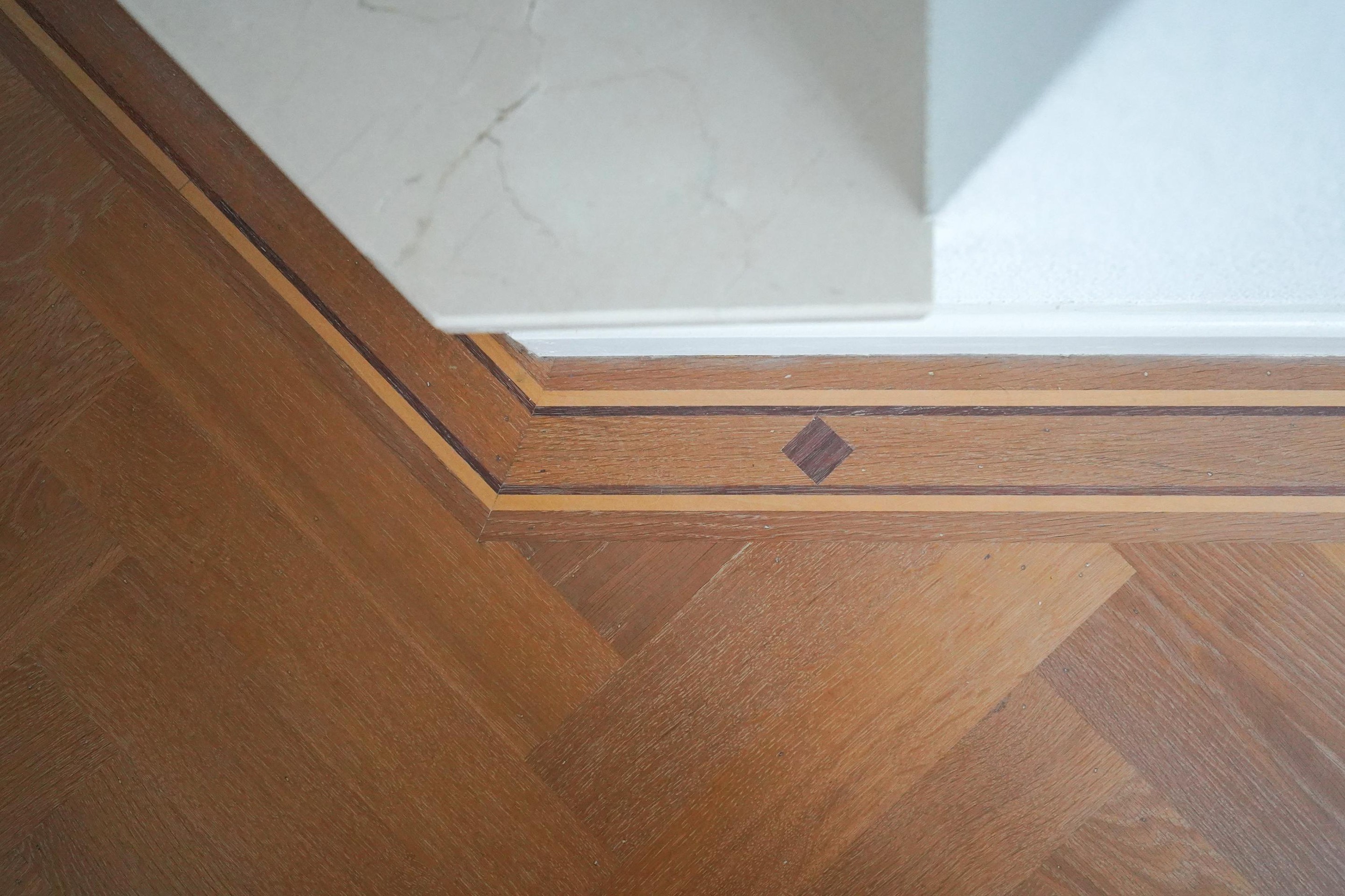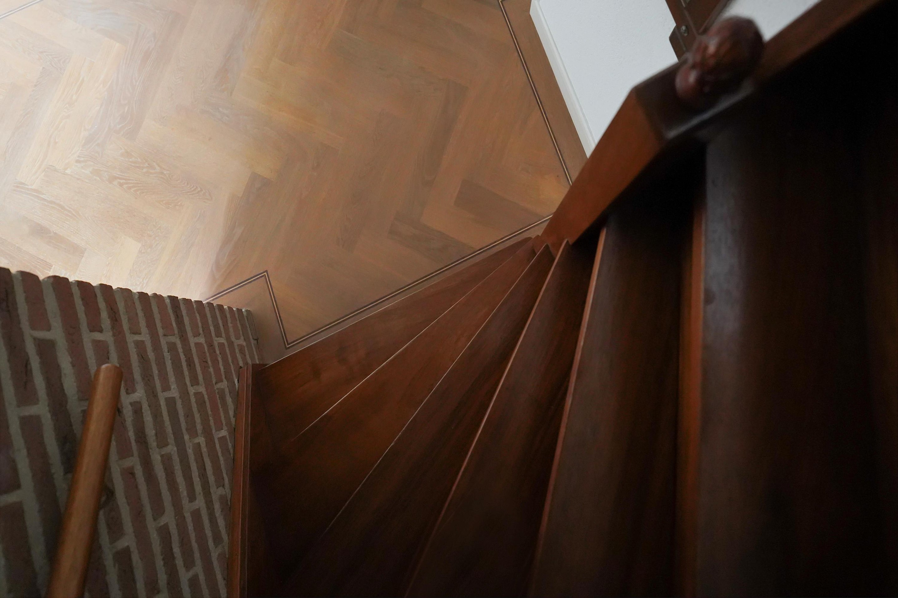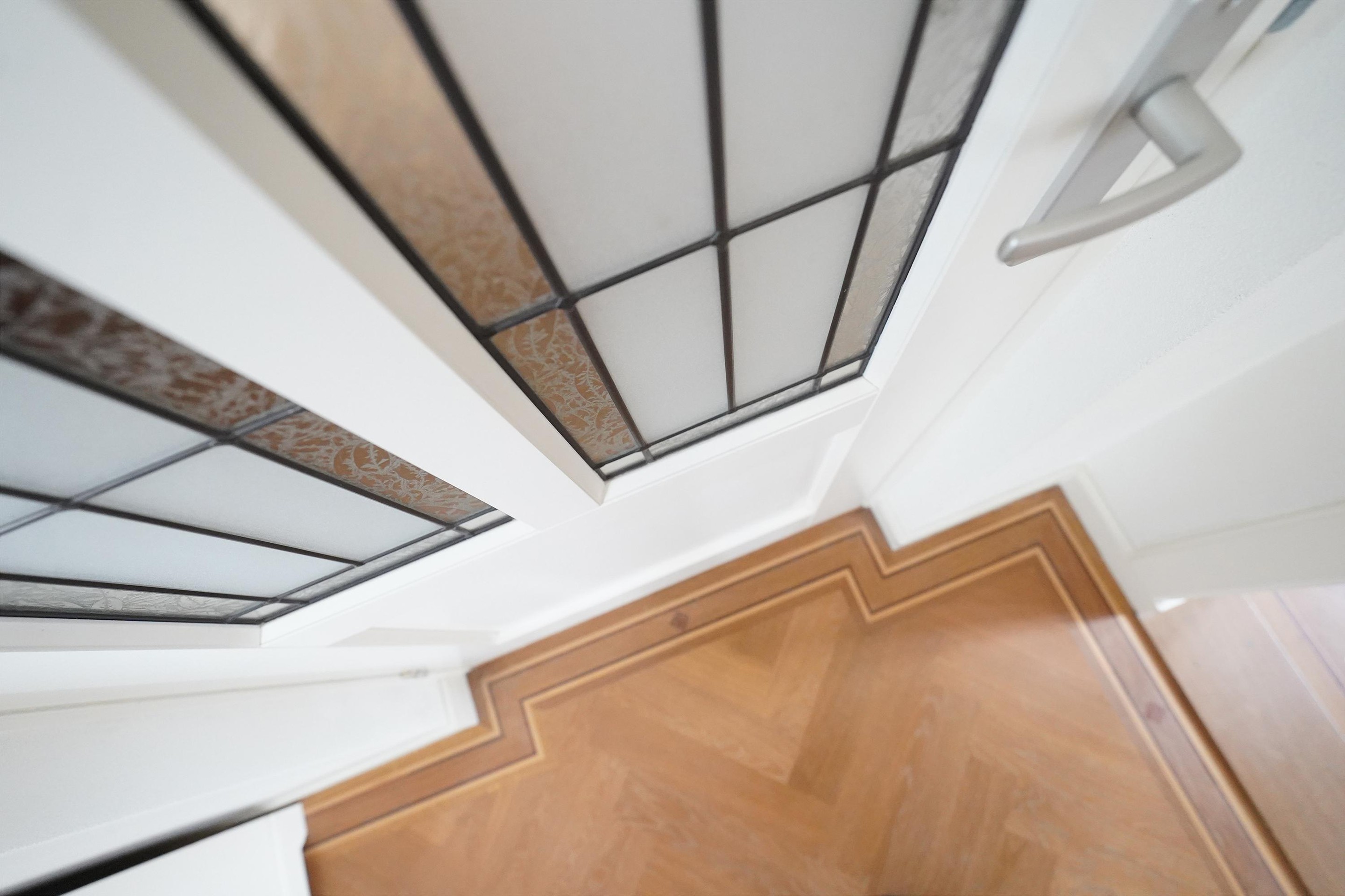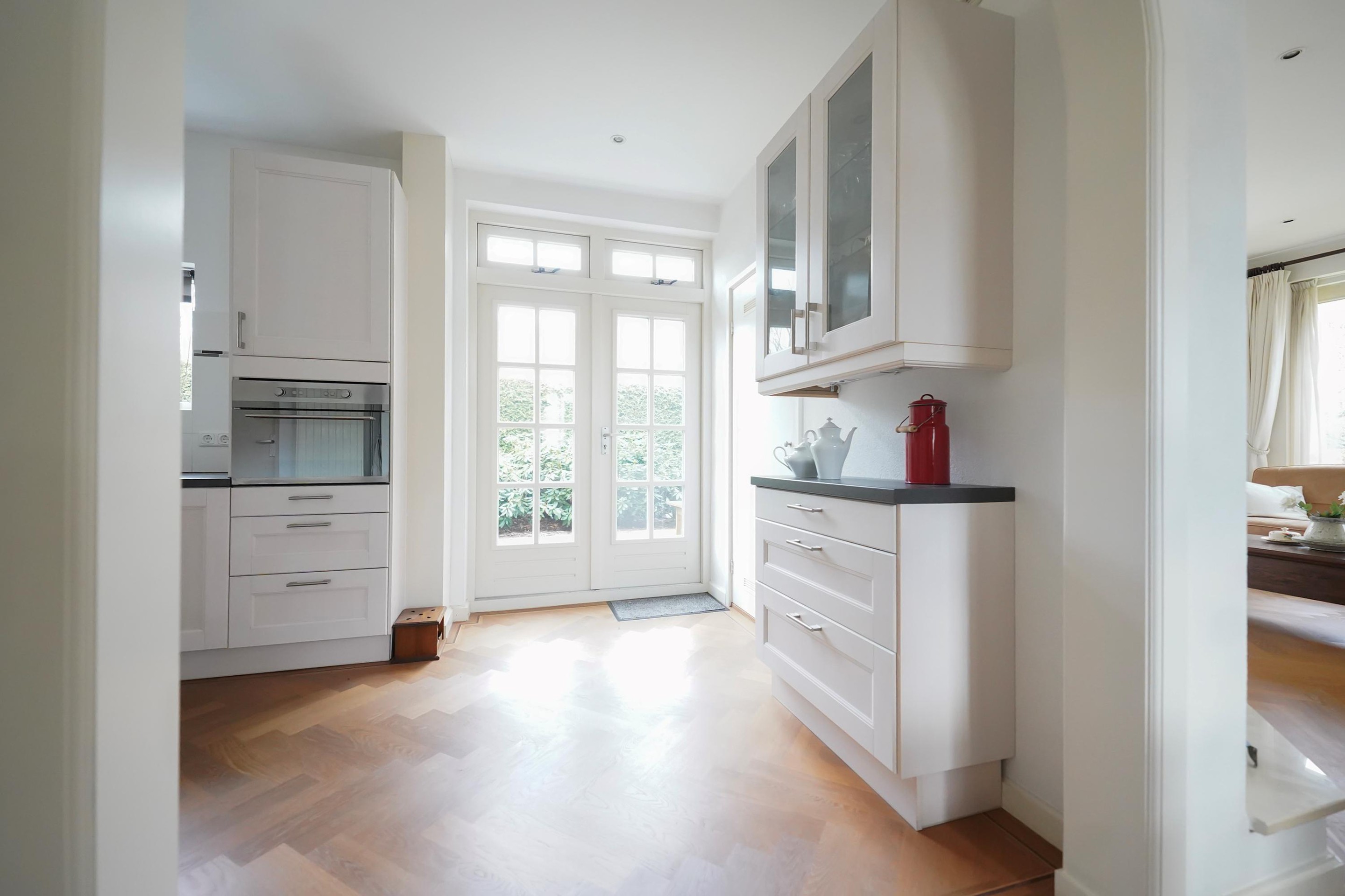 En daar valt het meteen op: de prachtige eikenhouten visgraat vloer die doorloopt richting keuken en woonkamer. Vanuit de hal is er toegang tot de stijlvolle toiletruimte, de bijkeukens en de keuken. Door de glas-in-looddeur lopen we de woonkamer in, en hier gebeurt het. Licht, ruimte en een fijne, warme sfeer komen samen.