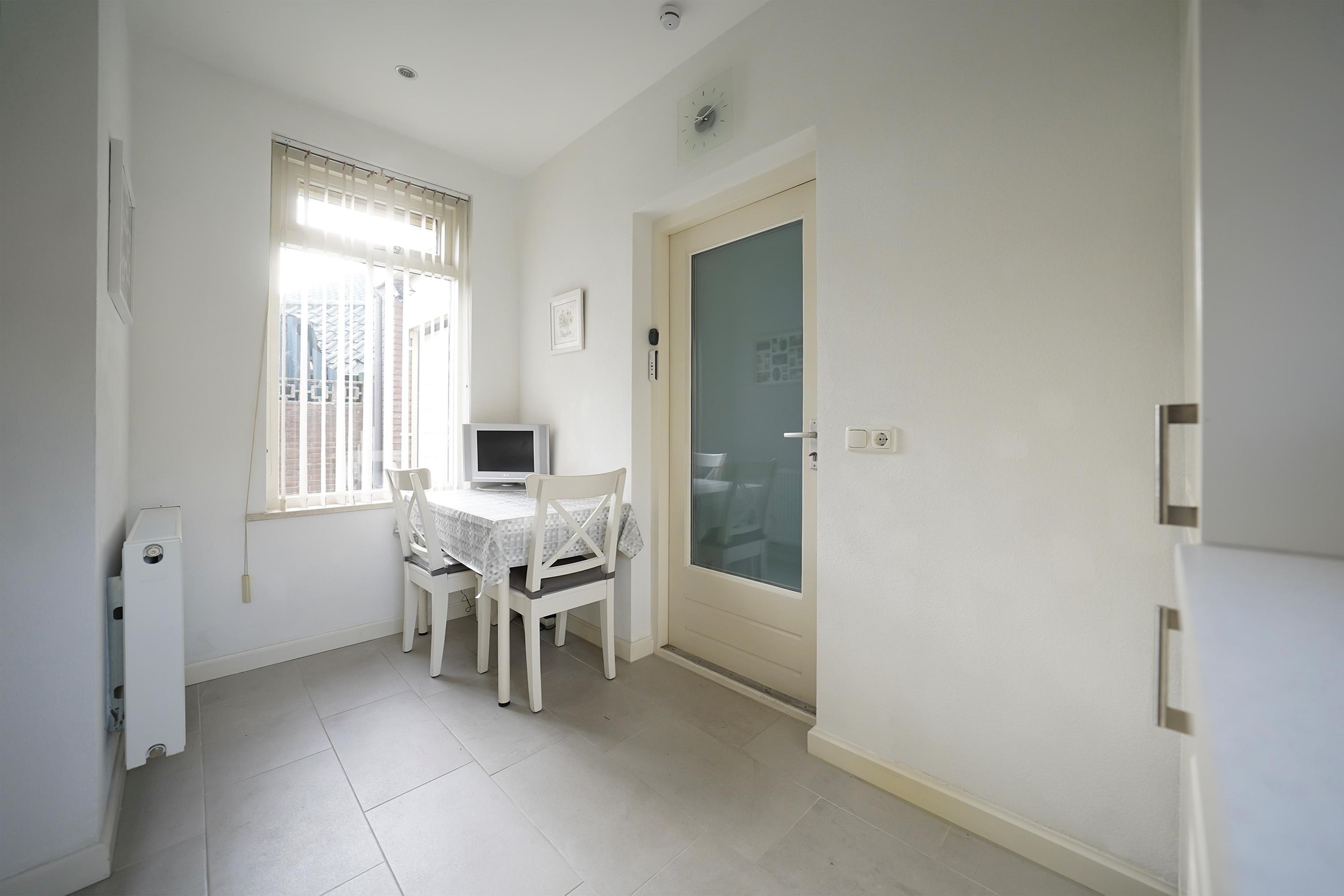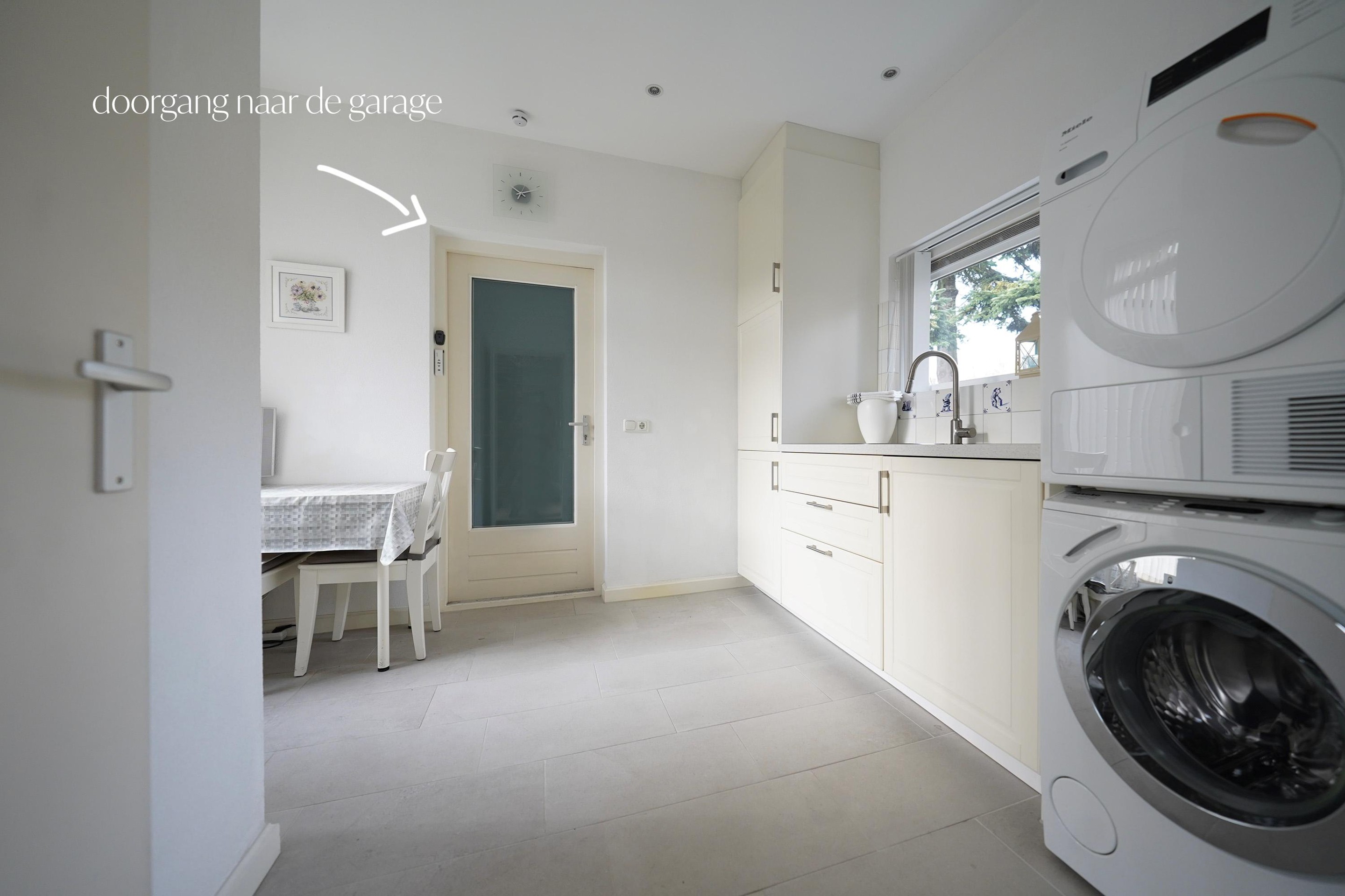 De tweede is ruimer, opnieuw betegeld en voorzien van een pantry met extra koelkast en wasbak met warm en koud water. Hier zit ook netjes de cv-ketel weggewerkt in de kast. Deze ruimte zou ook kunnen fungeren als een praktijk-of kantoorruimte. Ideaal vanuit de hal te bereiken. Vanuit deze ruimte lopen we door naar de stenen garage/berging met elektrische garagedeur, een deur naar de tuin en een extra raam. En precies dát maakt deze ruimte zo interessant: hier is eenvoudig een slaapkamer en badkamer op de begane grond te realiseren. Levensloopbestendig wonen ligt dus binnen handbereik.