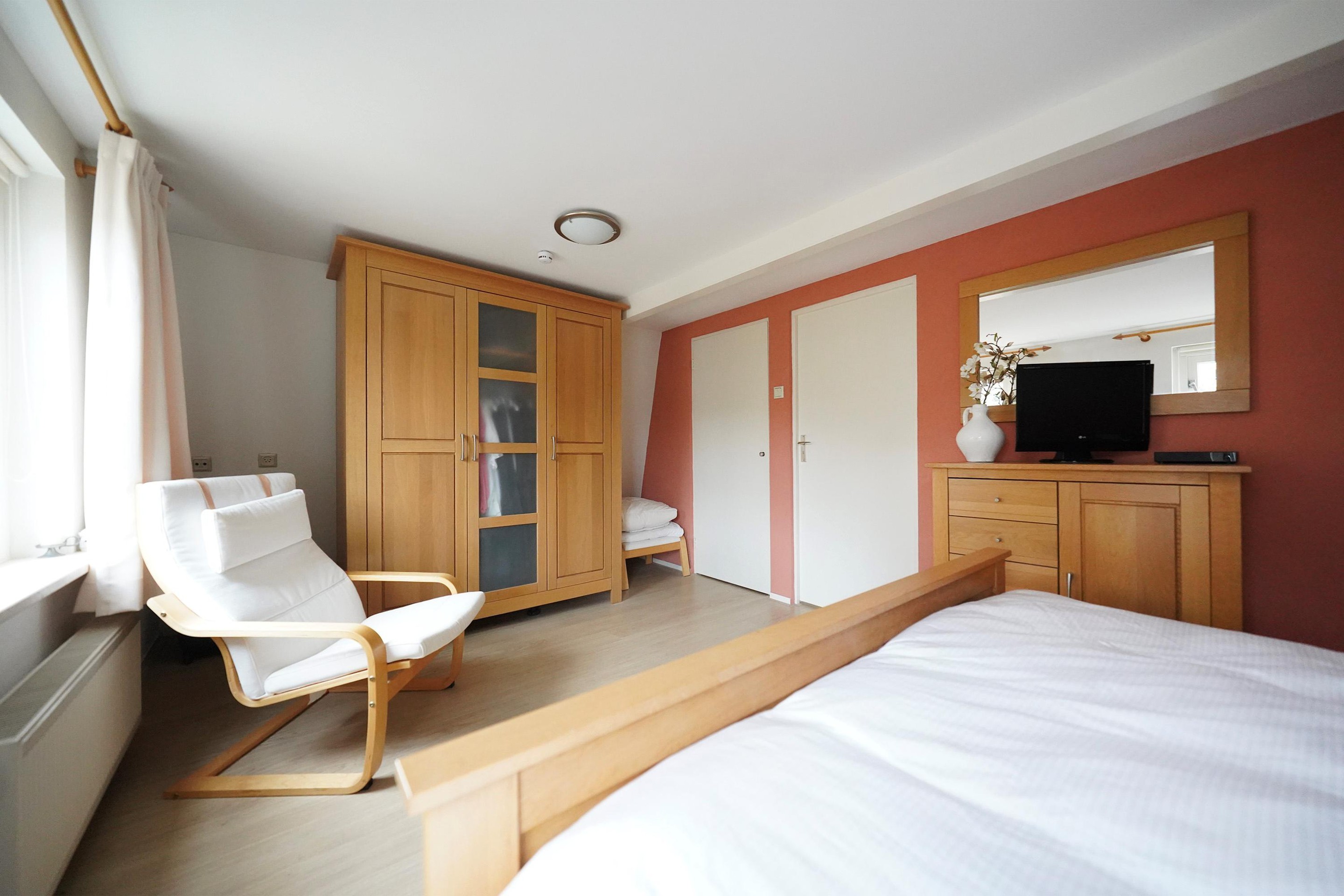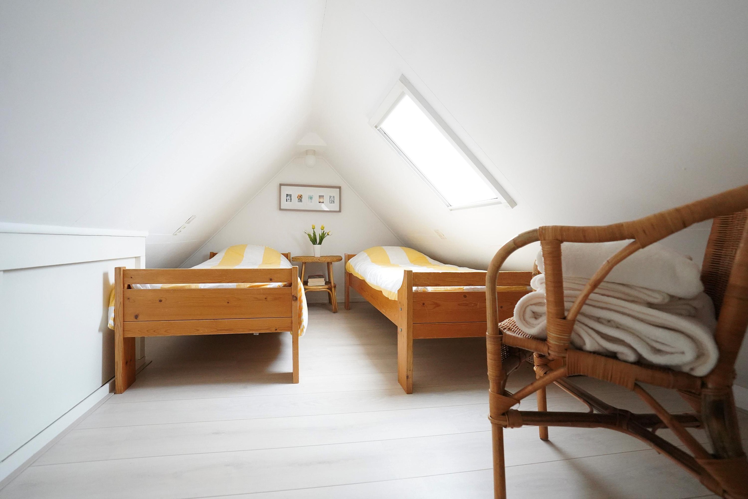 Een sfeervolle logeer- of slaapkamer, slim ingedeeld onder het dakraam. Geen volledige stahoogte, maar juist daardoor knus en verrassend bruikbaar. Aan de voorzijde veel bergruimte voor koffers, ski’s en seizoensspullen.