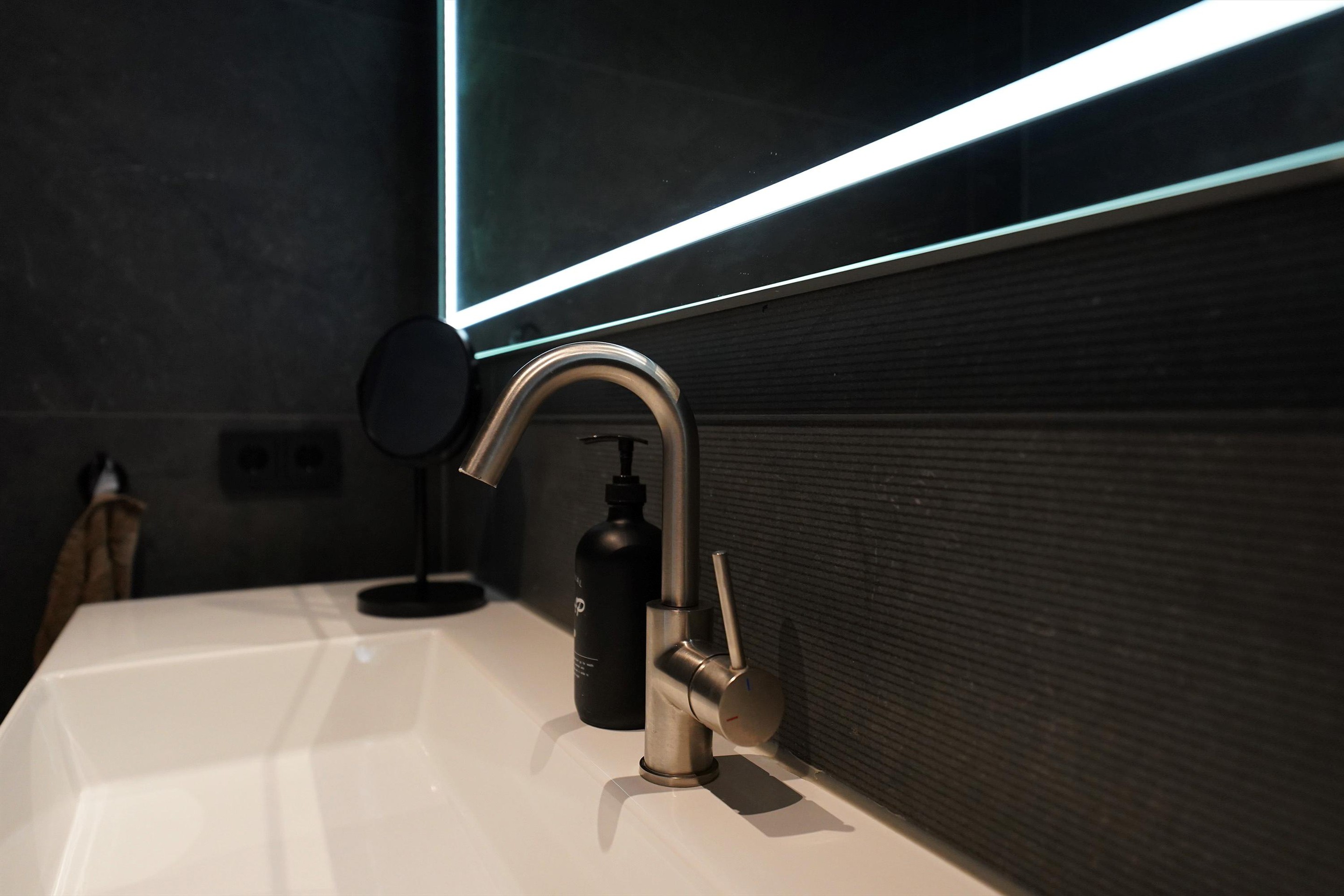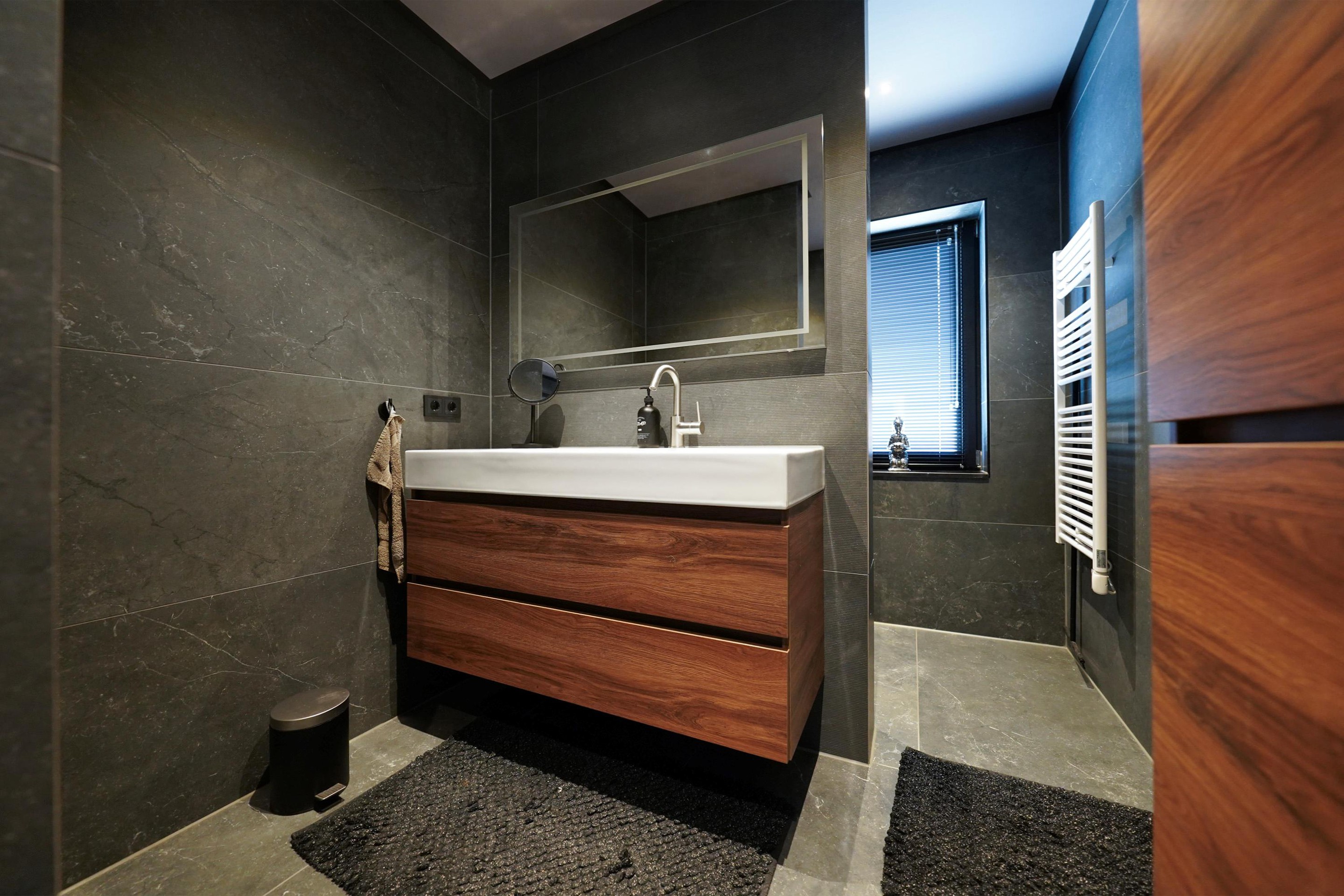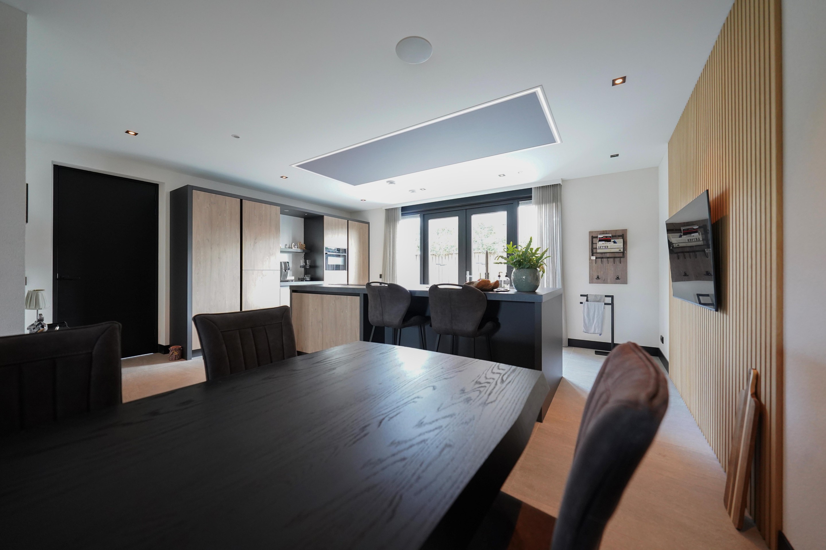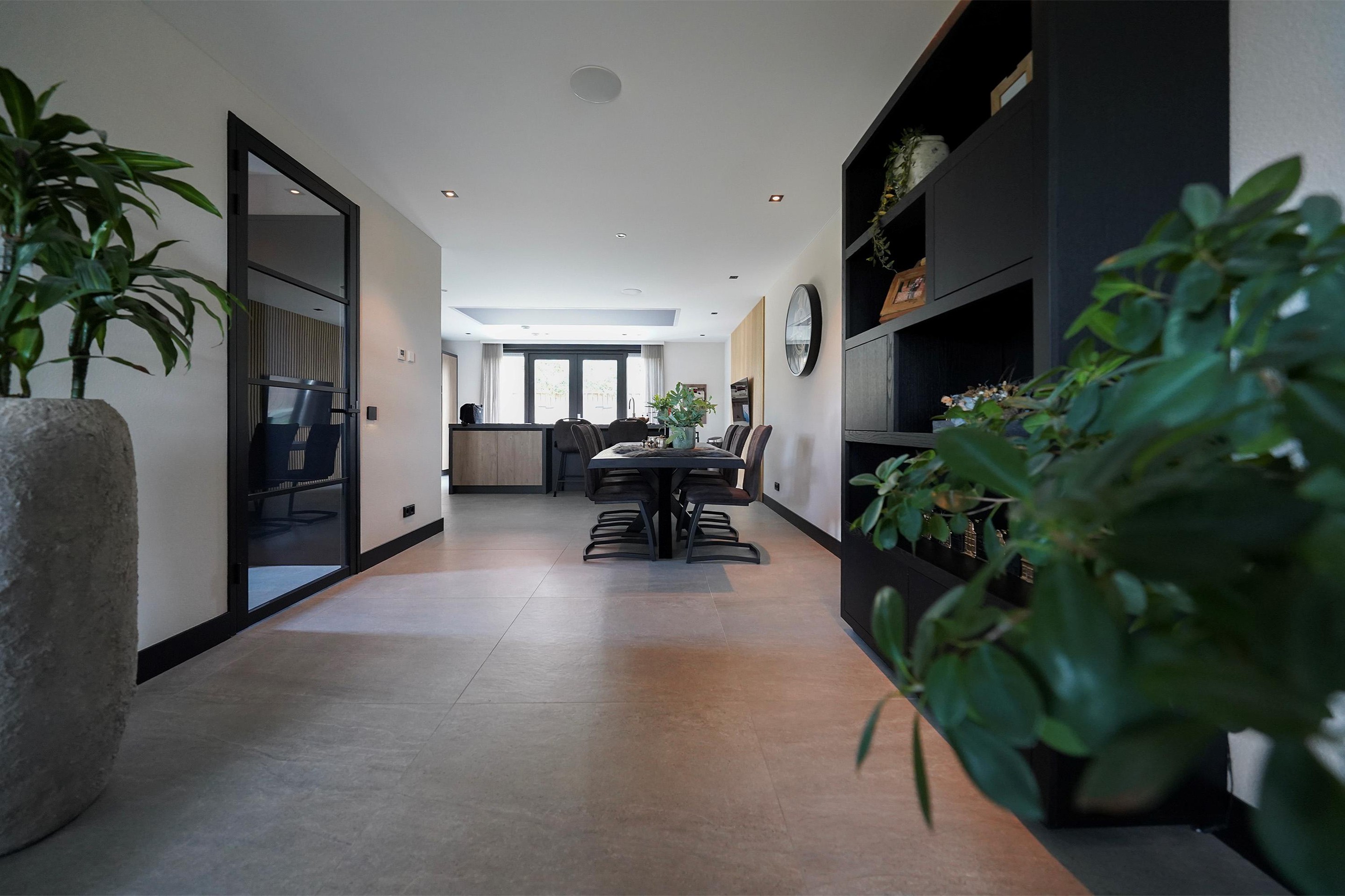 Bij aankomst valt mij meteen die vrije ligging op waarbij de woning op een hoek gelegen is en je volledige privacy hebt. Heel fijn! We kunnen ruim parkeren op eigen terrein en als ik dat eenmaal gedaan heb en de woning bekijk valt het me nu pas op hoe hoog deze woningen zijn. Ik kan je vertellen dat de woning zelfs 4 verdiepingen heeft! De uitstraling van de woning vind ik prachtig met mooi metselwerk, een gebroken kap en gebruik van goede kleuren. De hoofdentree is aan de zijgevel gesitueerd en ook de aanbouw heeft een eigen entree aan deze zijgevel. Praktisch! Ik kom binnen in een goede hal waarbij me meteen opvalt dat de afwerking van de trap en de deuren matzwart zijn afgewerkt. Geen standaard witte nieuwbouwdeuren dus! De uitstraling is meteen heel chique en het gebruik van de mooie grote tegels op de vloer versterken deze uitstraling. Meteen links is de toiletruimte gesitueerd. Bij binnenkomst gaat de verlichting automatisch aan en uiteraard is deze ruimte voorzien van een hangend toilet en een fonteintje. We lopen door naar de living en de woonkeuken waarbij deze 2 ruimtes van elkaar gescheiden zijn door de hal in het midden. De meeste ideale indeling als je het mij vraagt. Bij binnenkomst valt meteen op wat een heerlijke ruimtes het zijn. De woonkamer is aan de voorzijde gelegen en heeft het vrije uitzicht over de straat, de wadi en de stationsstraat. Het hoekraam is daarbij een mooie eyecatcher. Het plafond is volledig voorzien van een spanplafond waardoor de akoestiek ook perfect is in de woonkamer en de keuken. De keuken is ook echt een eyecatcher. Zo’n eiland is de droom van iedere huizenbezitter denk ik. En wat voor een eiland! Aan werkruimte geen gebrek en de vaste kastenwand is daarbij ook echt ideaal. Bijna de volledige achtergevel is voorzien van glas en via de openslaande tuindeuren loop je zo de tuin in.