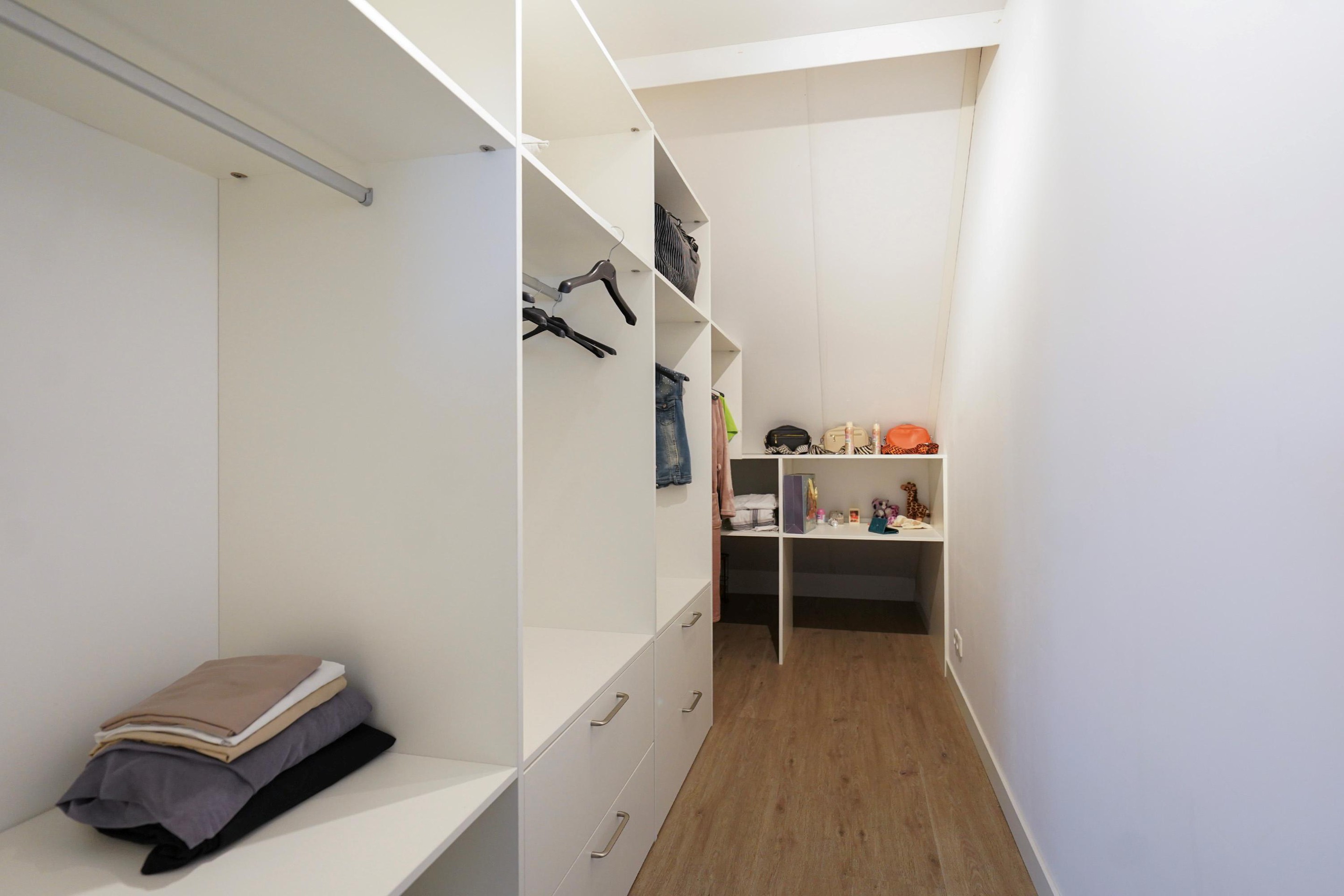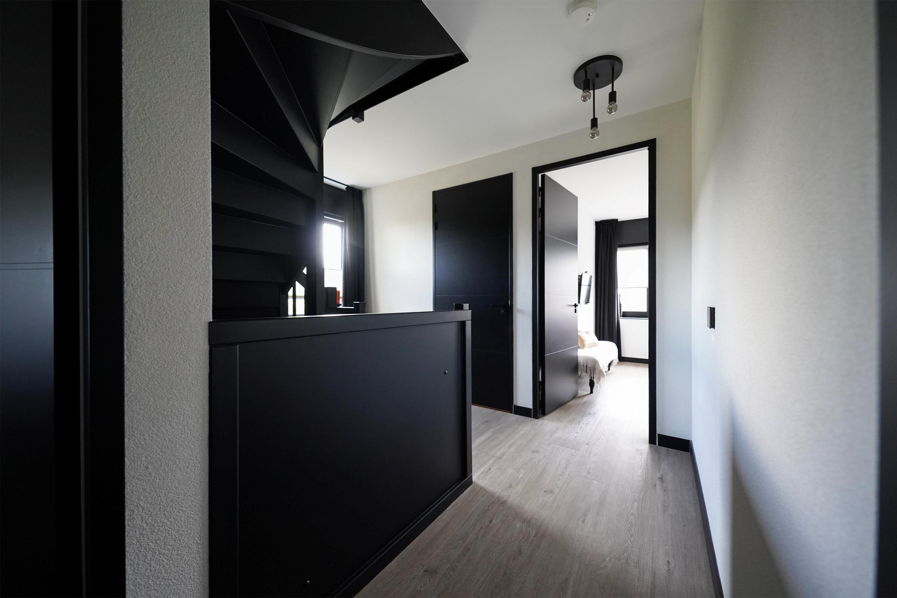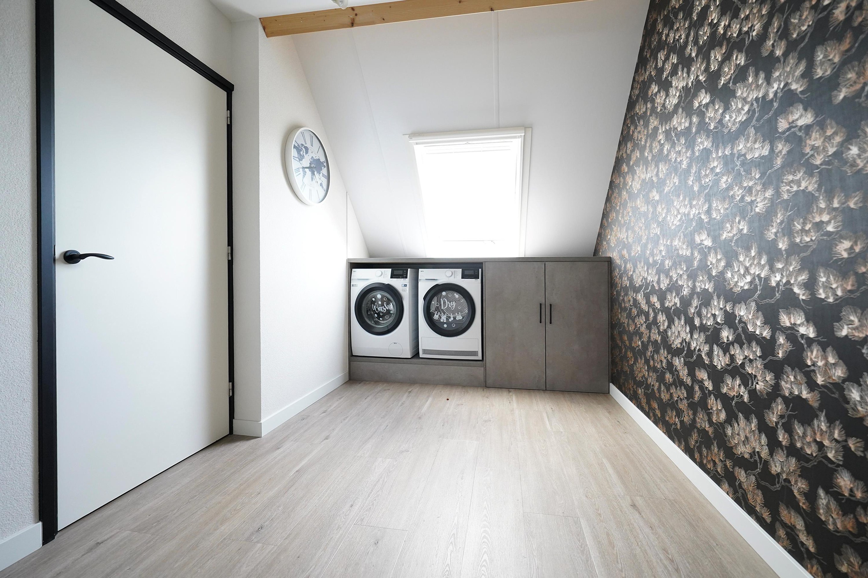 Weer via een mooie zwarte trap gaan we door naar een volwaardige 2e verdieping met ontzettend veel ruimte. Hier bevindt zich een ruime overloop waar ook de wasmachine en droger, netjes ingebouwd, zijn gesitueerd. Ook is er een enorm grote 4e slaapkamer aanwezig tevens voorzien van een inloopkast. Verder is er een machinekamer waar alle installaties zoals de warmtepomp en de boiler zijn geplaatst en zo ook fijn uit het zicht zijn.