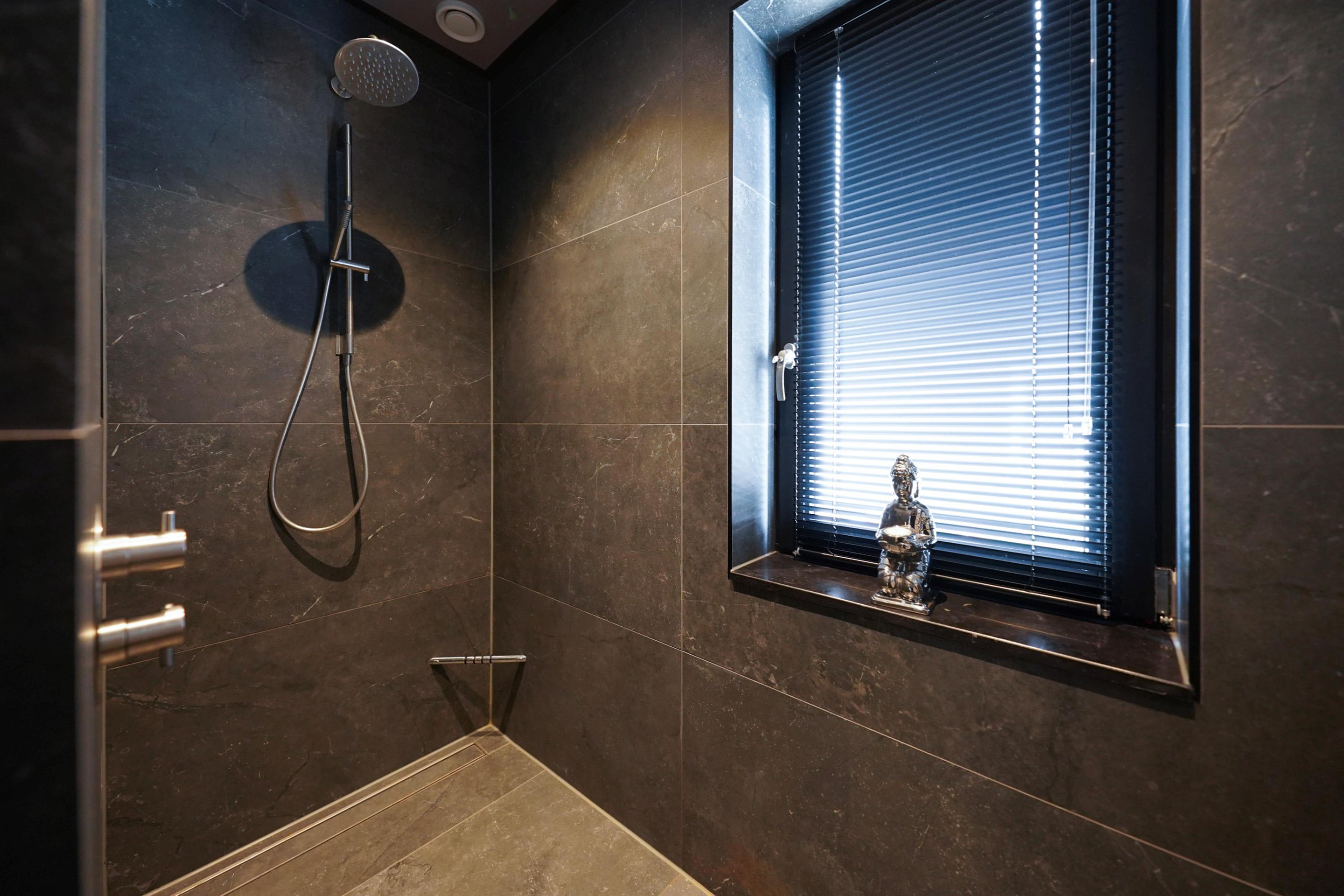 Nu op naar boven, via de zwarte open trap naar een ruime overloop ook weer met een raampartij voor extra daglicht. Hier zijn 3 grote slaapkamers aanwezig. De masterbedroom is aan de achterzijde gesitueerd en deze is zelfs voorzien van een ruime inloopkast. Mooi gedaan! De badkamer is ook aan de achterzijde van de woning gesitueerd en voorzien van een bijzonder, speelse indeling. Nu is er een hele ruime inloopdouche mogelijk gemaakt, een ruime wastafelmeubel en een 2e toilet uiteraard. De badkamer is ook voorzien van ingebouwde geluidsboxen zodat je lekker mee kan zingen onder de regendouche.