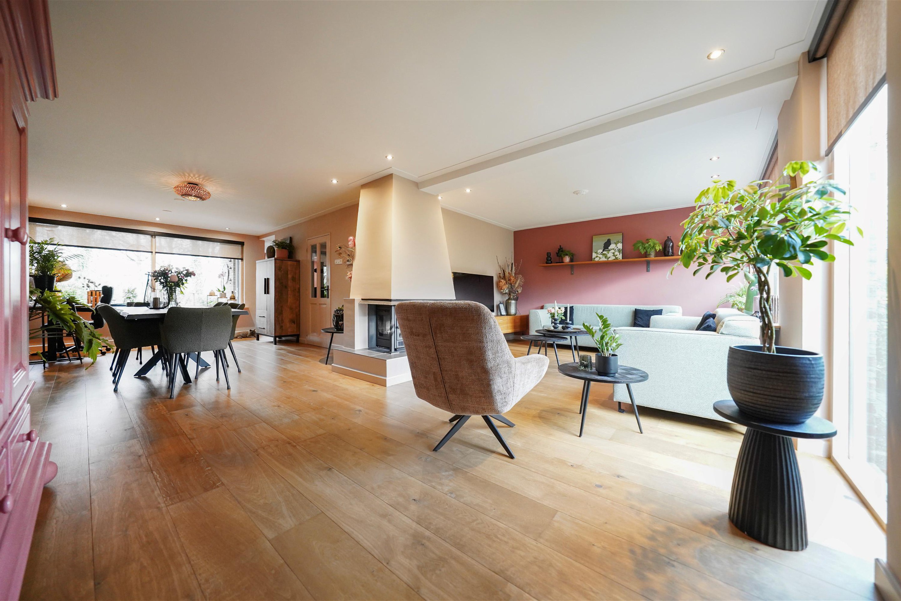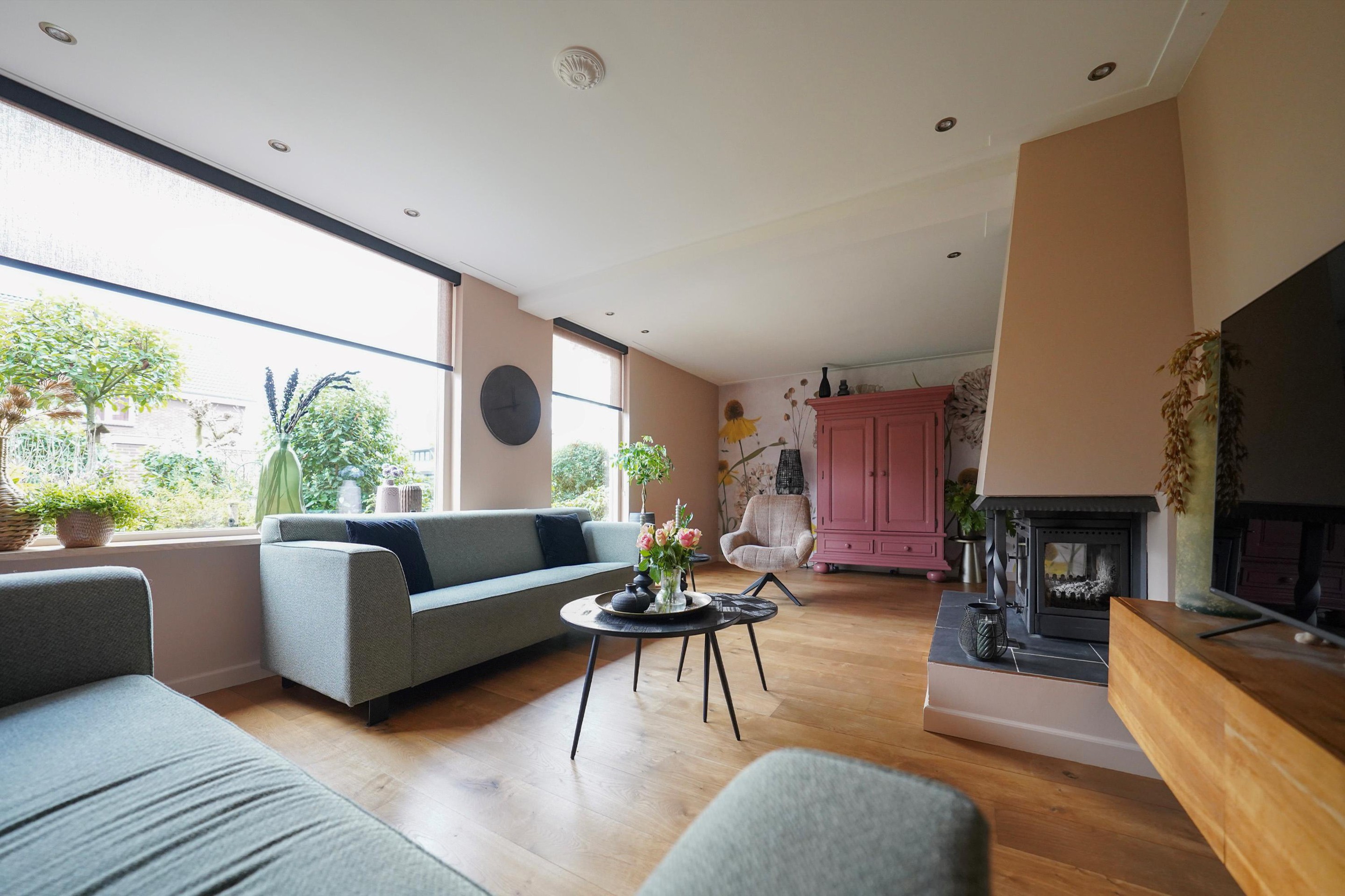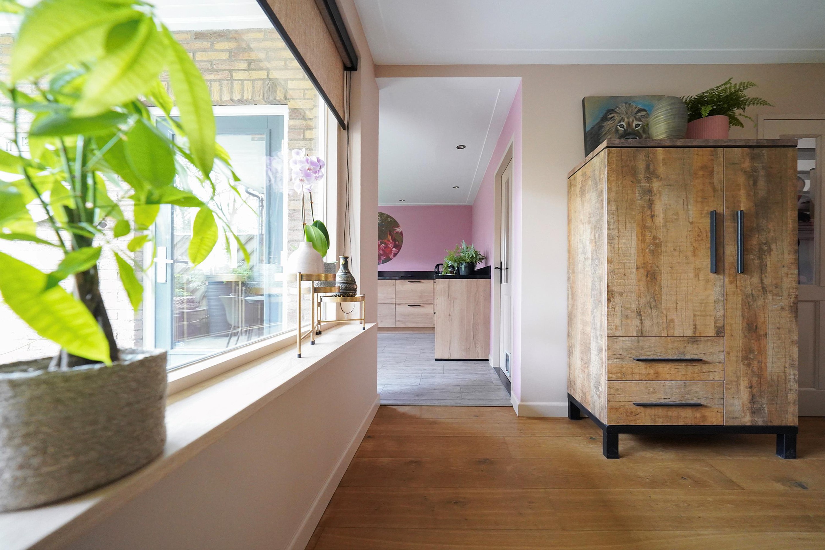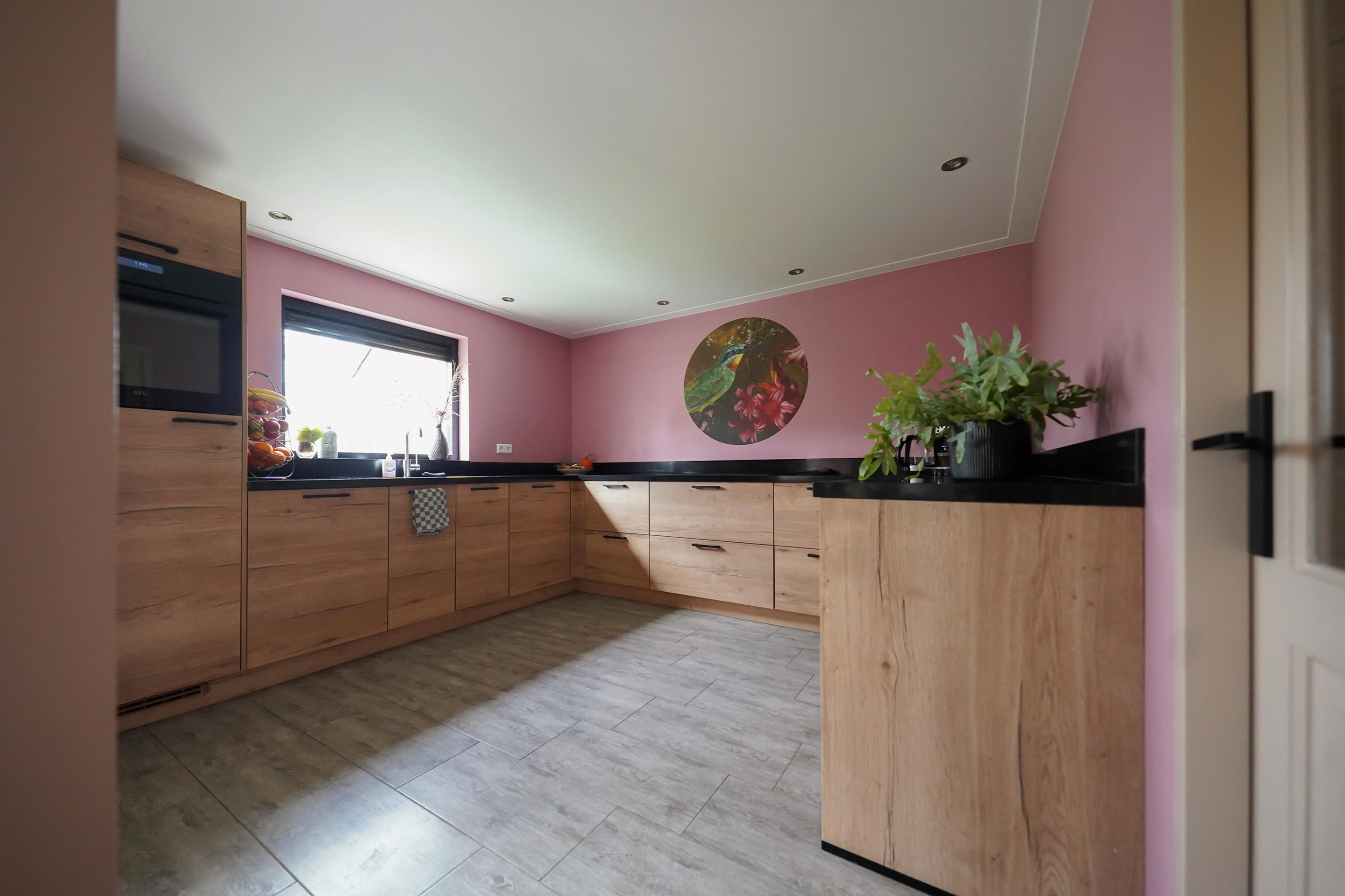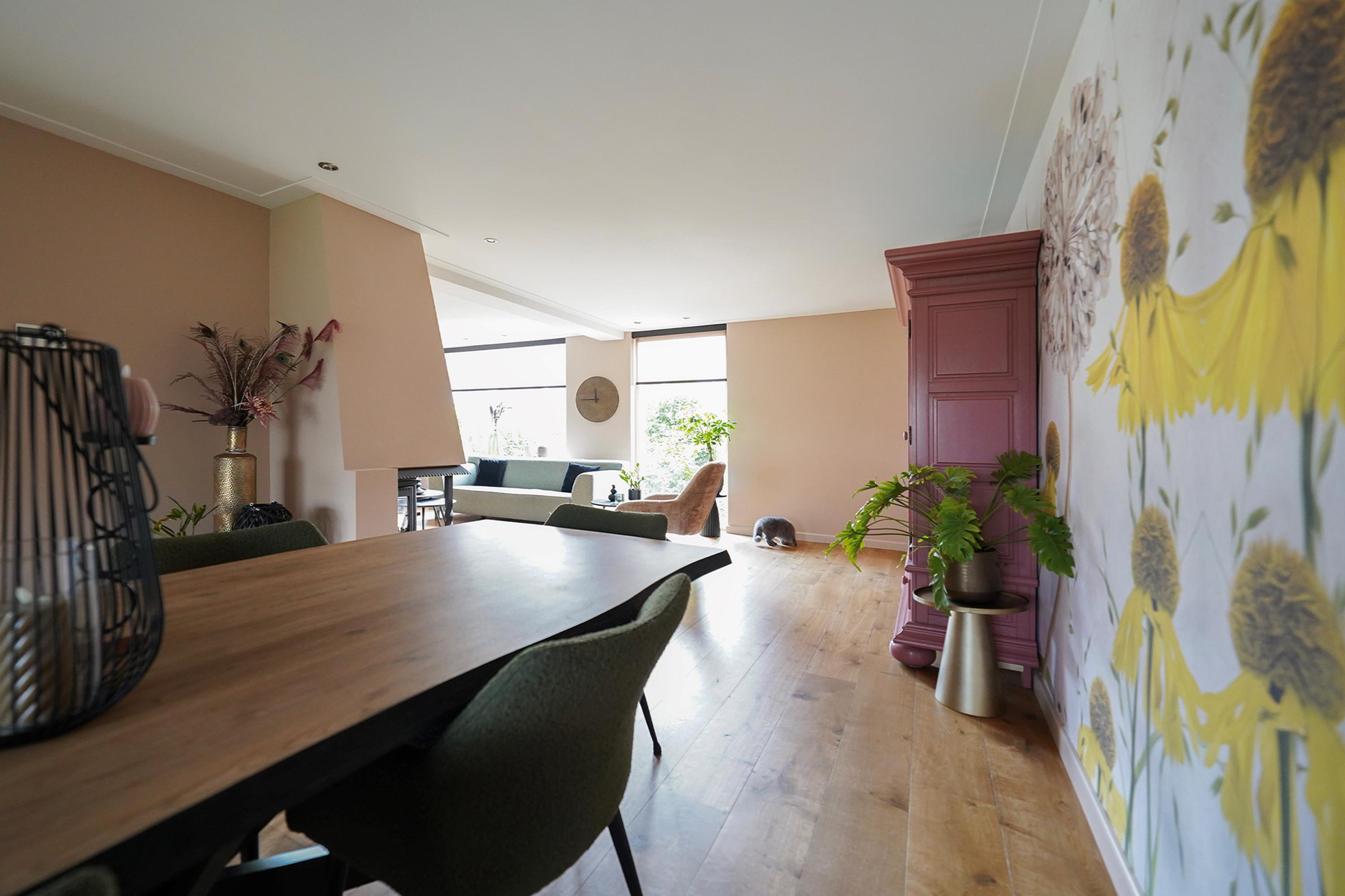 Bij deze woning is dus alles gewoon groter. Zo ook de hal bij binnenkomst. Deze hal is meteen ook een echte eyecatcher met een prachtige vide. Ruimte voor de jassen en de schoenen geen gebrek en via mooie, vernieuwde deuren kunnen we naar de woonkamer en de keuken. In de hal is ook nog de toiletruimte gesitueerd. De woonkamer is echt een heerlijke ruimte waar zoals je ook wel op de foto’s kunt zien echt een mega eettafel kwijt kan. Je kan hier echt dansen om de tafel. Aan de voorzijde is de zitkamer gesitueerd en voorzien van grote raampartijen voor lekker veel daglichttoetreding. De open haard is origineel en echt een prachtig exemplaar wat de ruimte nog meer sfeer geeft. De houten vloer, vloerverwarming, glad gestuukt plafond met spotjes en het uitzicht op de groene tuin zijn toch wel echt de extra’s waar je blij van wordt. Via een smalle doorgaan lopen de we mooie, ruim opgezette keuken in. De keuken is neutraal ingericht met een mooi zwart keukenblad van composiet en alle inbouwapparatuur. De kleur roze op de wanden is wel lekker uitgesproken en geeft de keuken pit! Maar die kleur kan natuurlijk anders, net wat jouw smaak is.
