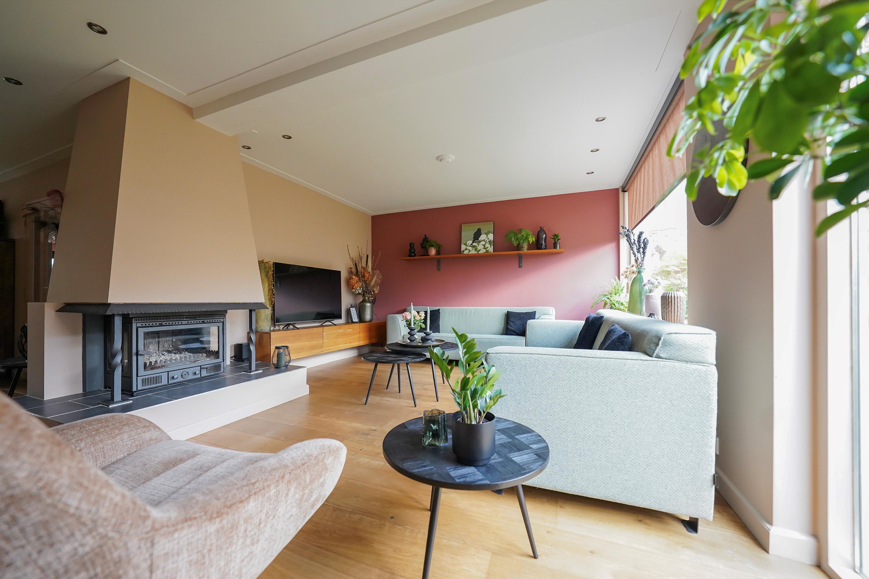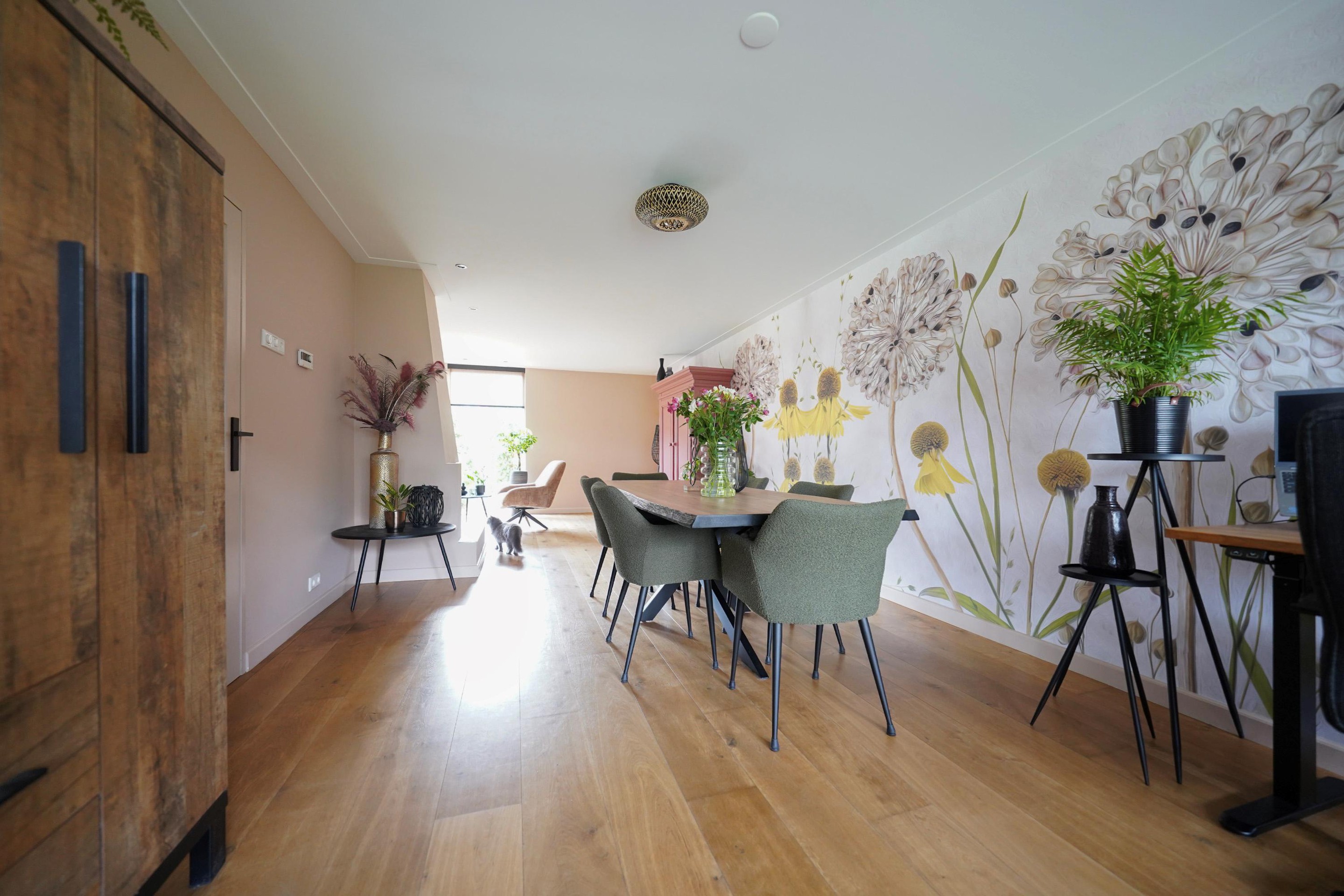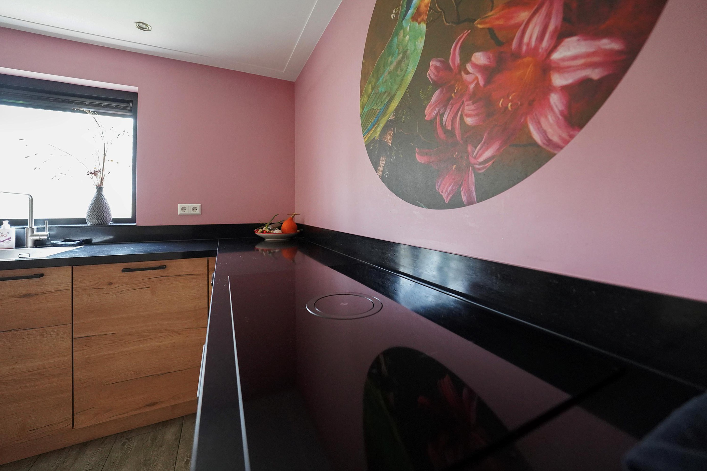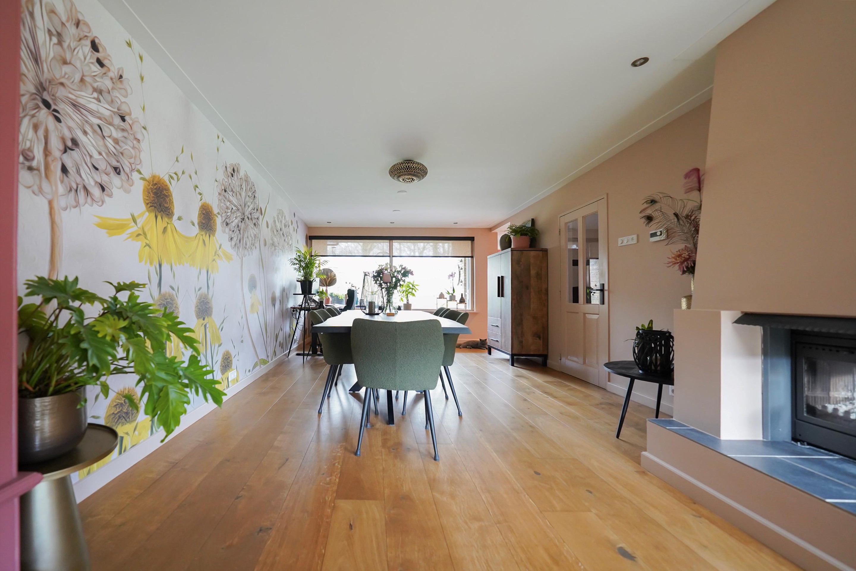 Bij deze woning is dus alles gewoon groter. Zo ook de hal bij binnenkomst. Deze hal is meteen ook een echte eyecatcher met een prachtige vide. Ruimte voor de jassen en de schoenen geen gebrek en via mooie, vernieuwde deuren kunnen we naar de woonkamer en de keuken. In de hal is ook nog de toiletruimte gesitueerd. De woonkamer is echt een heerlijke ruimte waar zoals je ook wel op de foto’s kunt zien echt een mega eettafel kwijt kan. Je kan hier echt dansen om de tafel. Aan de voorzijde is de zitkamer gesitueerd en voorzien van grote raampartijen voor lekker veel daglichttoetreding. De open haard is origineel en echt een prachtig exemplaar wat de ruimte nog meer sfeer geeft. De houten vloer, vloerverwarming, glad gestuukt plafond met spotjes en het uitzicht op de groene tuin zijn toch wel echt de extra’s waar je blij van wordt. Via een smalle doorgaan lopen de we mooie, ruim opgezette keuken in. De keuken is neutraal ingericht met een mooi zwart keukenblad van composiet en alle inbouwapparatuur. De kleur roze op de wanden is wel lekker uitgesproken en geeft de keuken pit! Maar die kleur kan natuurlijk anders, net wat jouw smaak is.