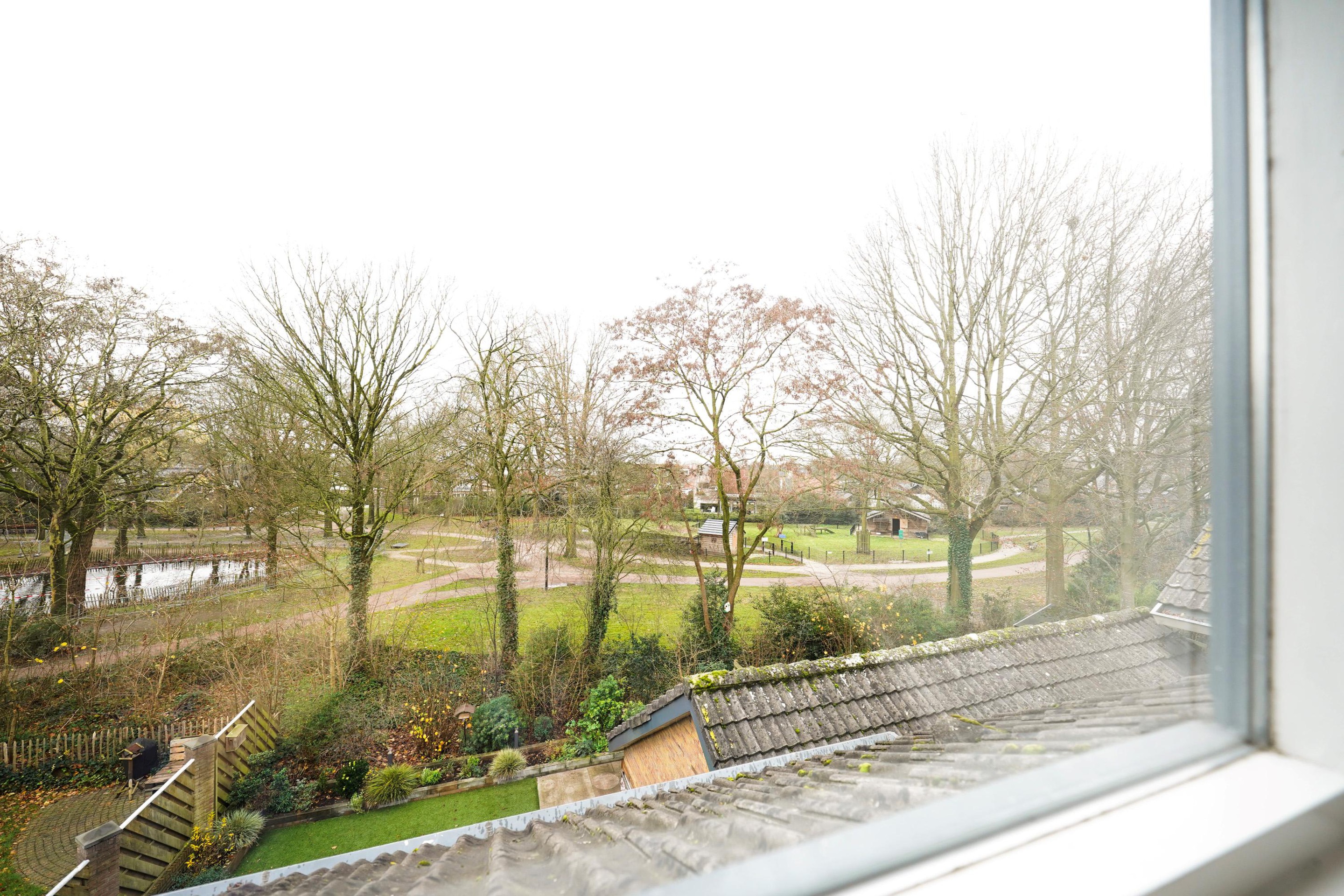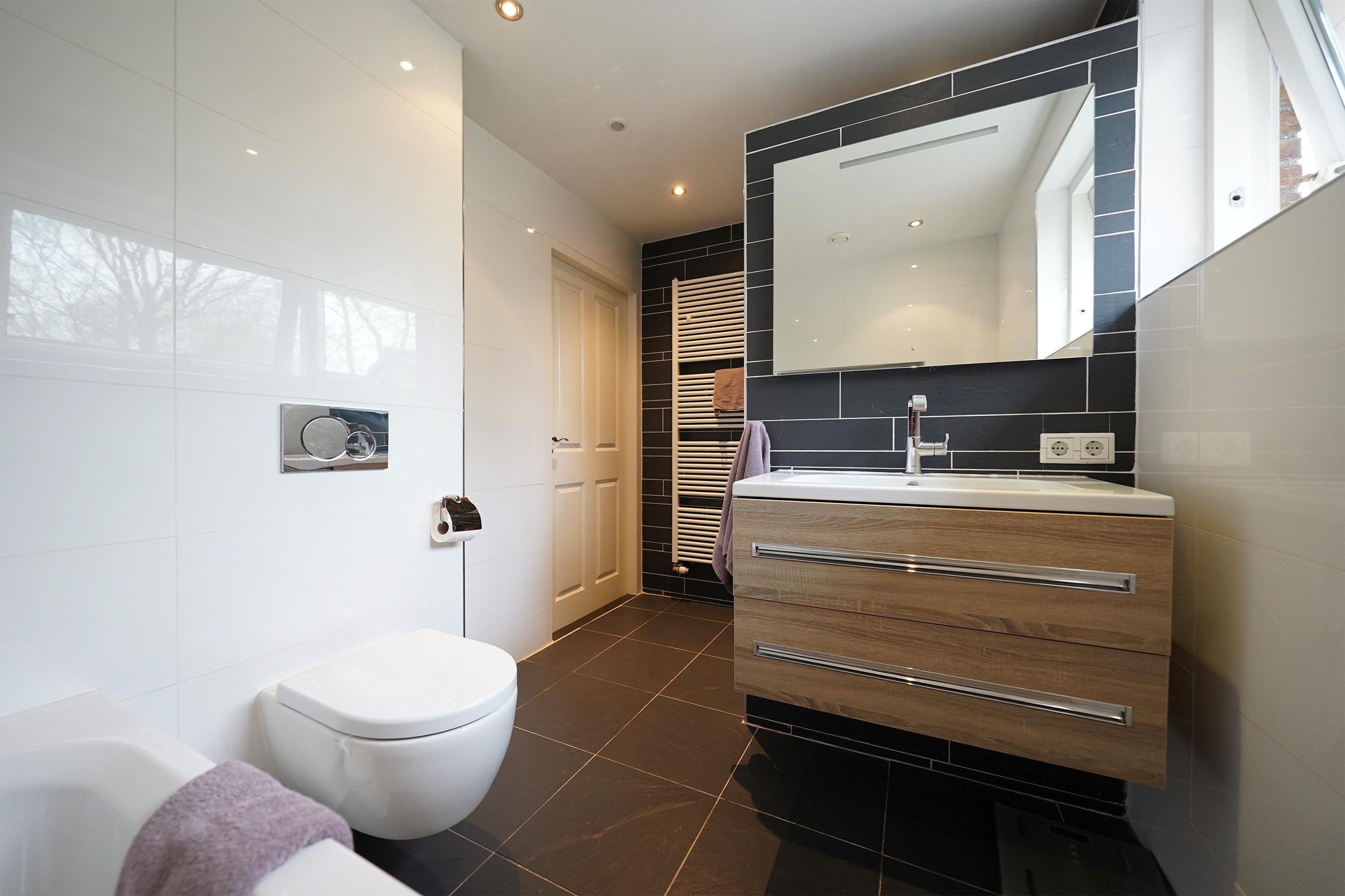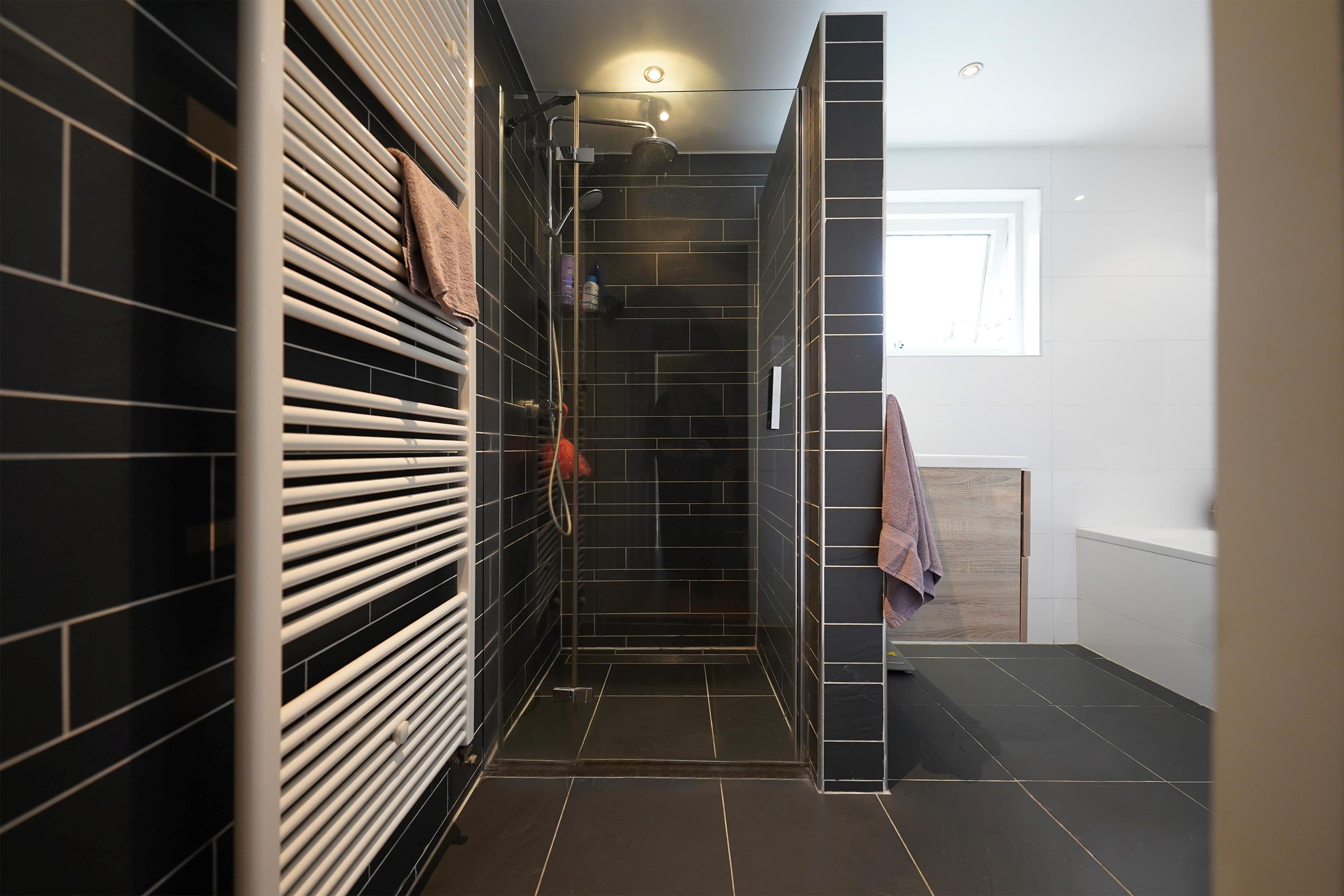 We lopen weer naar binnen waar we via de mooie open trap naar de eerste verdieping lopen. Hier zijn 3 grote slaapkamers, allemaal voorzien van handige inbouwkast. De ouderslaapkamer is aan de achterzijde gelegen en heeft ook een ruim balkon. Hier kijk je ook prachtig over het park uit. De badkamer is keurig en neutraal ingericht, voorzien van een ligbad, mooie wastafelmeubel, inloopdouche met glazen deur en toilet. Deze ruimte is ook voorzien van vloerverwarming.