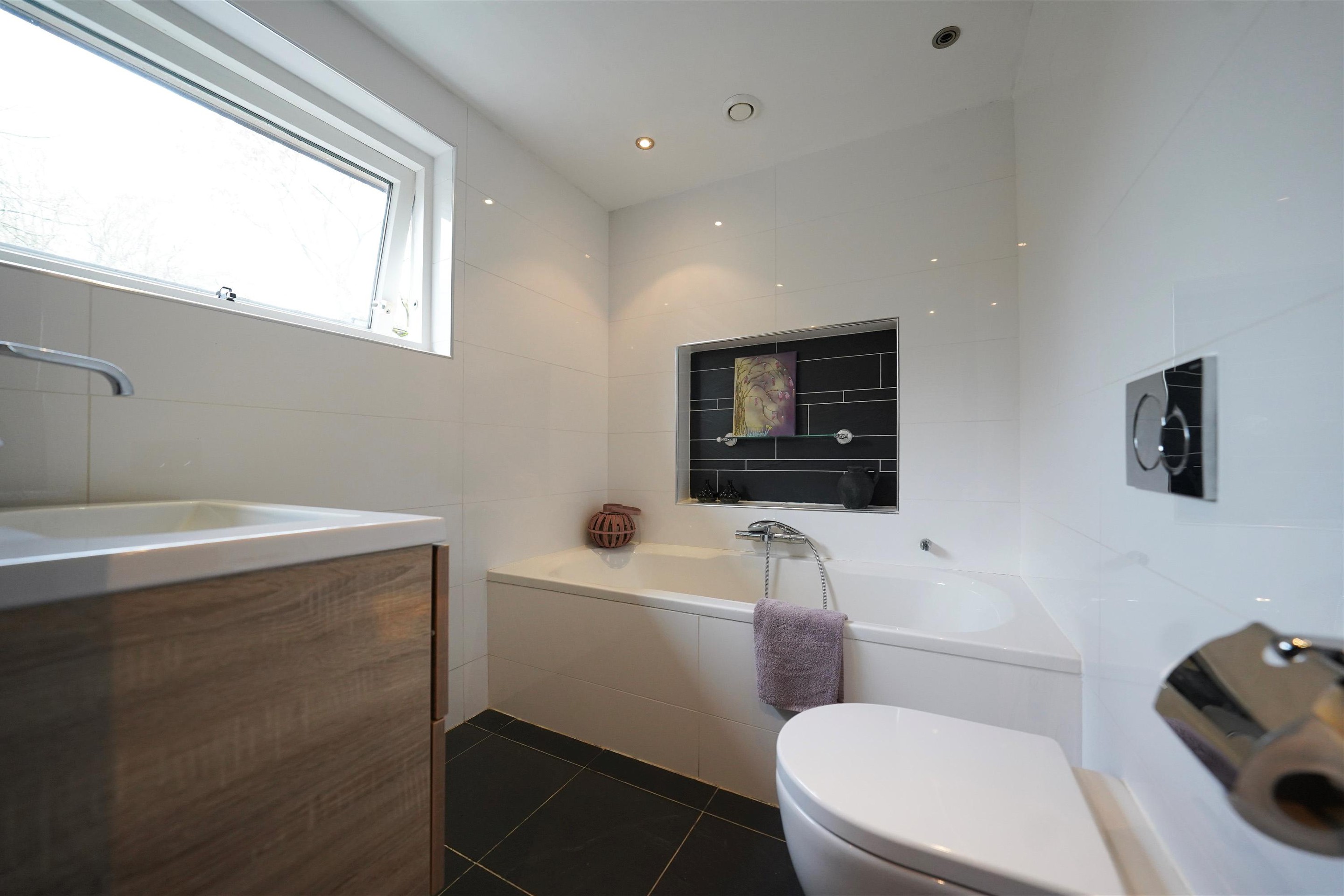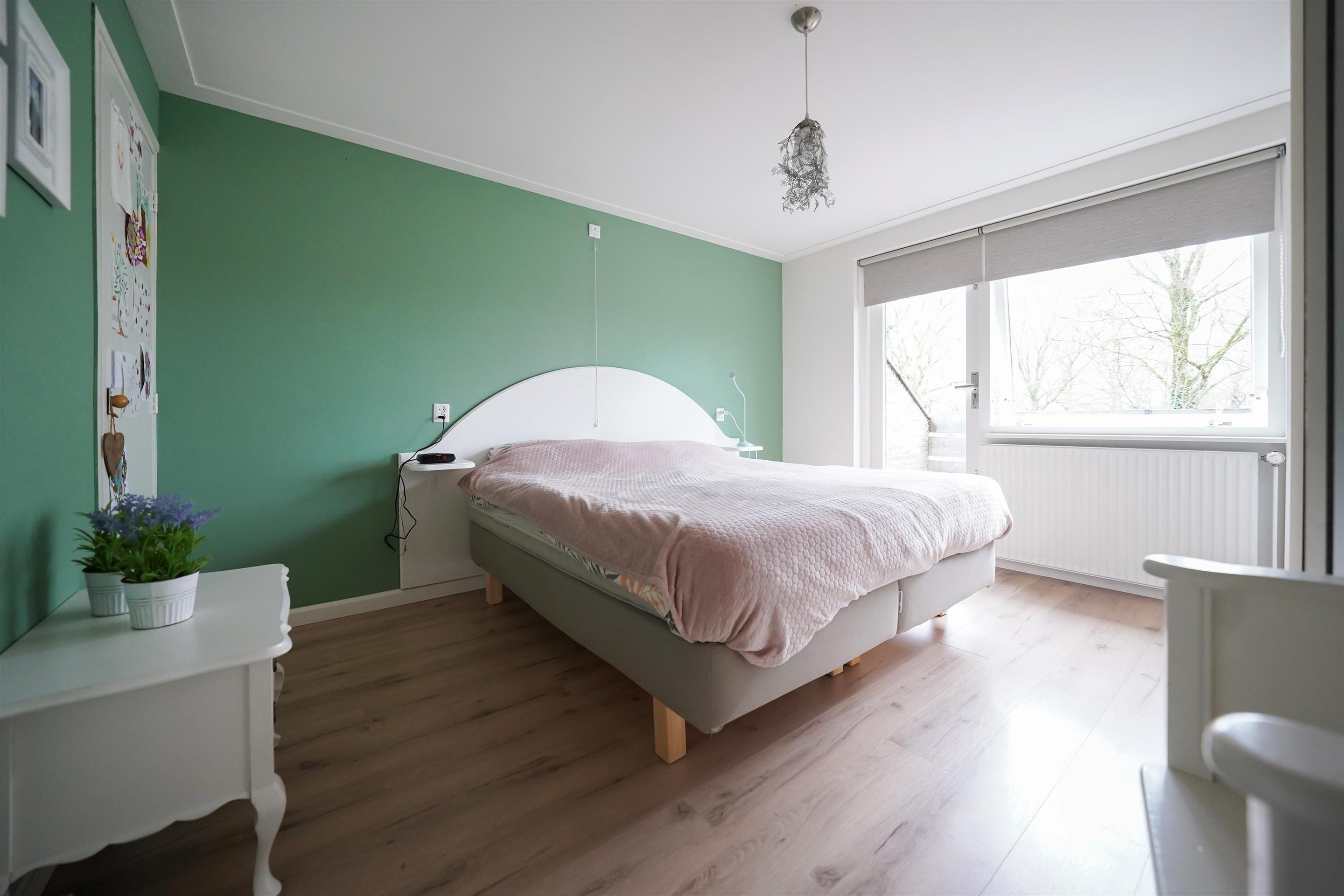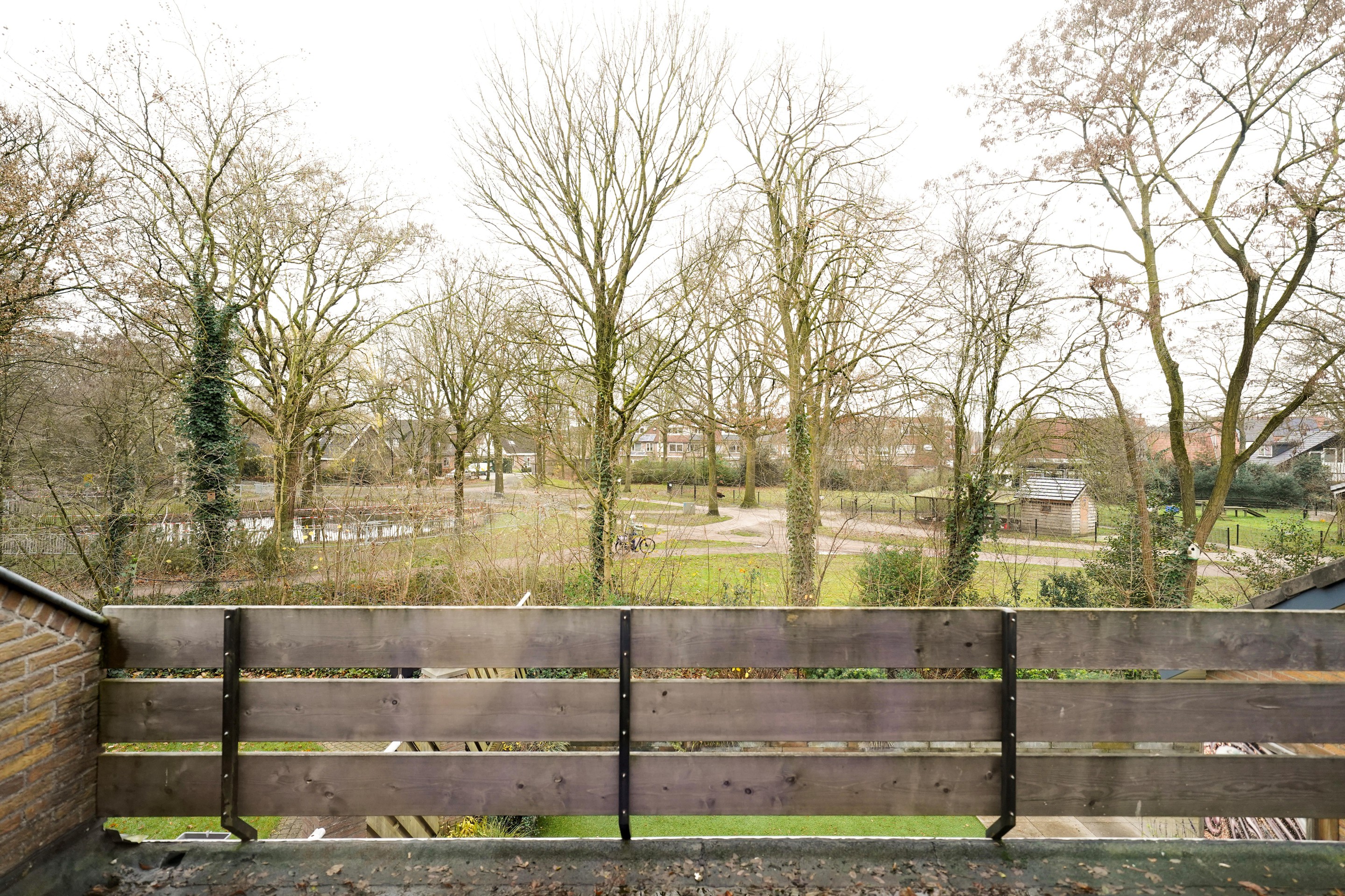 We lopen weer naar binnen waar we via de mooie open trap naar de eerste verdieping lopen. Hier zijn 3 grote slaapkamers, allemaal voorzien van handige inbouwkast. De ouderslaapkamer is aan de achterzijde gelegen en heeft ook een ruim balkon. Hier kijk je ook prachtig over het park uit. De badkamer is keurig en neutraal ingericht, voorzien van een ligbad, mooie wastafelmeubel, inloopdouche met glazen deur en toilet. Deze ruimte is ook voorzien van vloerverwarming.