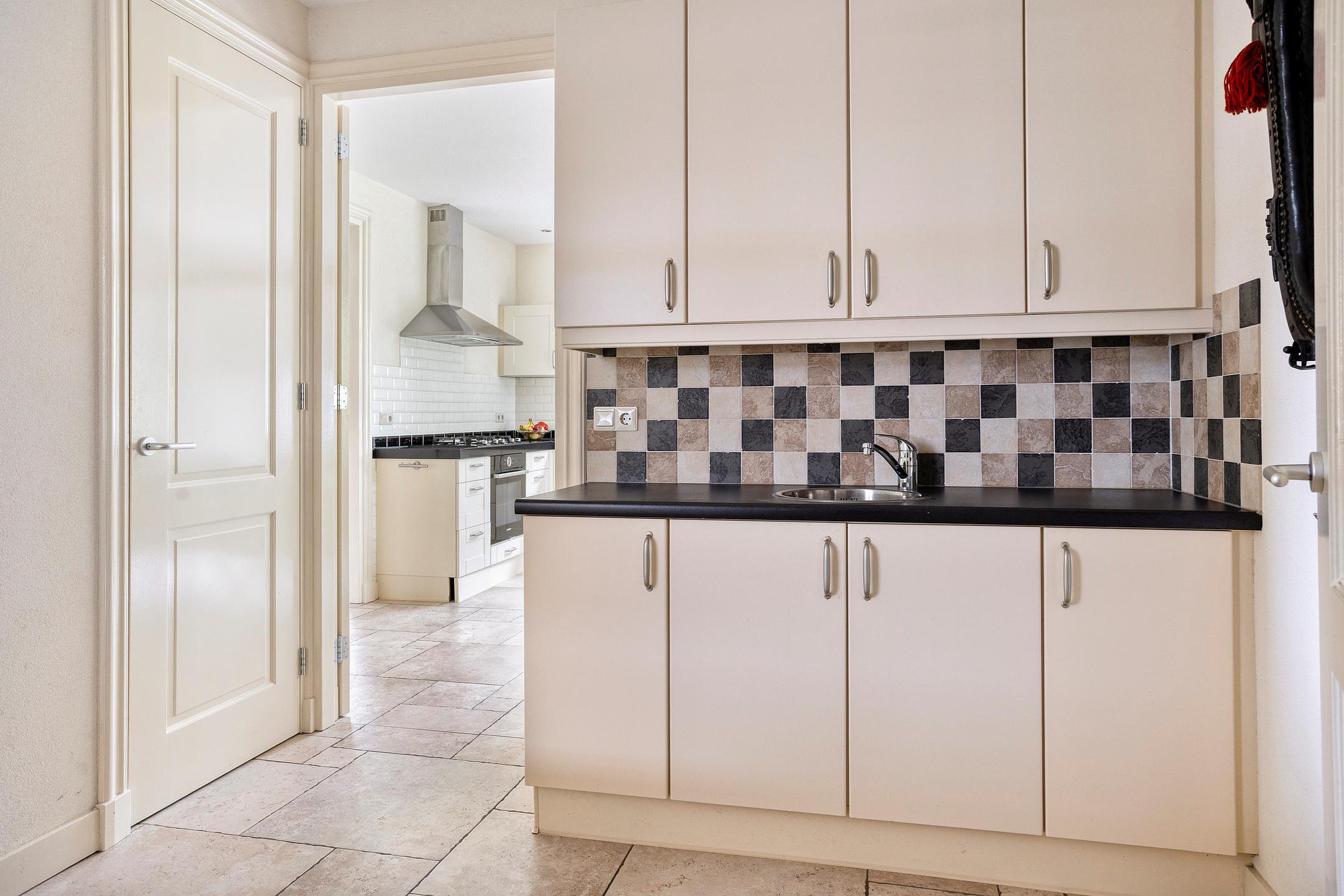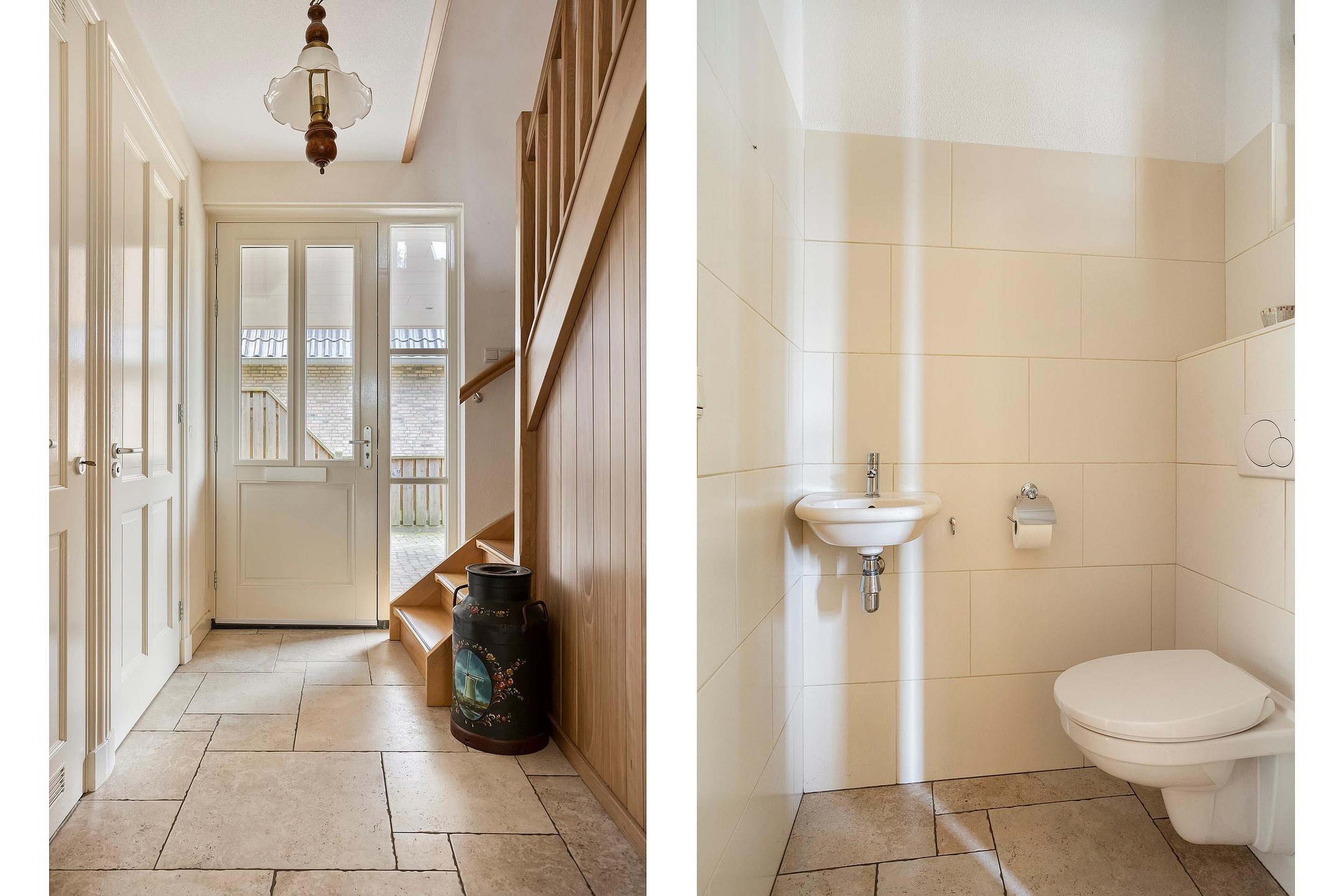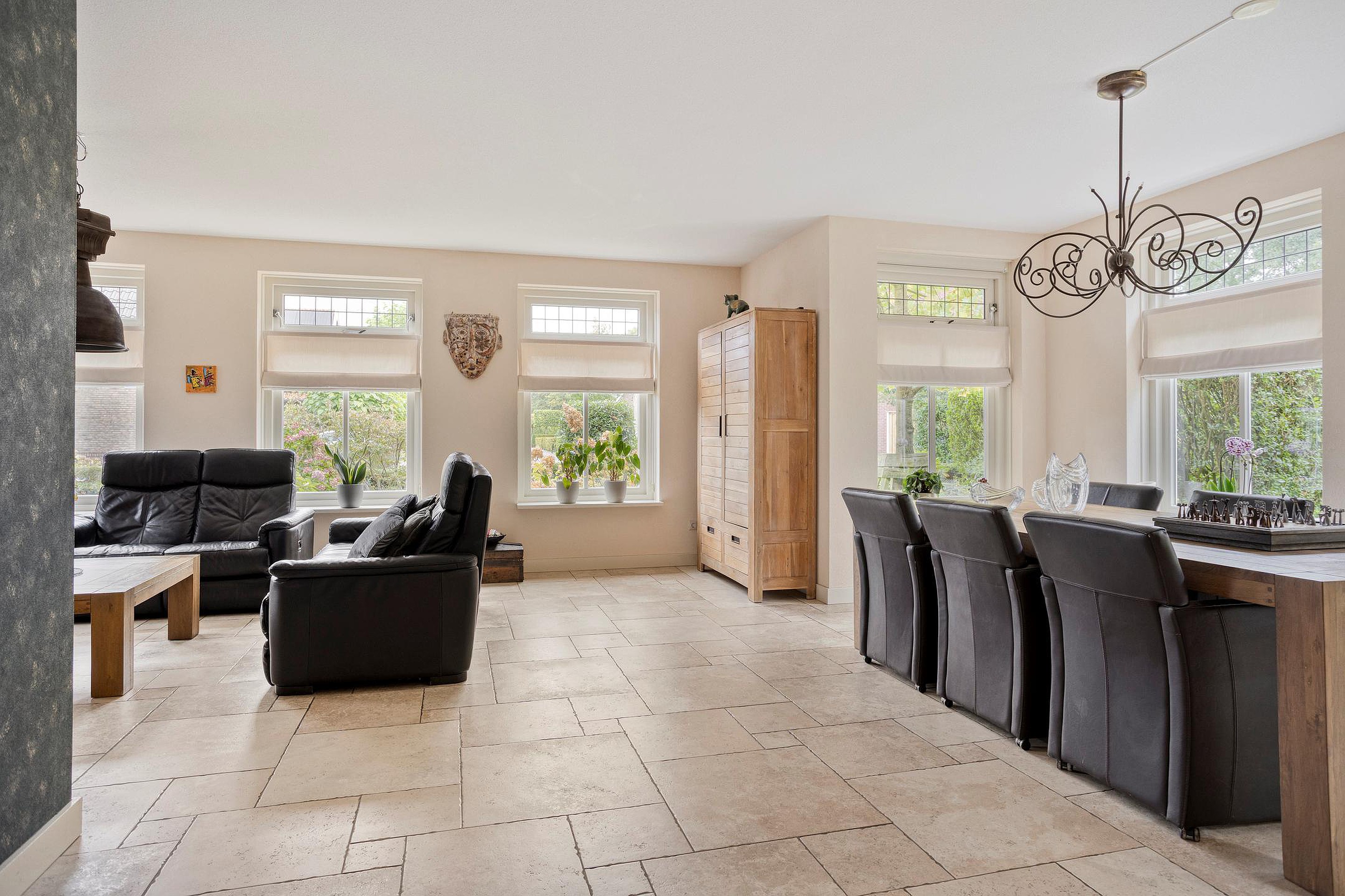 overdekte entree met lichte hal waar het toilet en trapkast gesitueerd zijn. Aansluitend de royale woonkamer met sfeervolle haard en ruimte voor een eethoek in de erker, welke een prachtig uitzicht geeft op de tuin. De ruime leefkeuken bevat een keuken met luxe inbouwapparatuur en tuindeuren welke toegang geven tot het terras en tuin. Vanaf de keuken is de werk-/slaapkamer bereikbaar als ook de bijkeuken met keukenblok. Van hieruit toegang tot de garage.