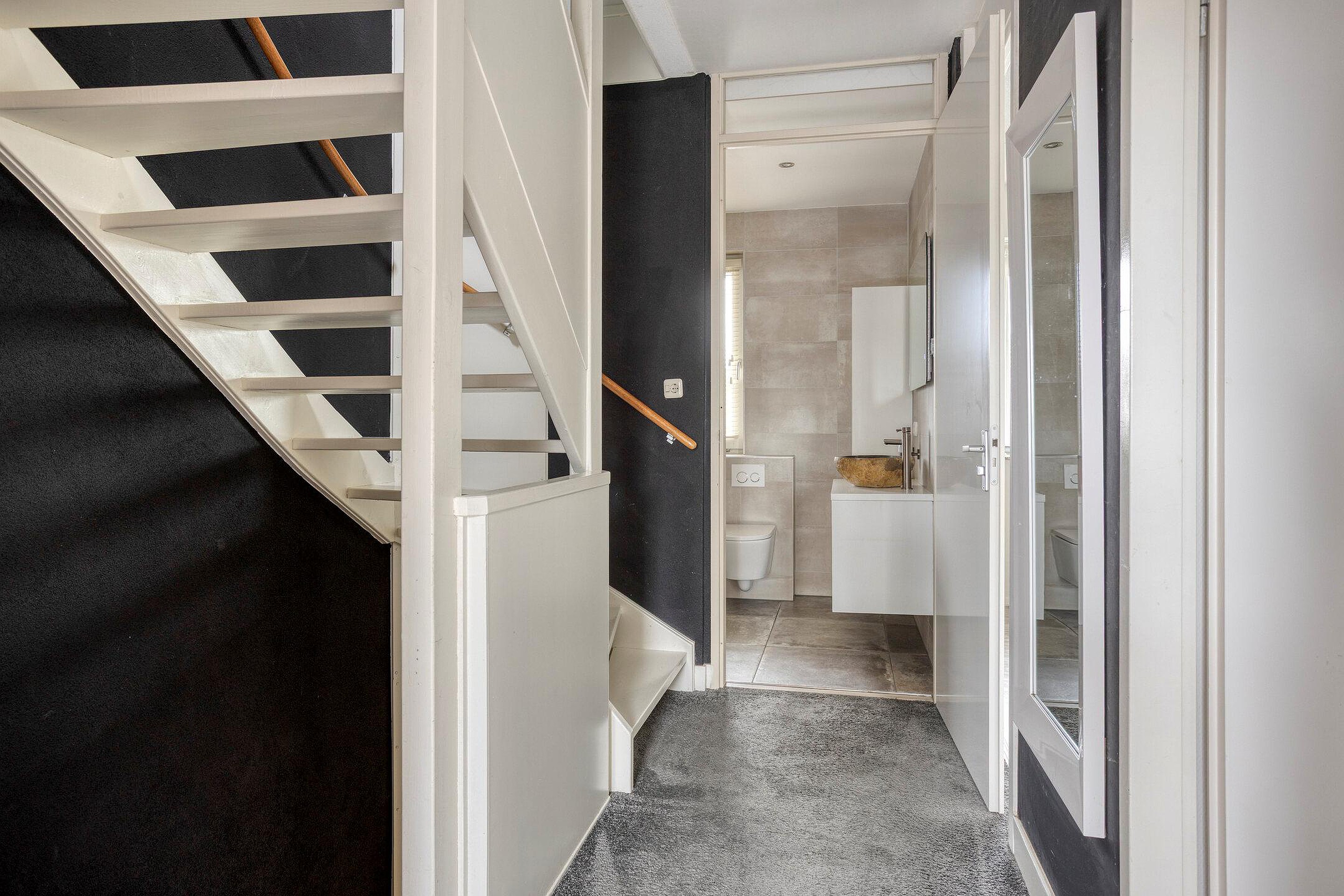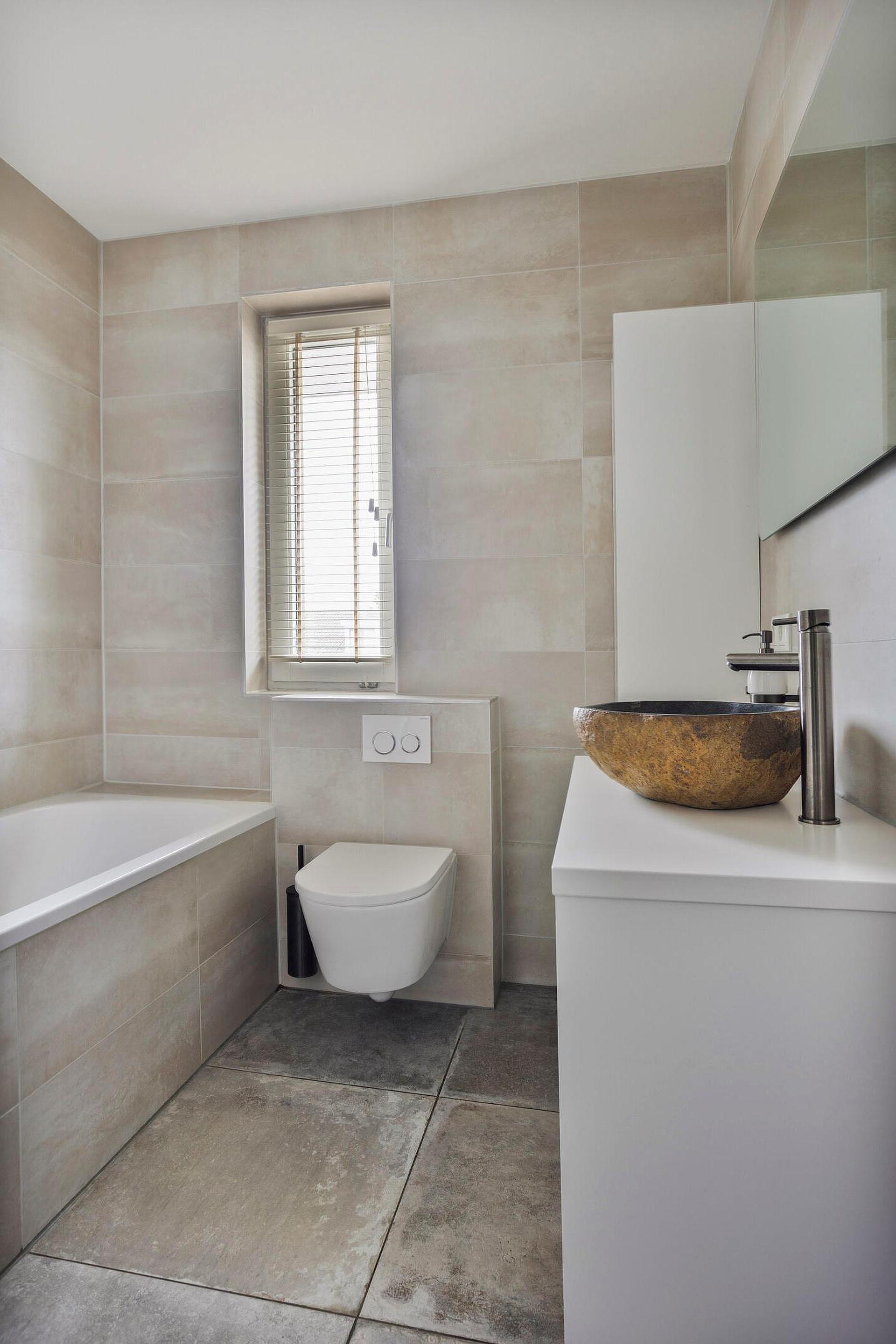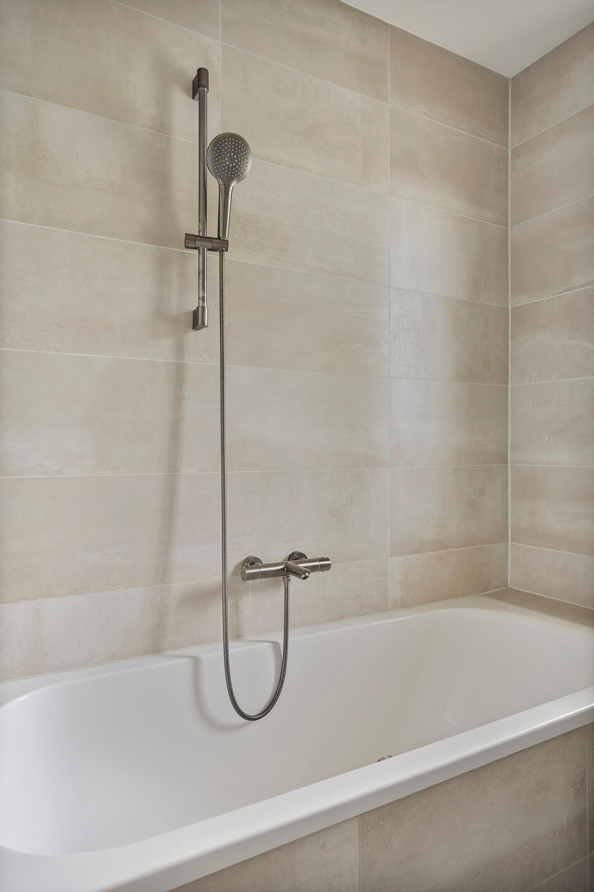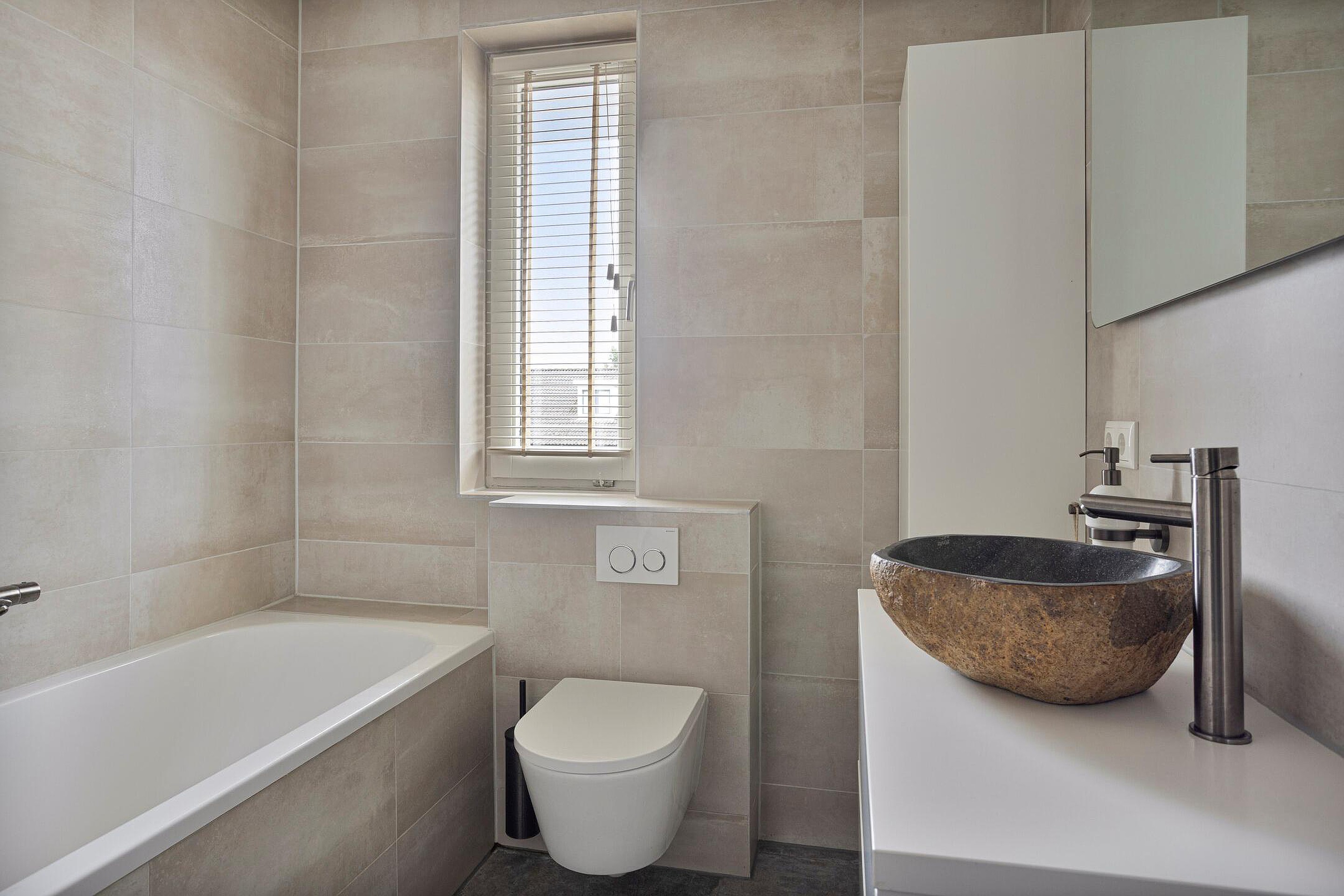 Een moderne badkamer completeert deze verdieping. De ruimte is geheel betegeld en voorzien van een ligbad met douche, een wastafelmeubel en een zwevend toilet. De strakke afwerking en het neutrale kleurgebruik maken dit tot een fijne plek waar u zich dagelijks comfortabel kunt verzorgen.