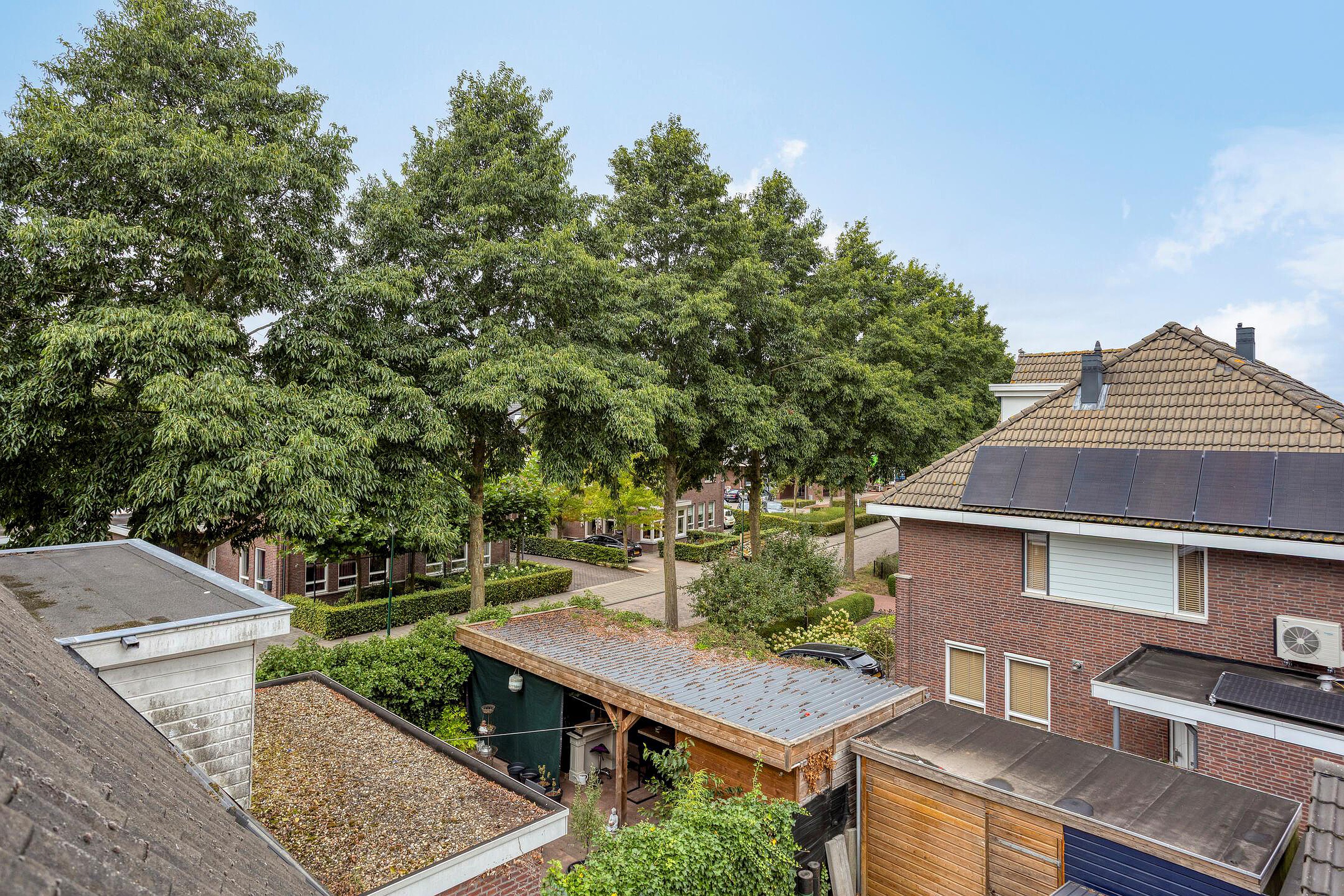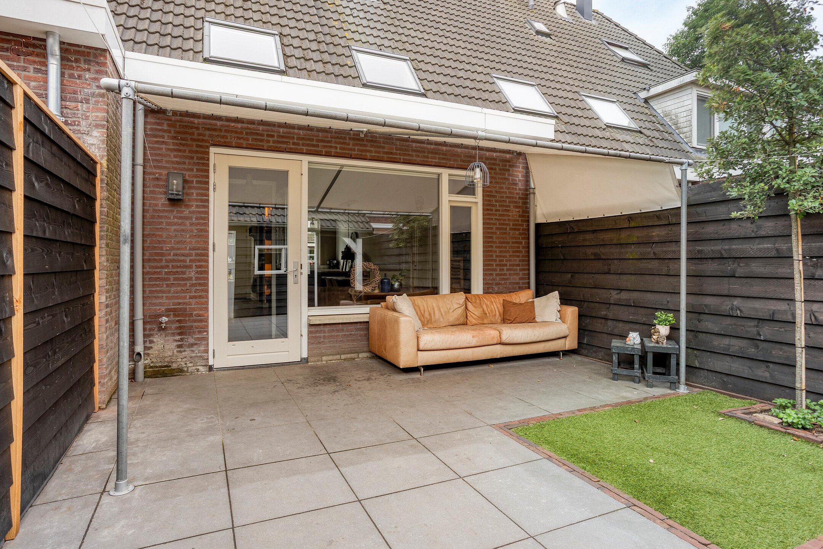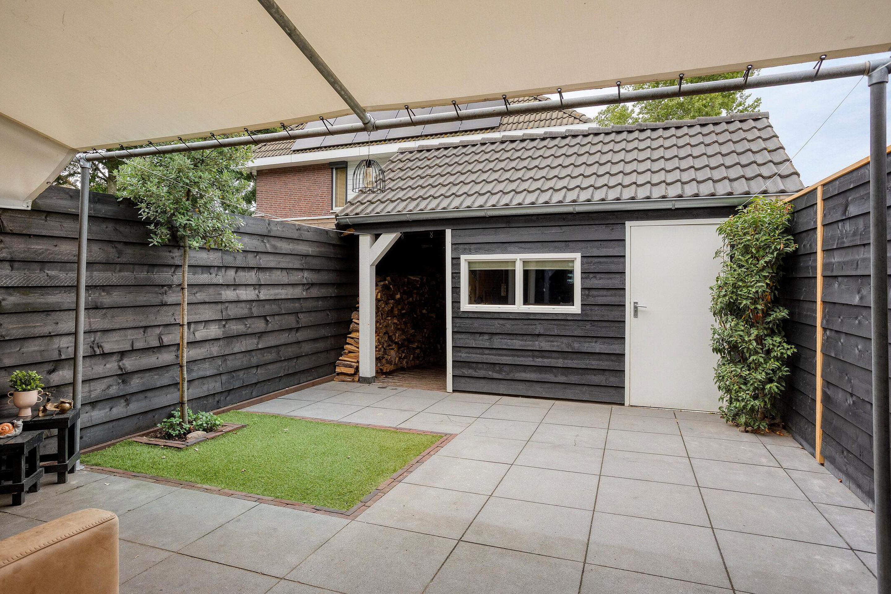Een onderhoudsarme en zonnige achtertuin is te bereiken vanuit de woonkamer. De tuin is grotendeels bestraat en biedt volop ruimte voor een lounge- of tuinset, zodat u in de zomer heerlijk buiten kunt genieten. Achterin de tuin bevindt zich een ruime berging met overkapping, ideaal voor het stallen van fietsen of het opbergen van tuingereedschap.