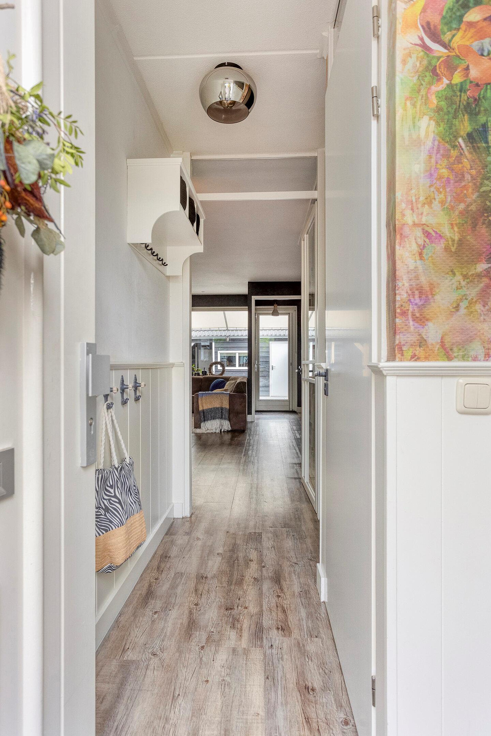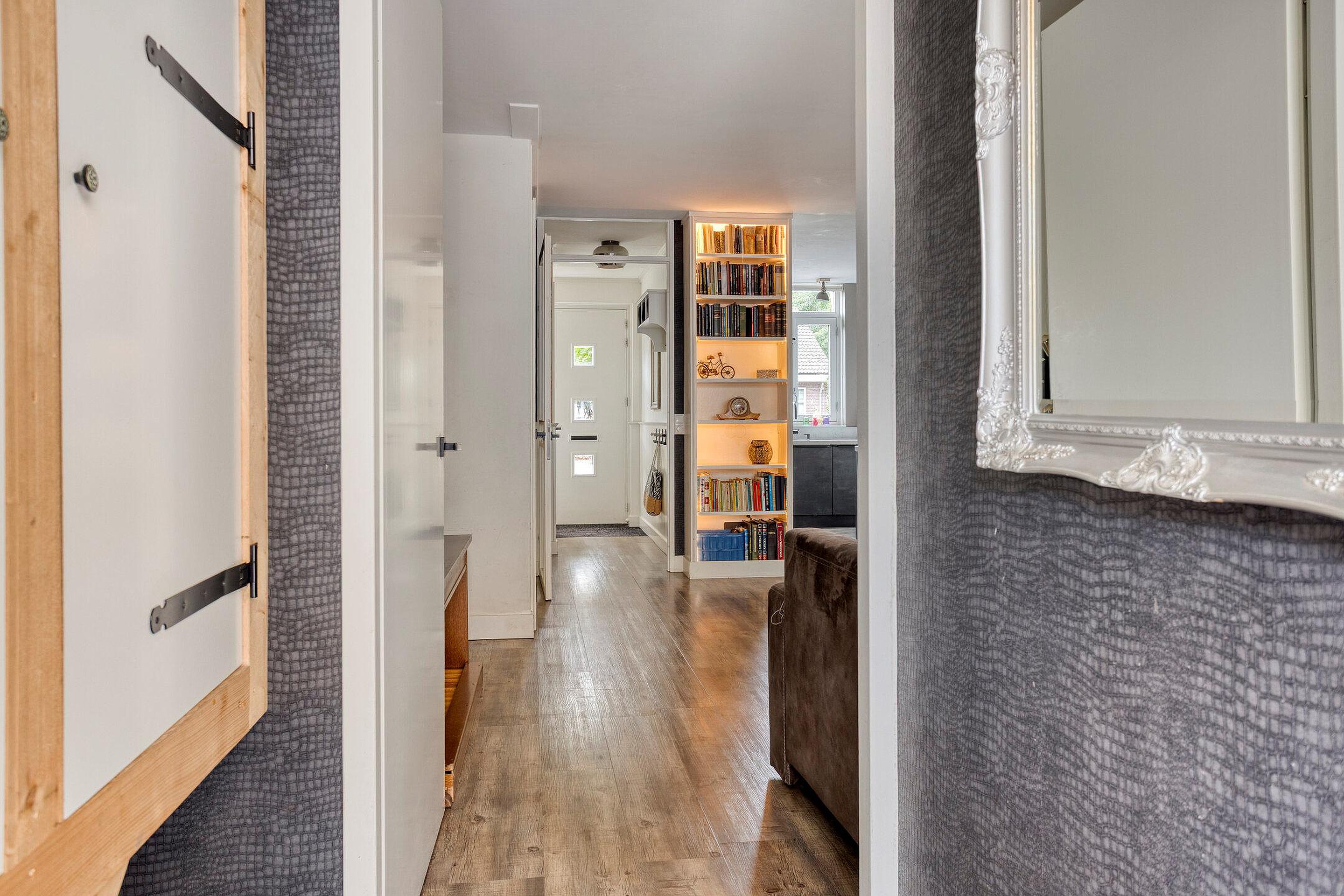 Een eigen oprit met aangrenzende voortuin leidt naar de entree van de woning. Binnenkomst is in de hal, waar u toegang heeft tot het toilet, de trap naar de eerste verdieping en de woonkamer. De ruimte biedt plaats voor een kapstok of opbergmeubel, waardoor u hier meteen een nette en praktische ontvangst creëert.