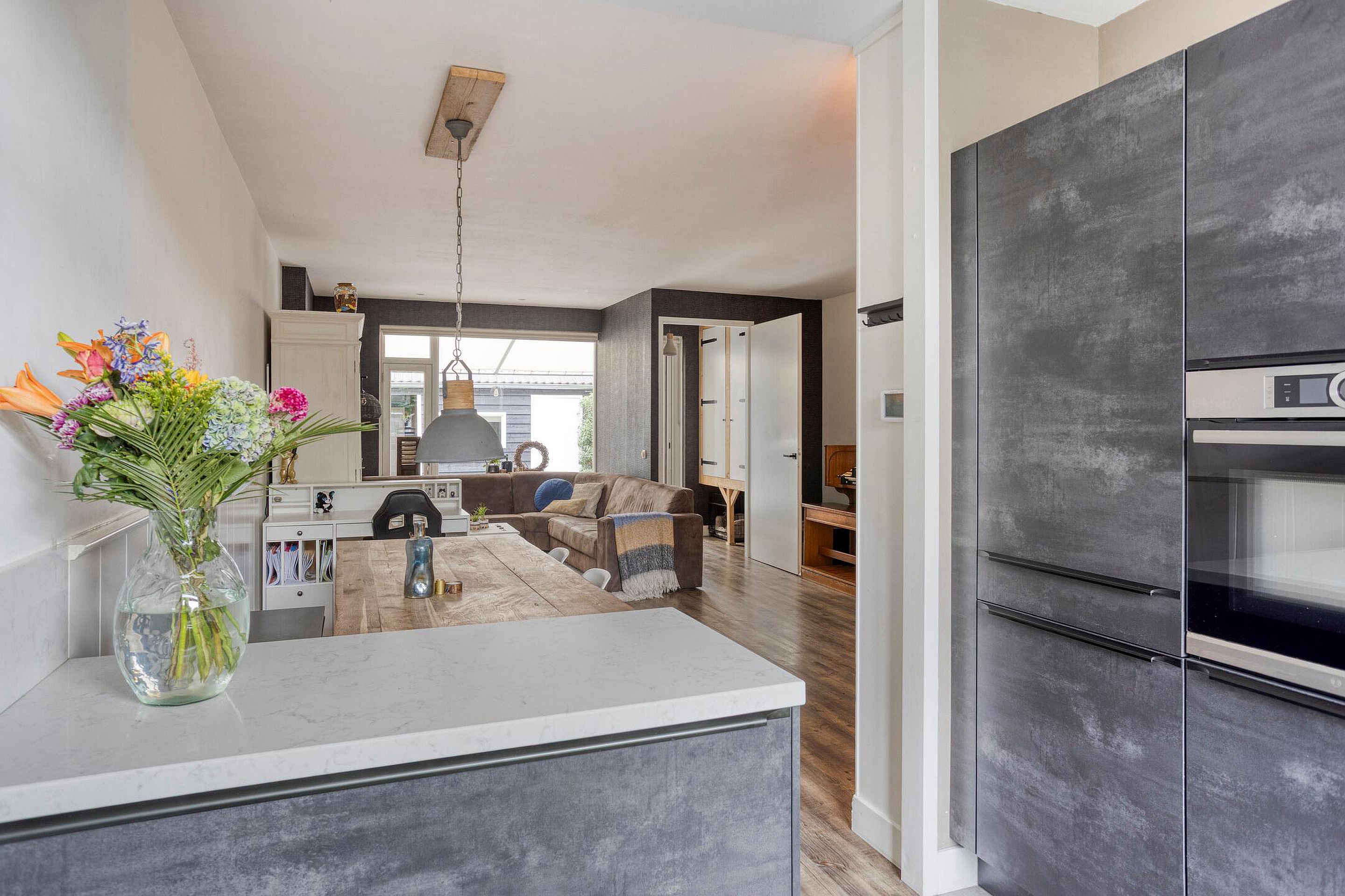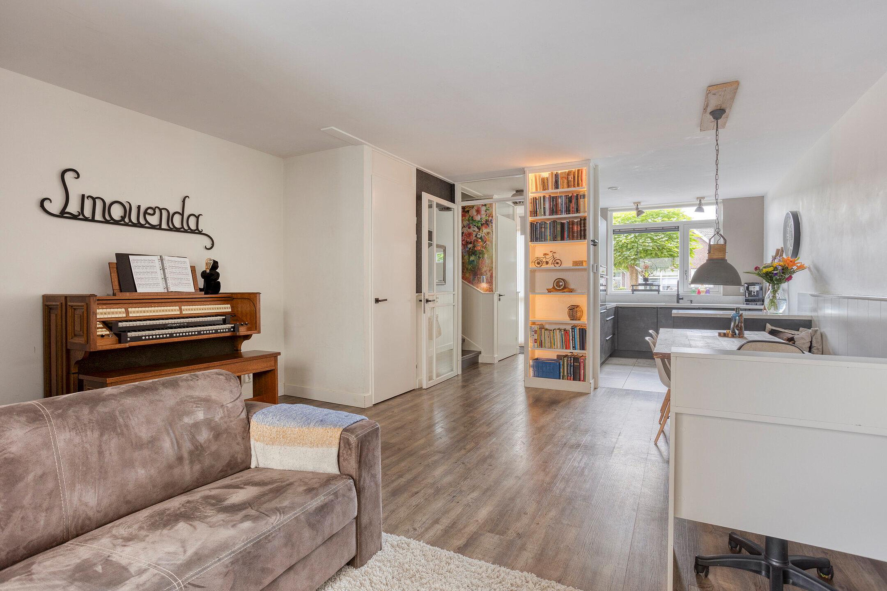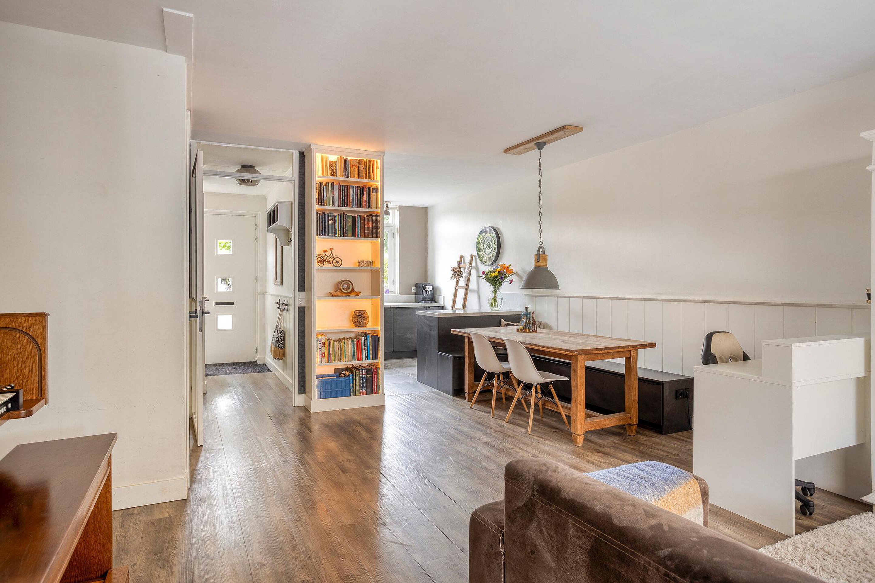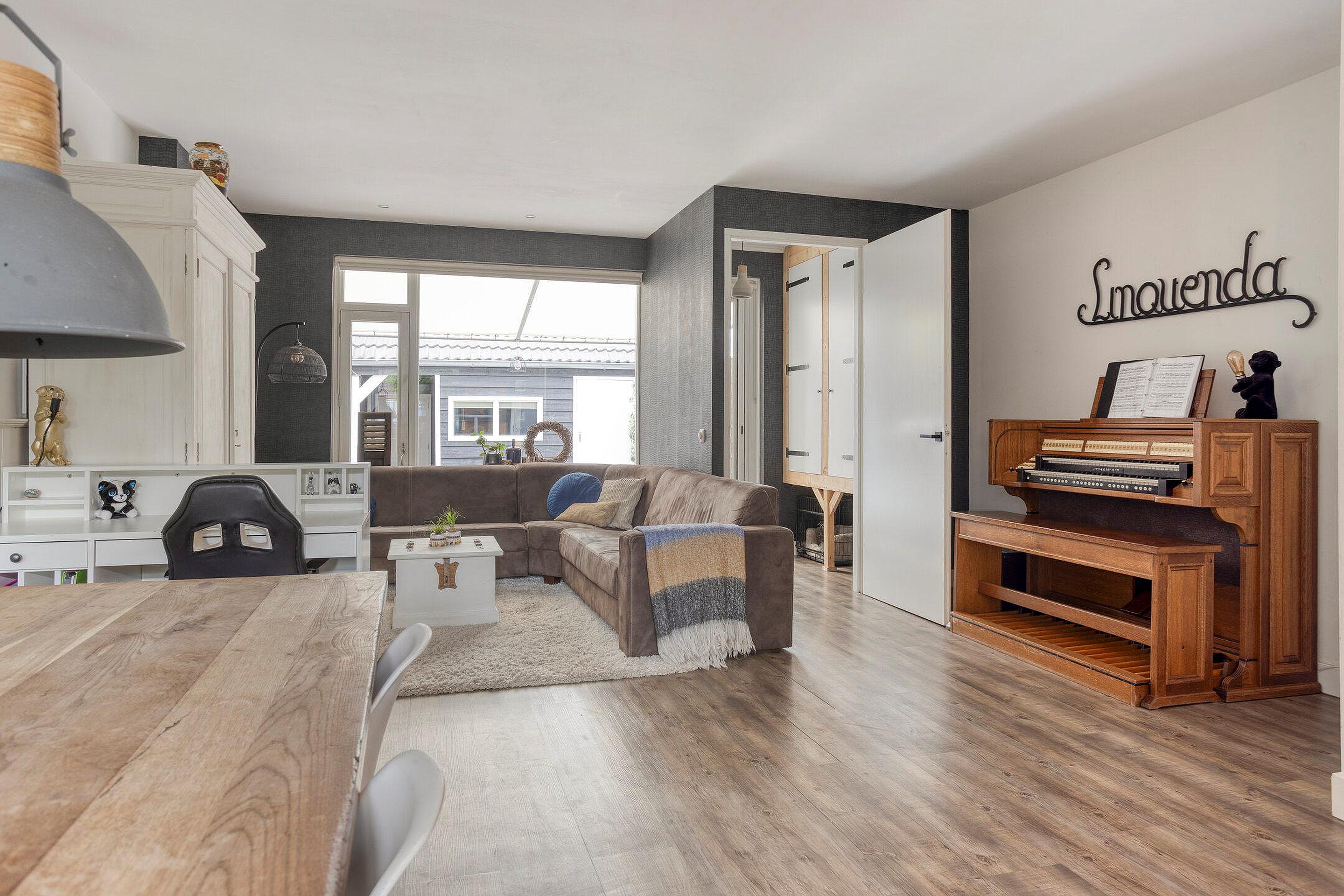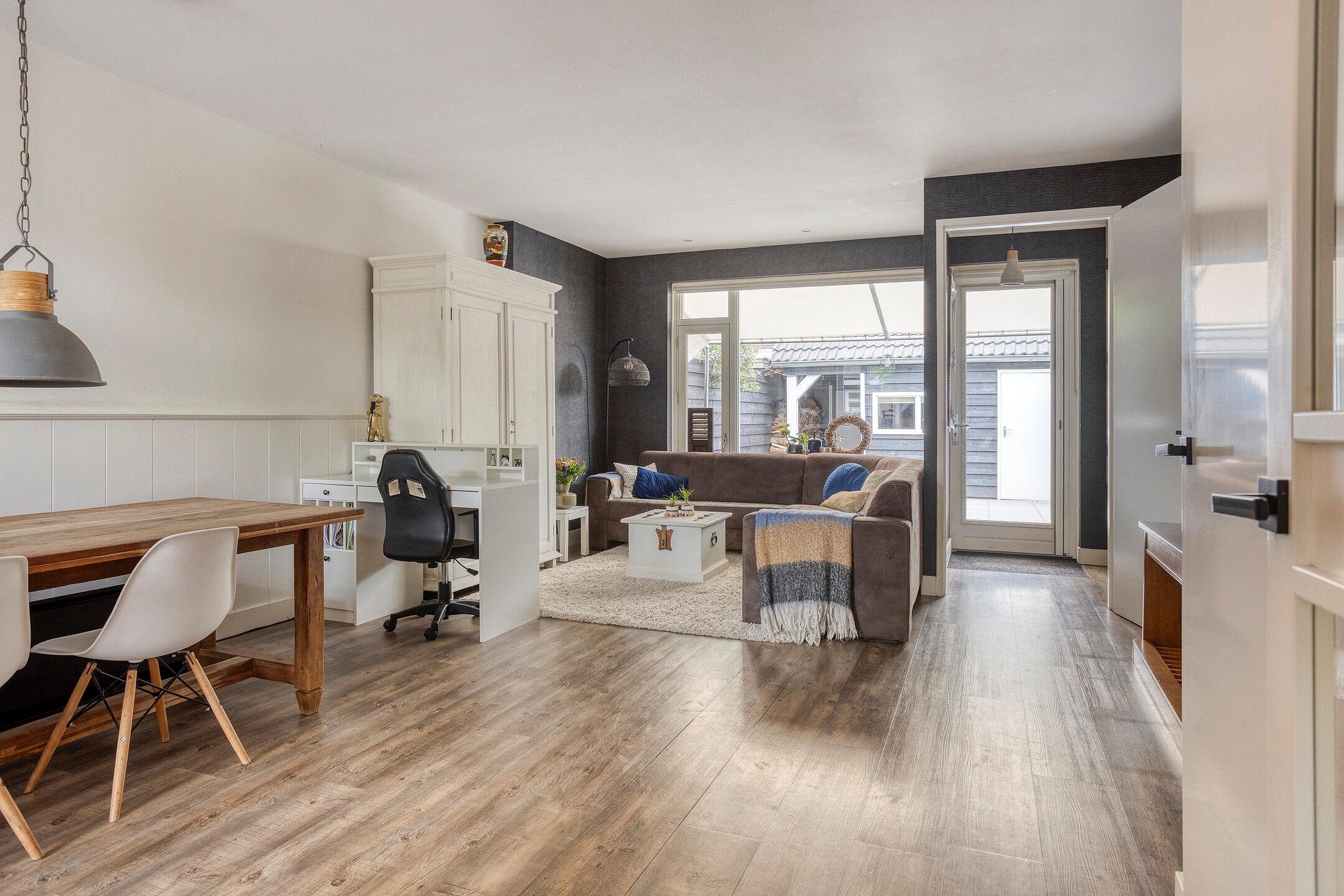 De woonkamer vormt het centrale hart van het huis en valt direct op door de open indeling en de overvloed aan lichtinval. Grote raampartijen zorgen voor een ruimtelijk gevoel en bieden uitzicht op de tuin. Er is meer dan genoeg ruimte om een comfortabele zithoek en een gezellige eethoek te creëren. Aan de achterzijde geeft een extra hal toegang tot de zonnige tuin, waardoor binnen en buiten mooi met elkaar verbonden zijn.