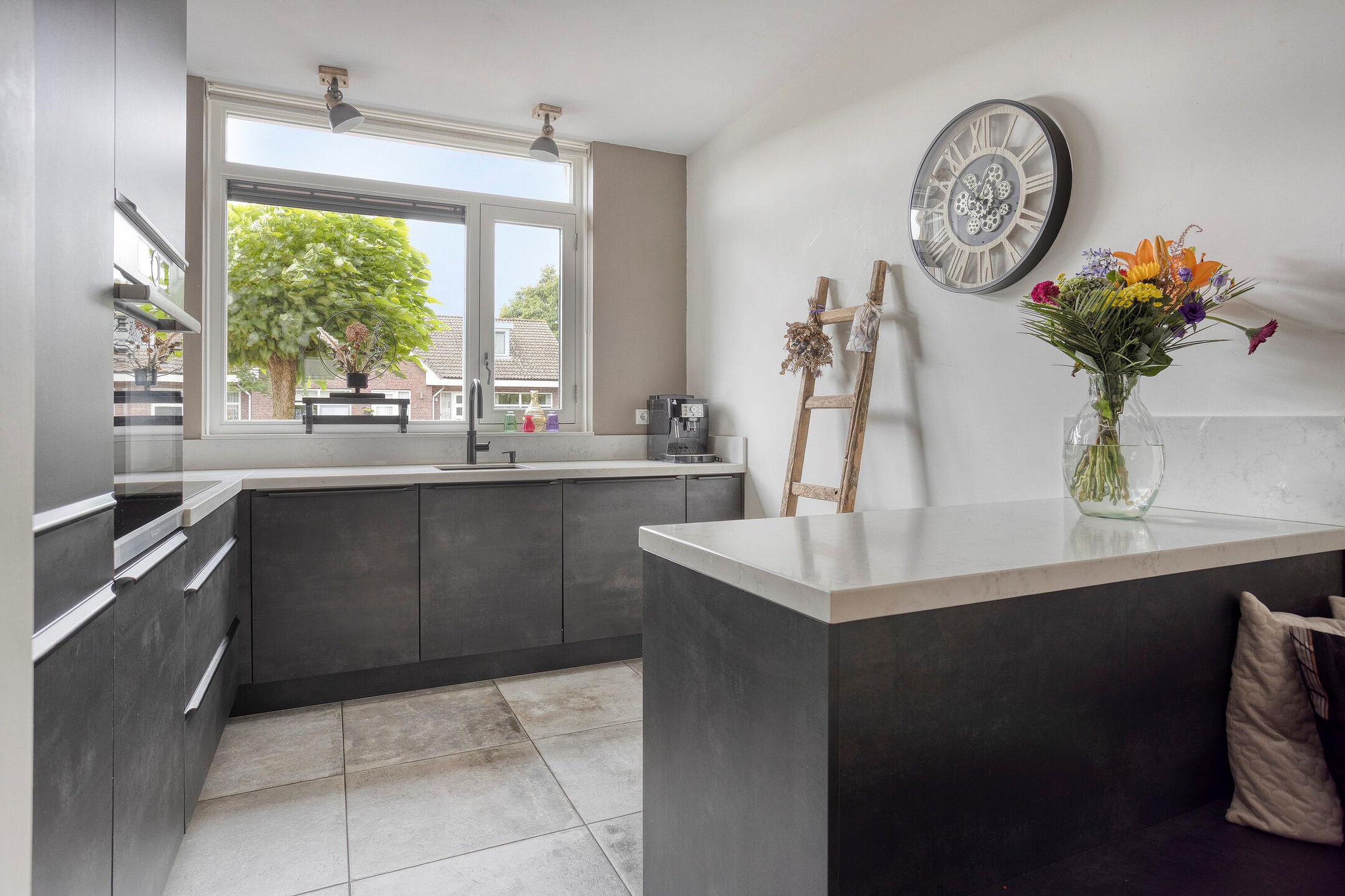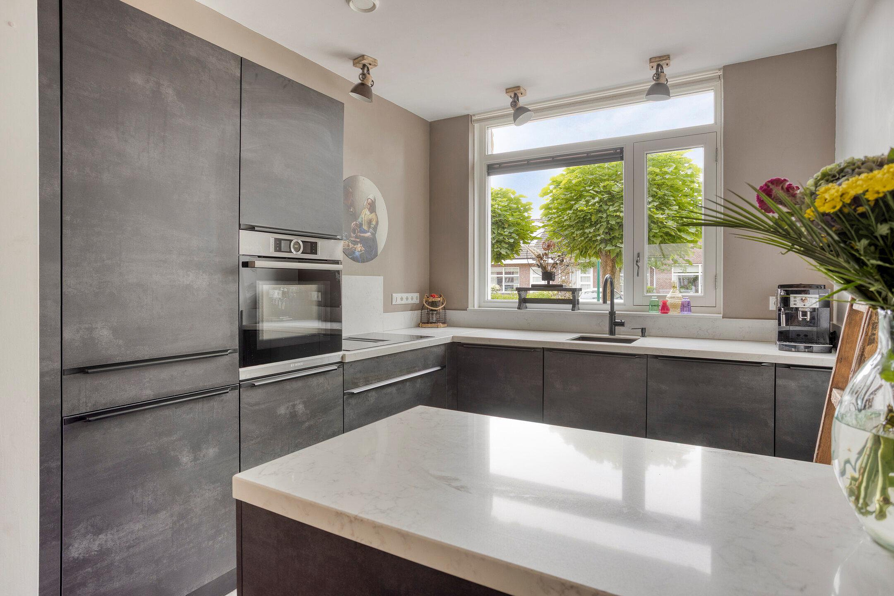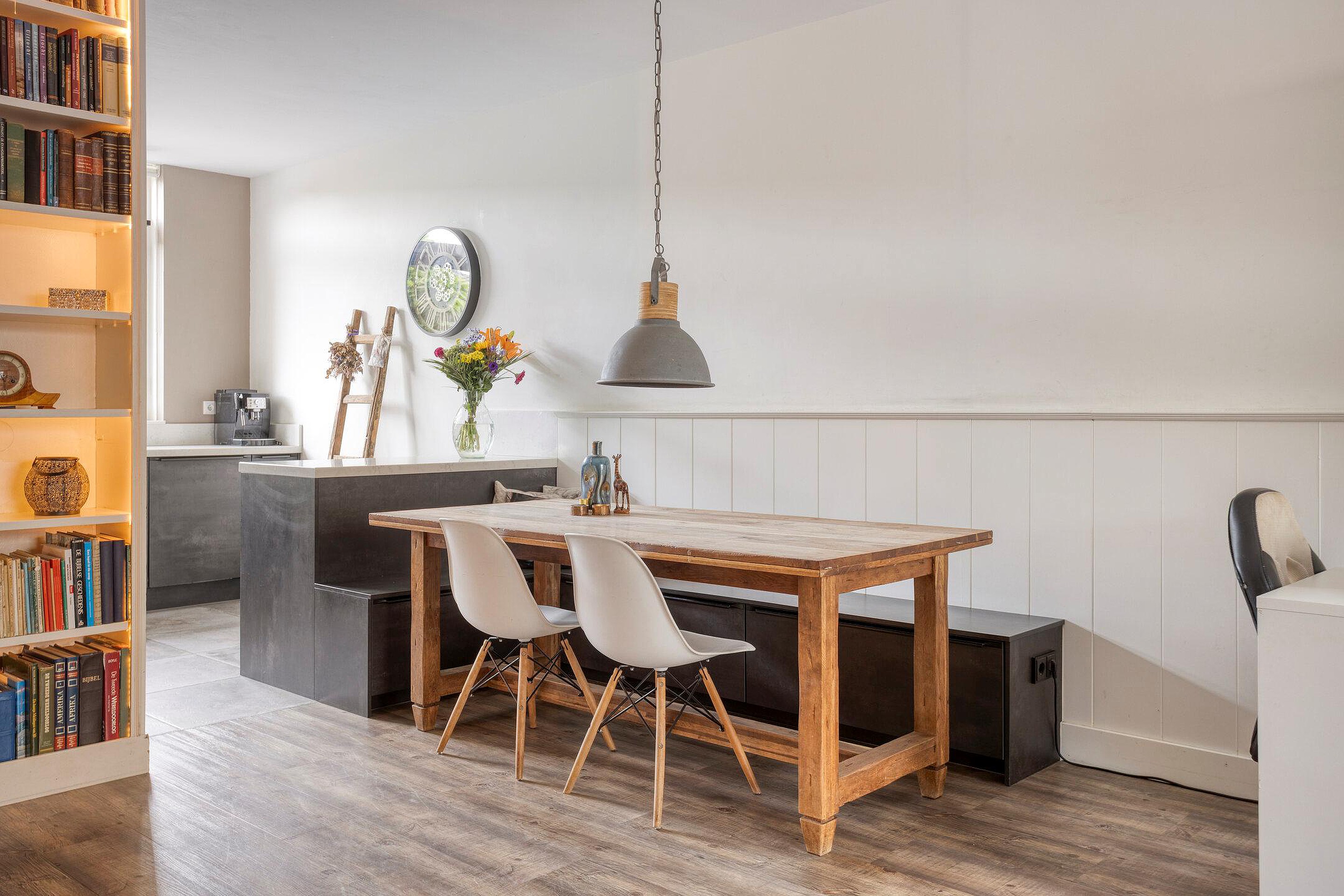 Een moderne keuken bevindt zich aan de voorzijde en sluit naadloos aan op de woonkamer. Dankzij de L-vormige opstelling beschikt u over veel werk- en opbergruimte, compleet met inductiekookplaat en geïntegreerde afzuiging, een vaatwasser, oven en koelkast. Het barretje nodigt uit tot een snelle kop koffie in de ochtend of een gezellige borrel tijdens het koken.