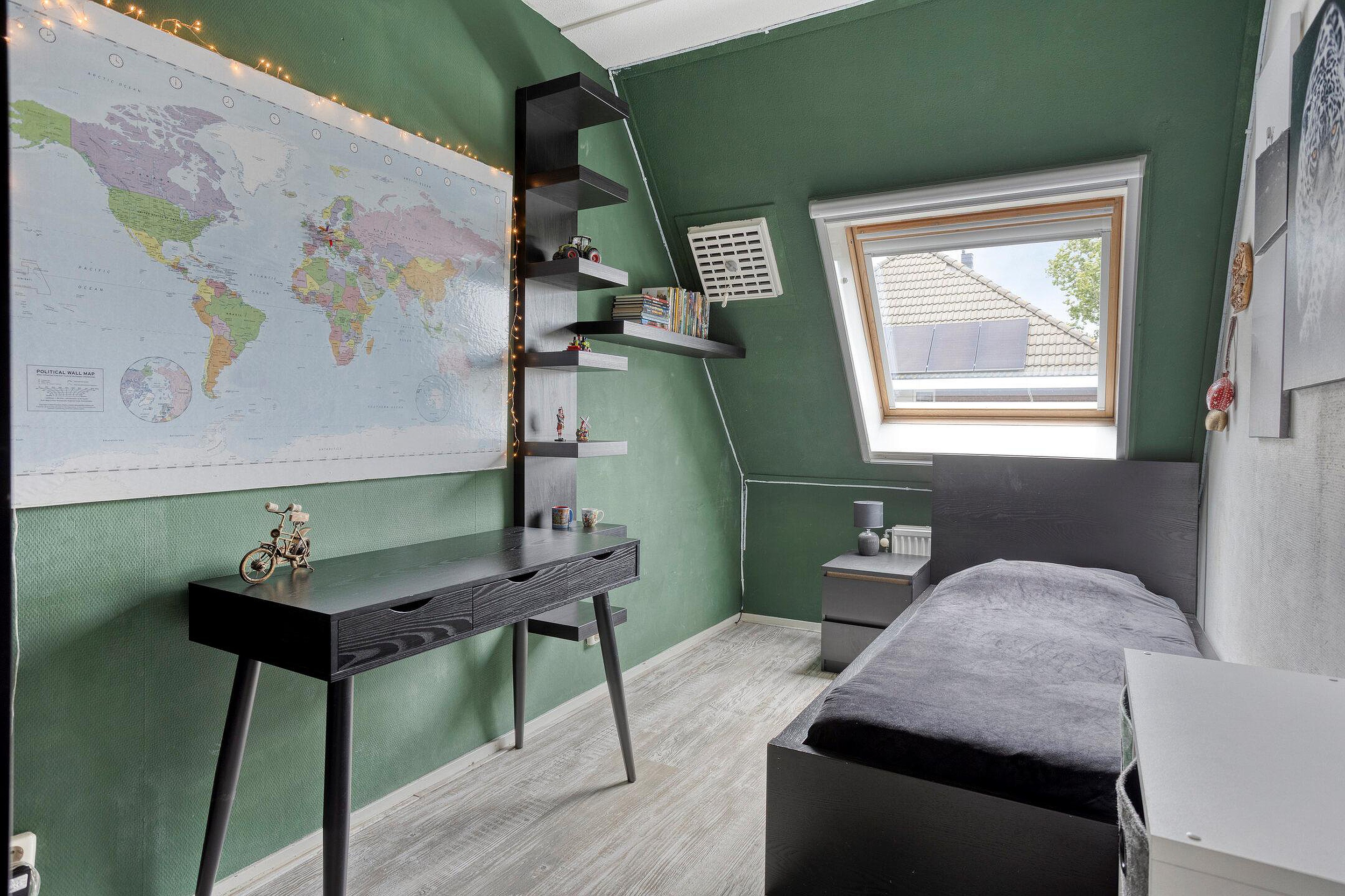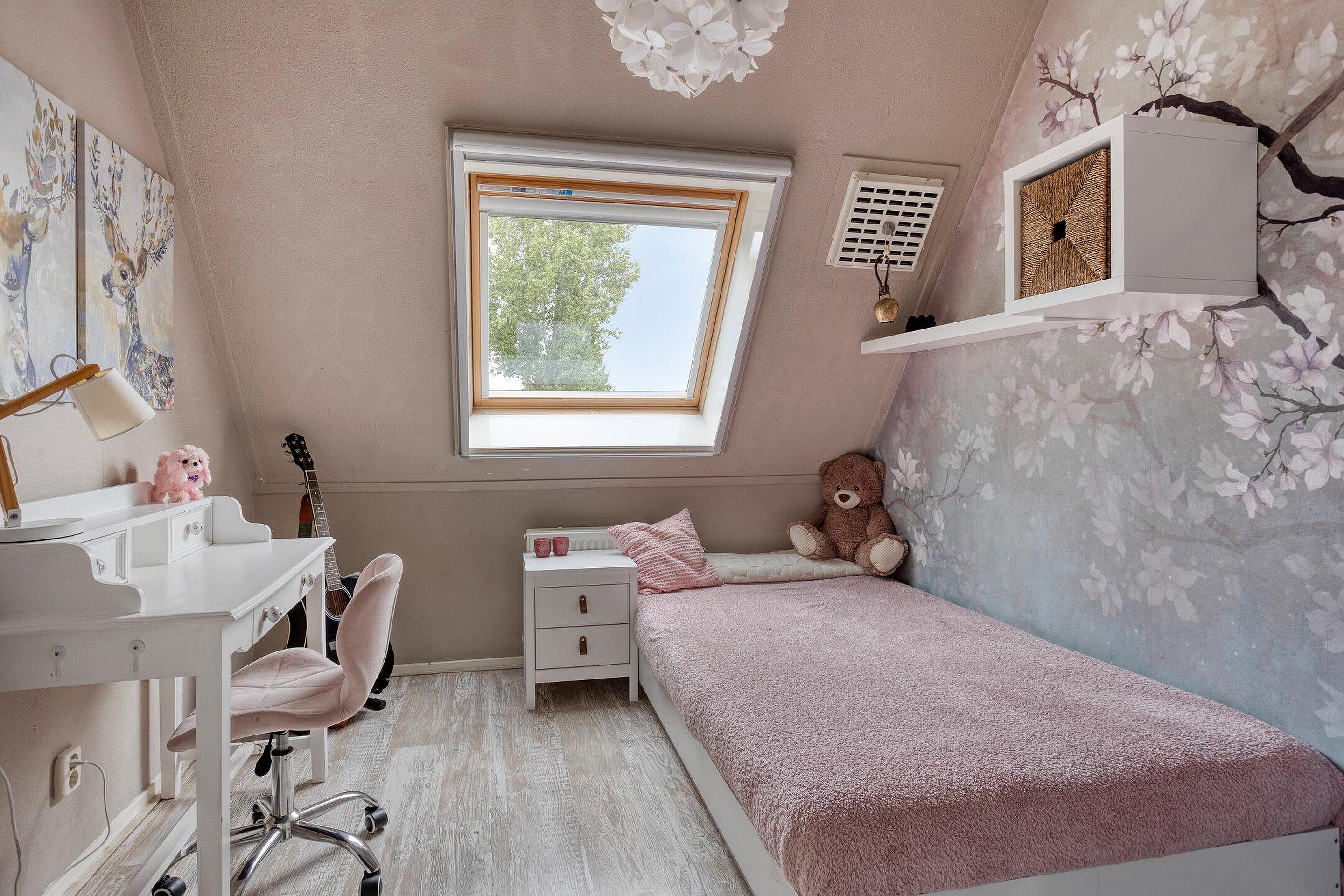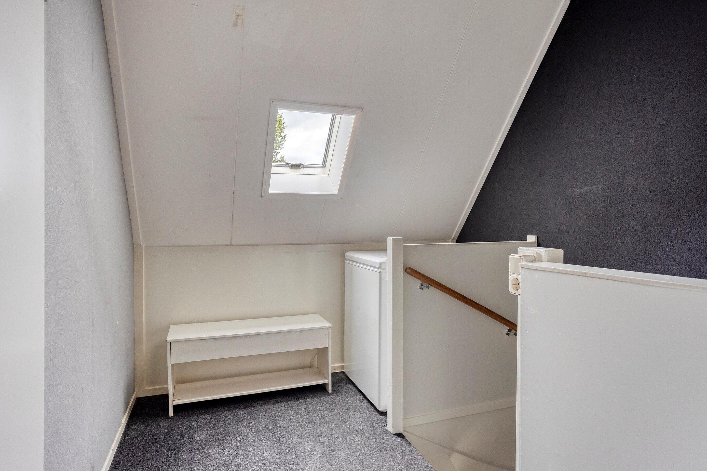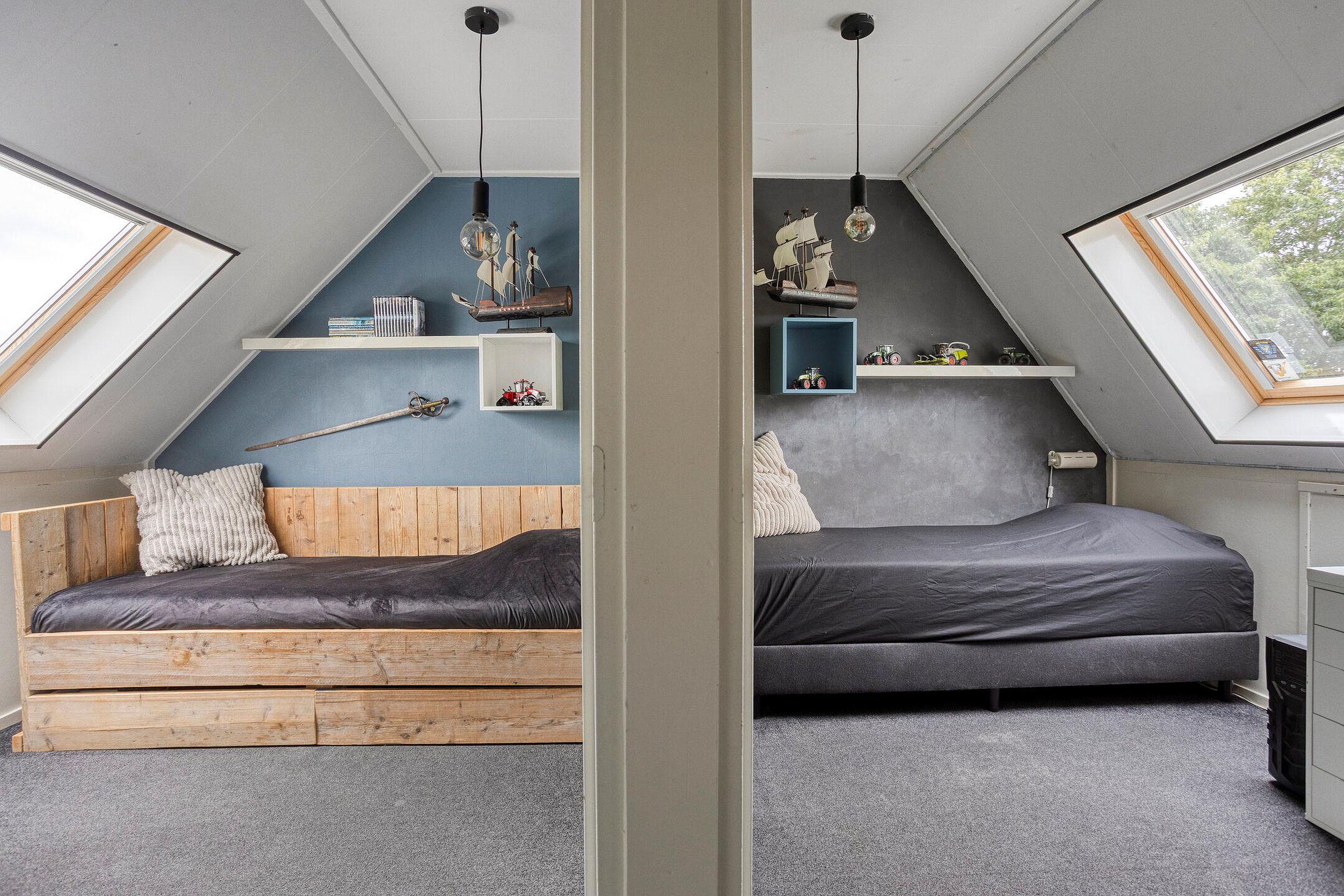 De slaapkamers op deze verdieping zijn goed onderhouden en verrassend ruim, ondanks de schuine wanden. Dankzij de dakramen komt er veel daglicht binnen en is er voldoende stahoogte, waardoor de ruimtes uitstekend geschikt zijn als slaapkamer, werkkamer of hobbyruimte.