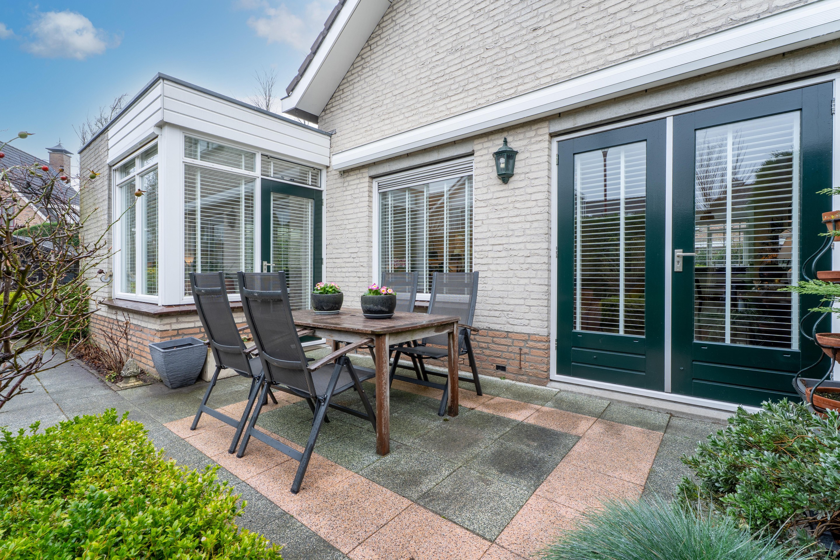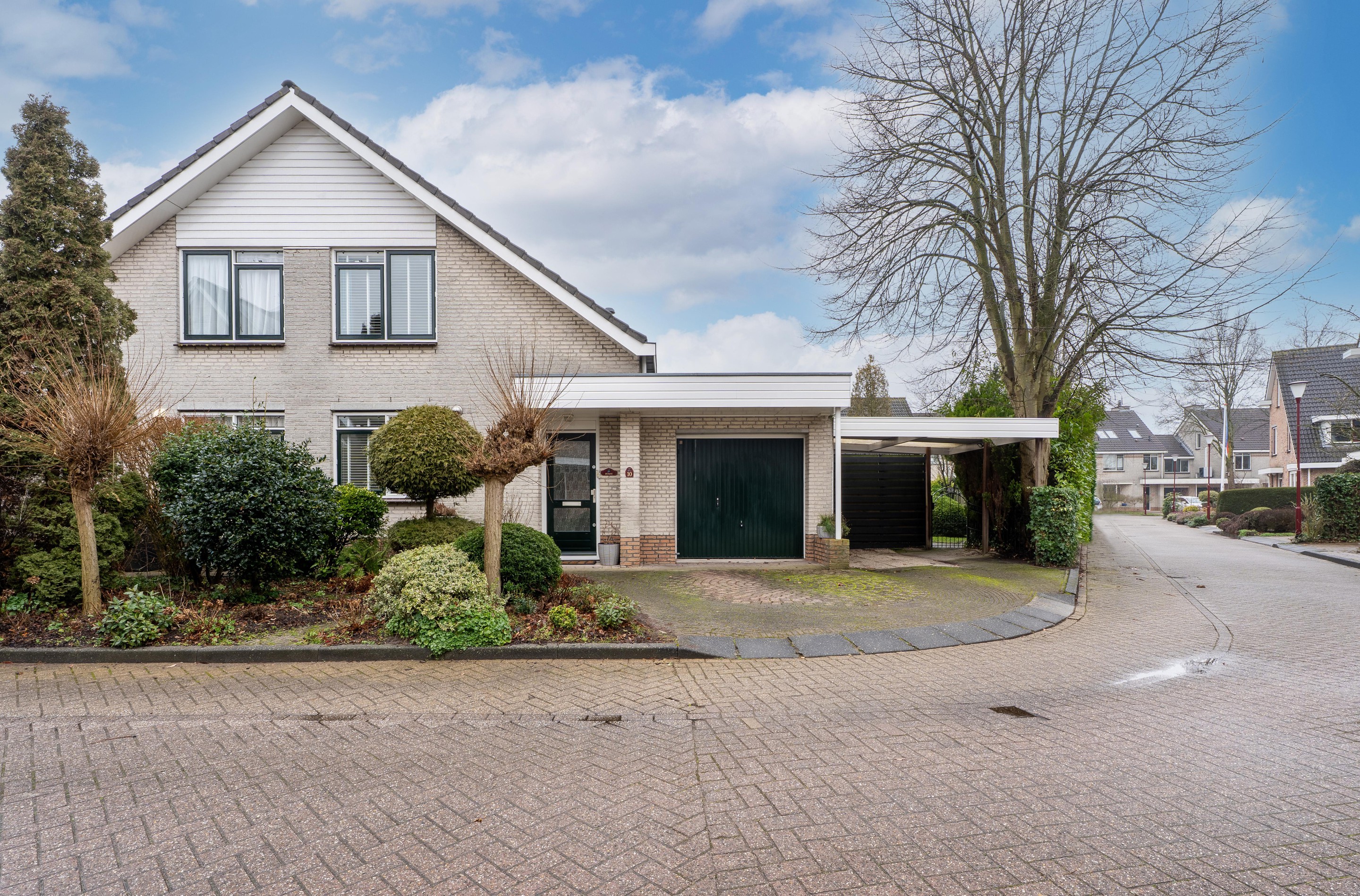Via het rustige hofje, dat uitsluitend toegankelijk is voor bestemmingsverkeer, bereik je de woning. Aan de voorzijde bevindt zich de dubbele oprit, waardoor je altijd kunt parkeren op eigen terrein. Vanaf de oprit is tevens de garage bereikbaar, welke is ingedeeld in een berging en een praktisch thuiskantoor.