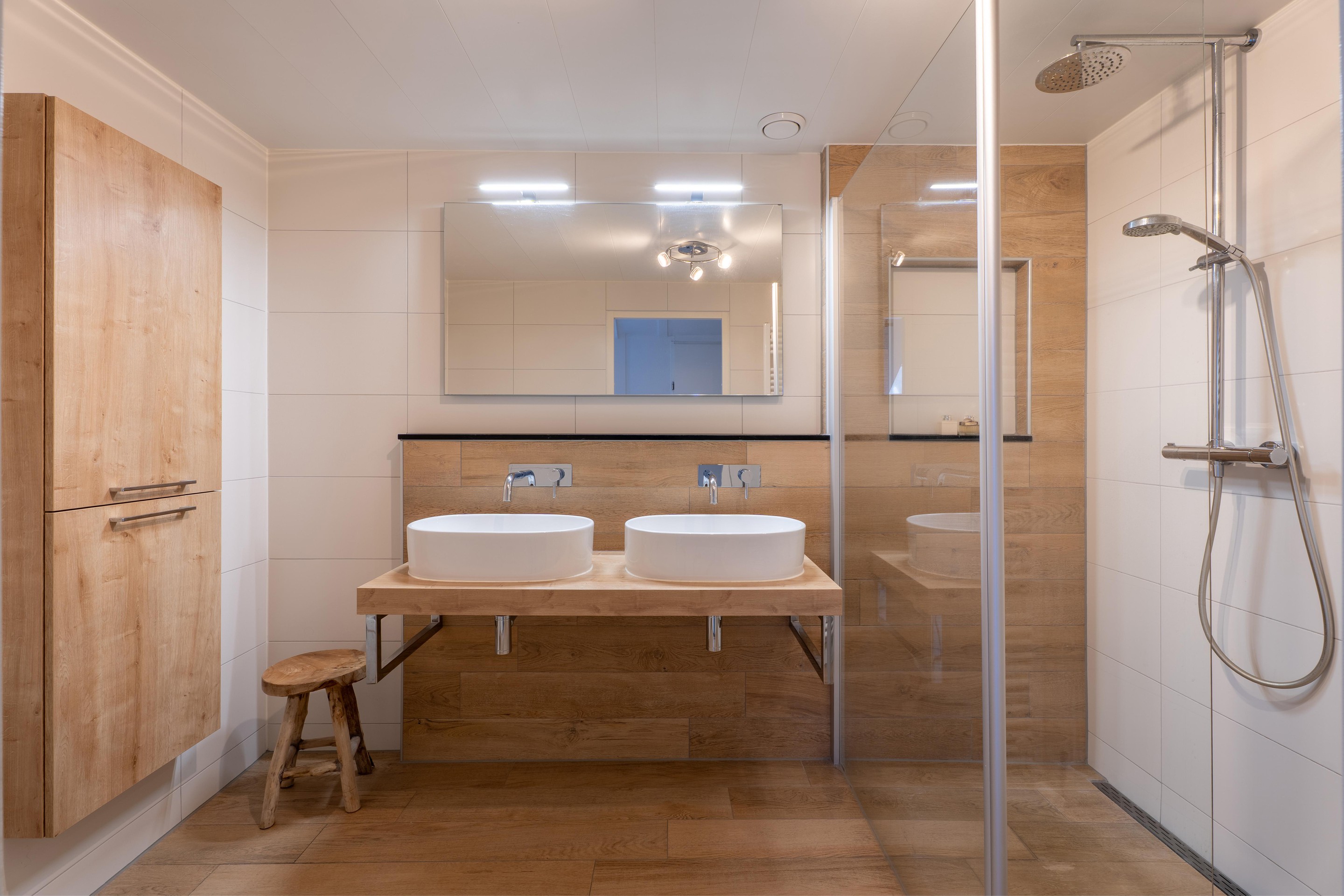 De moderne badkamer is geheel betegeld en uitgerust met een ruime inloopdouche, een wastafelmeubel met dubbele wastafel en een hangend toilet.