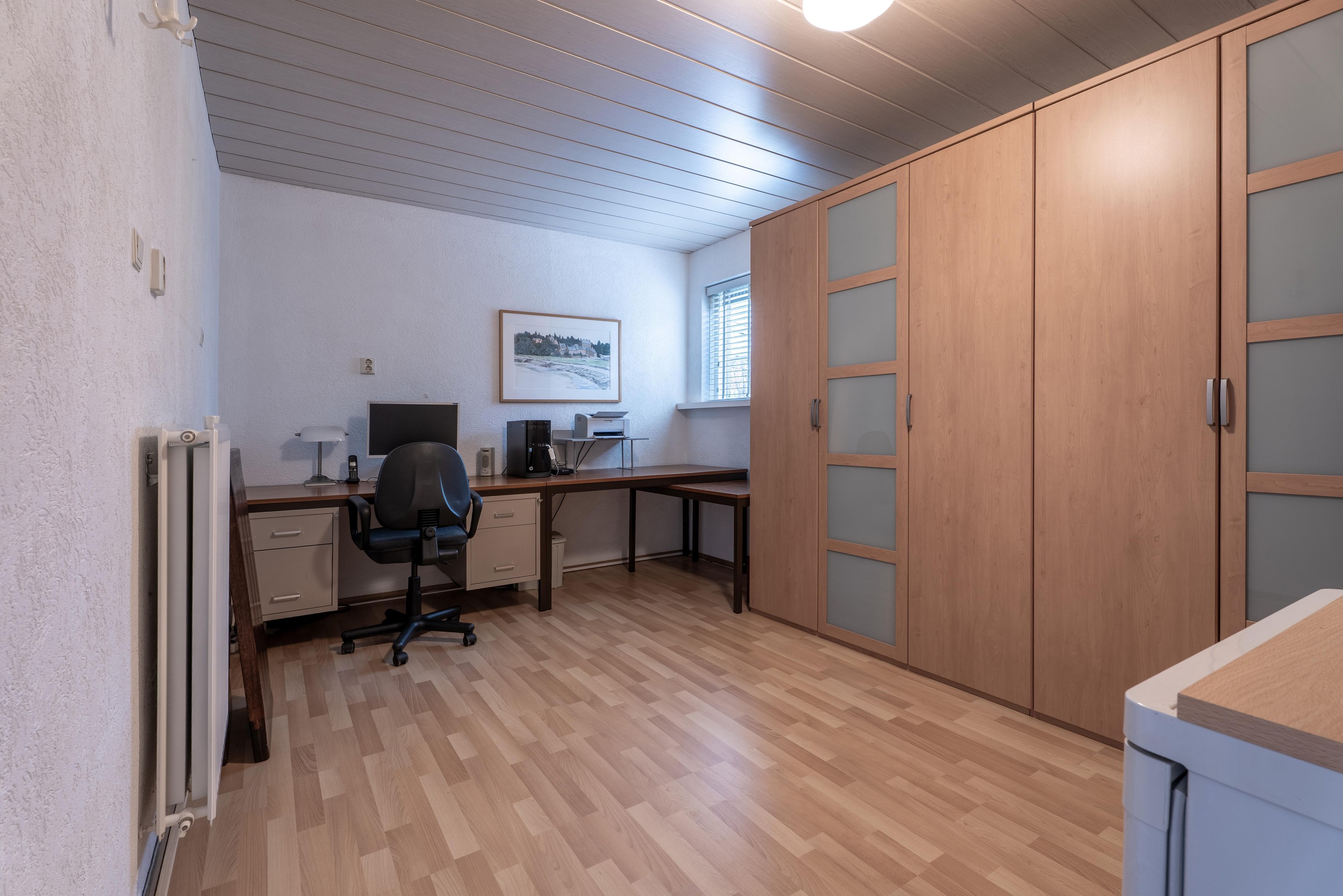 De voormalige garage is omgetoverd tot een volwaardig thuiskantoor, voorzien van een plavuizen vloer, extra isolatie en een raam voor prettig daglicht.
