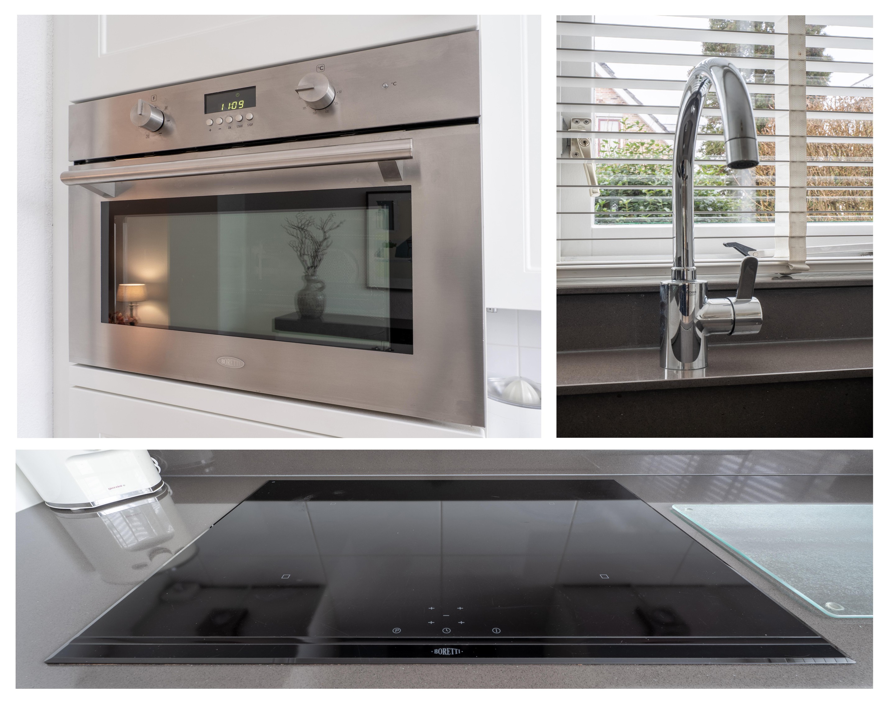 Terug in de woning bereik je aan de voorzijde de landelijke keuken. De keuken biedt voldoende opbergruimte en is uitgerust met een koel-vriescombinatie, 4-pits inductiekookplaat, combi-oven, vaatwasser en een close-in boiler voor direct warm water.
