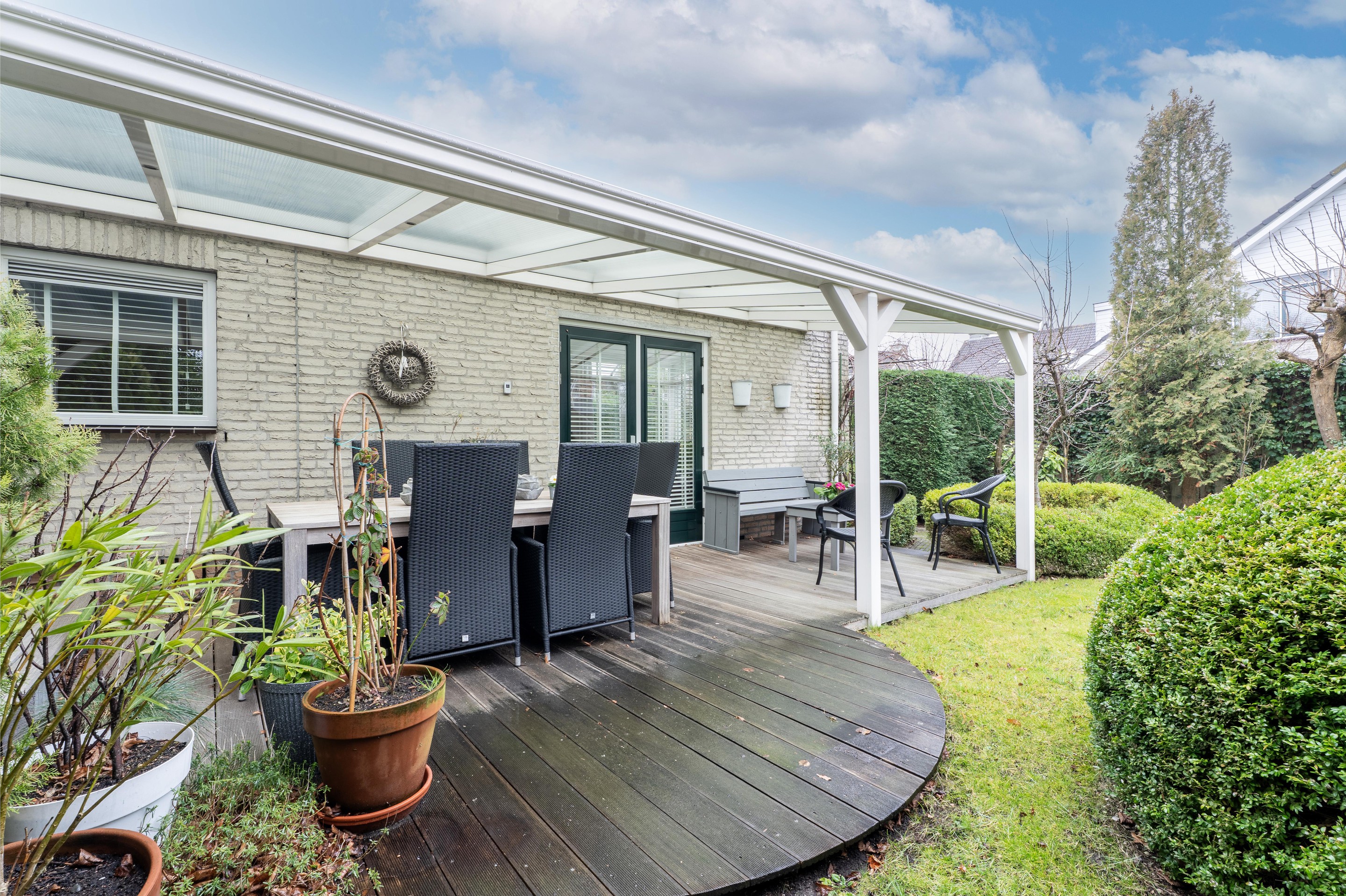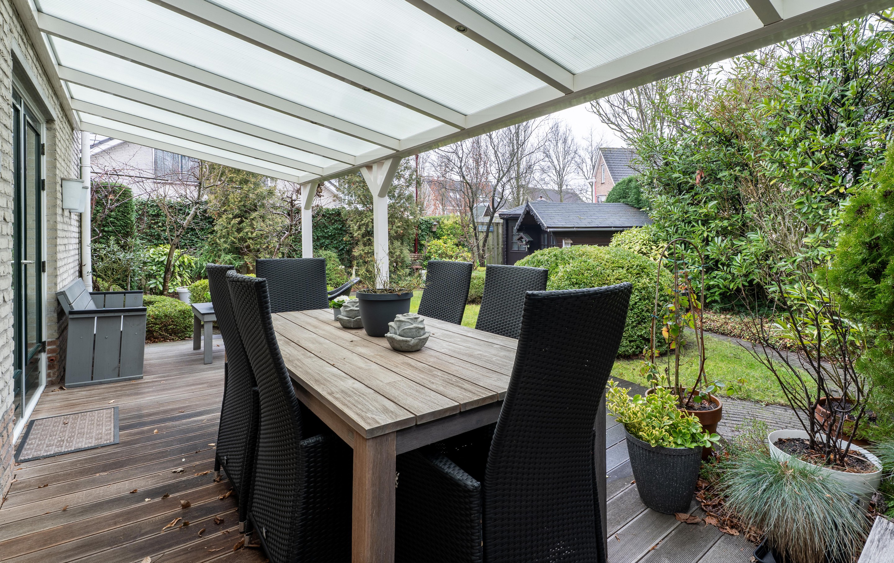 Dankzij de ligging rondom de woning kun je in de tuin op elk moment van de dag genieten van zowel zon als schaduw. De tuin is verder voorzien van twee houten bergingen, een achterom naar de voorzijde, een elektrisch zonnescherm en screens.