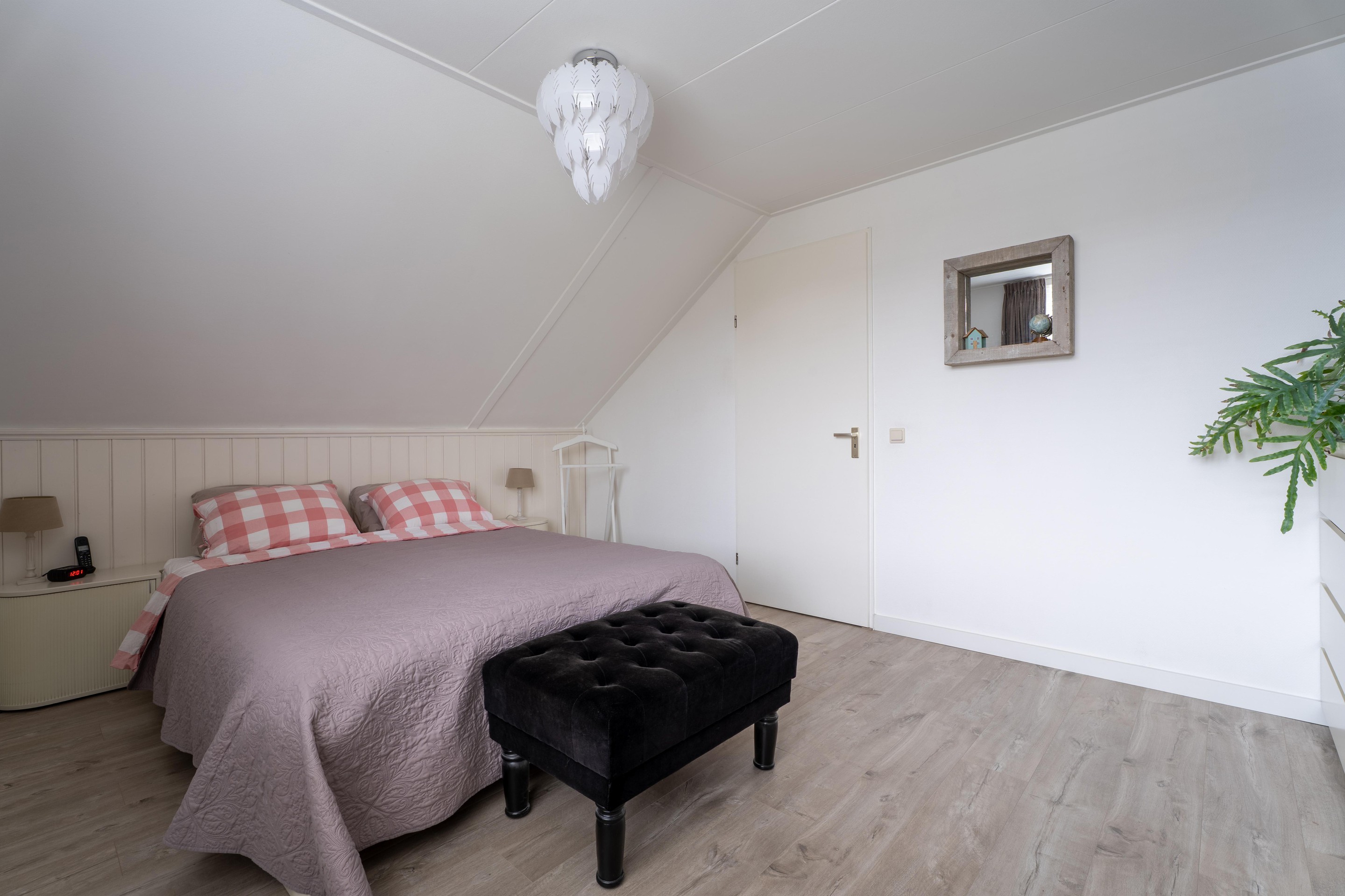 De slaapkamer aan de voorzijde is voorzien van prachtige inbouw schuifdeurkasten en biedt toegang tot de vliering, ideaal voor extra opbergruimte.