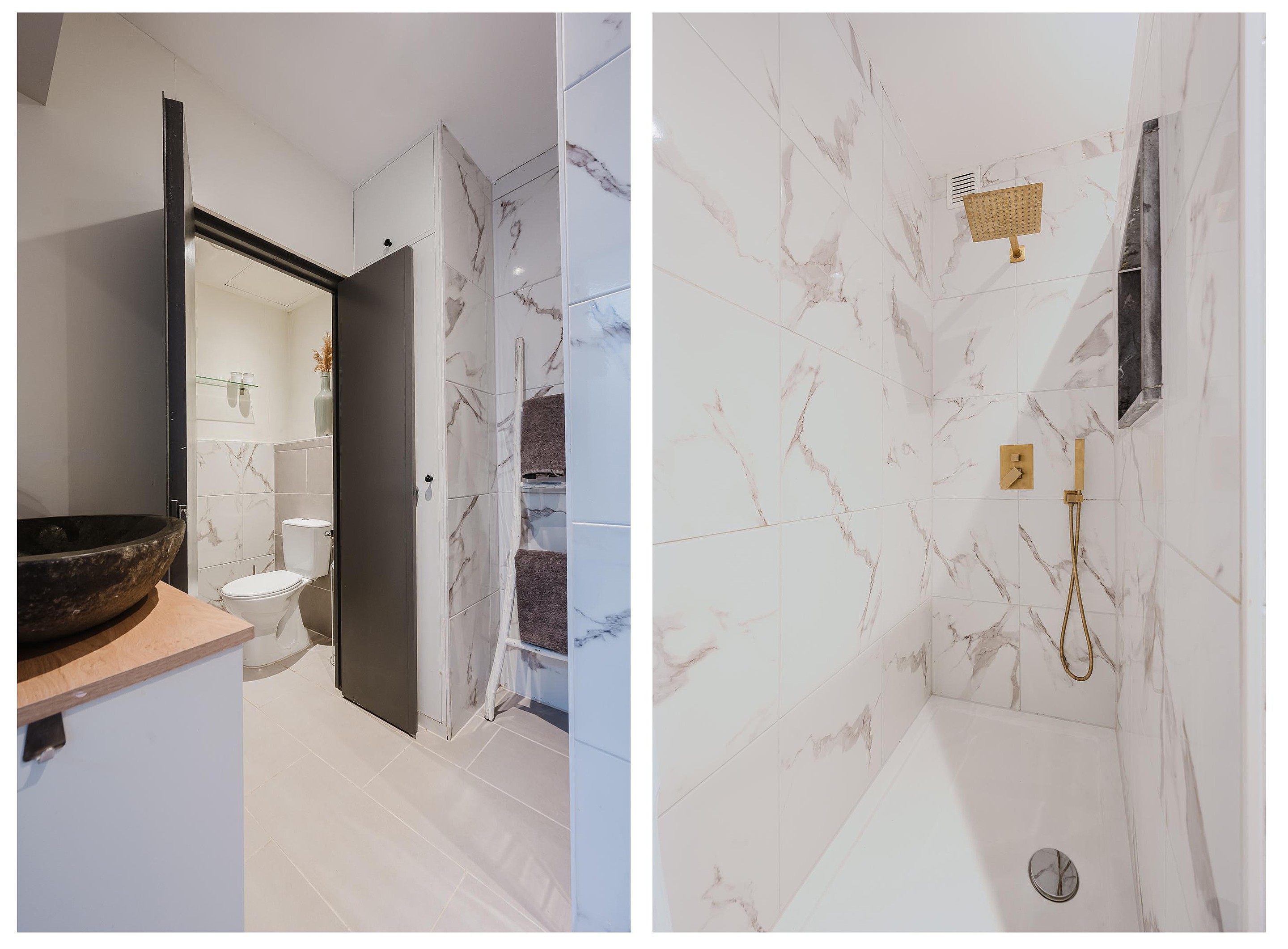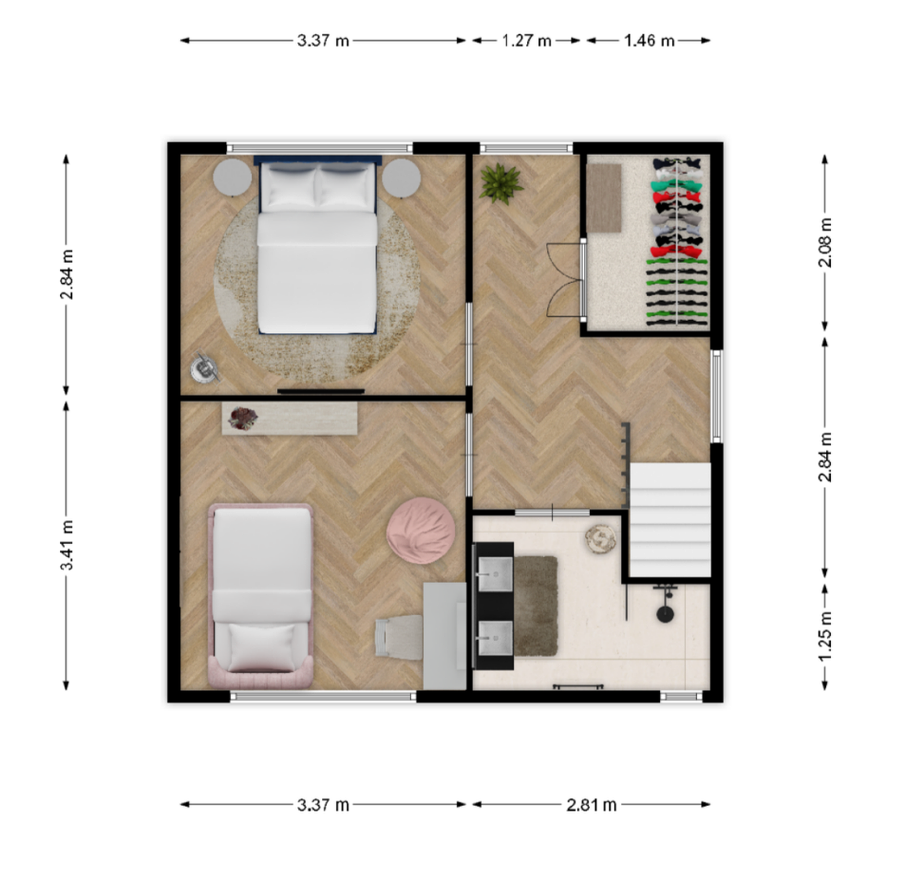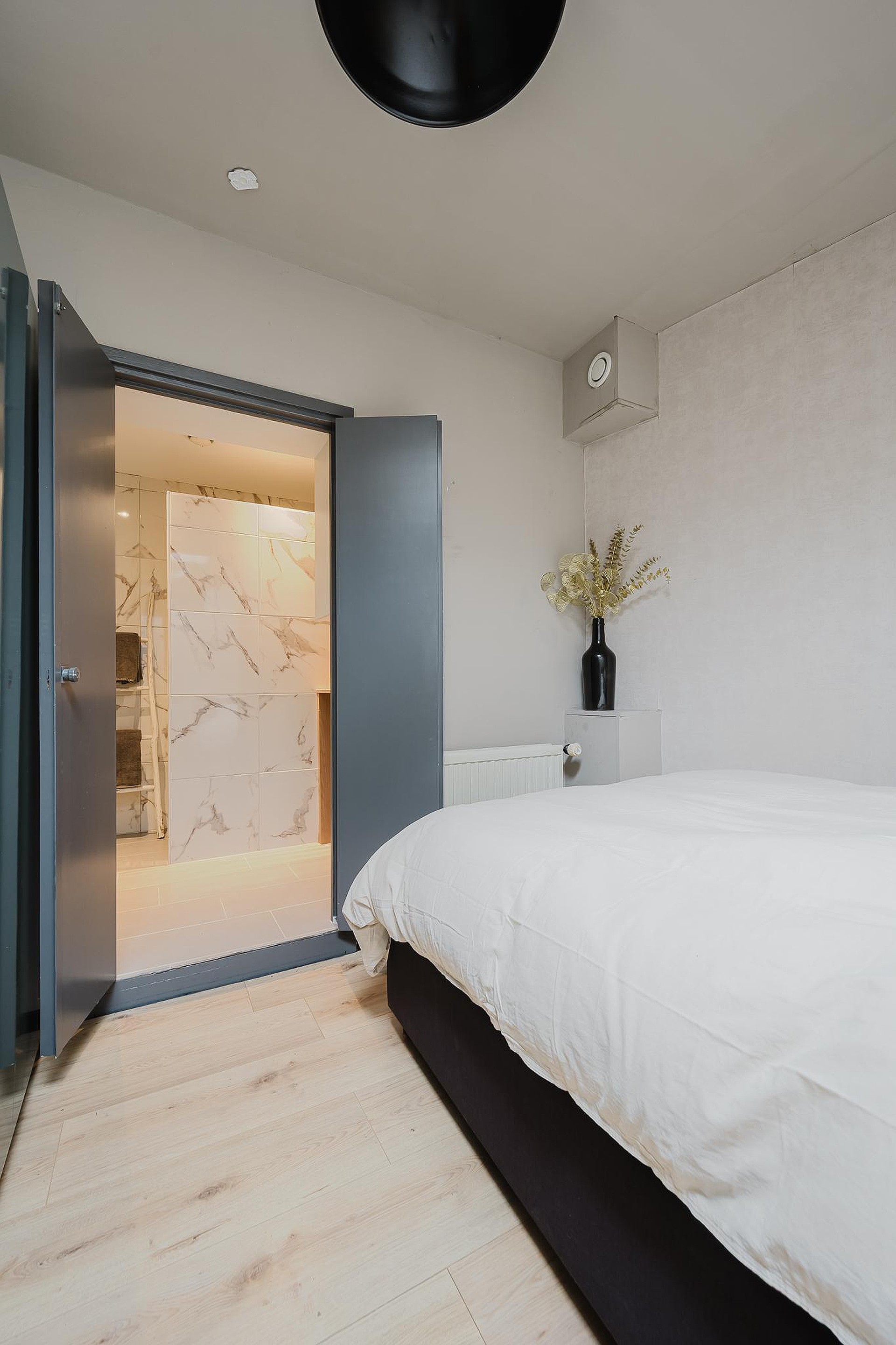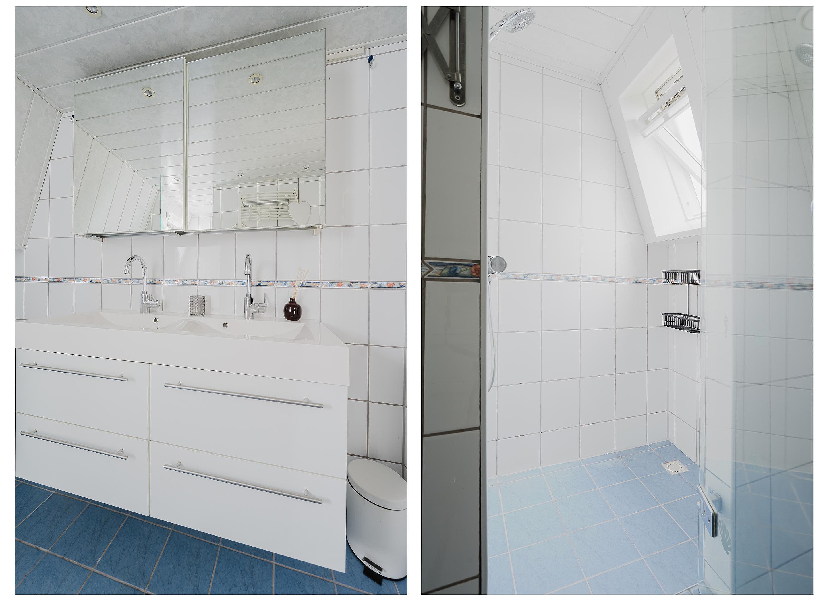 De tweede woning is bereikbaar via de tuin en oprit en beschikt over een eigen entree. Vanuit de hal zijn drie slaapkamers bereikbaar, waarvan één met extra isolatie en geluiddemping, ideaal als studio of werkruimte. De badkamer is modern uitgevoerd met inloopdouche, wastafel en toegang tot het toilet, die ook vanuit de hal te bereiken is.