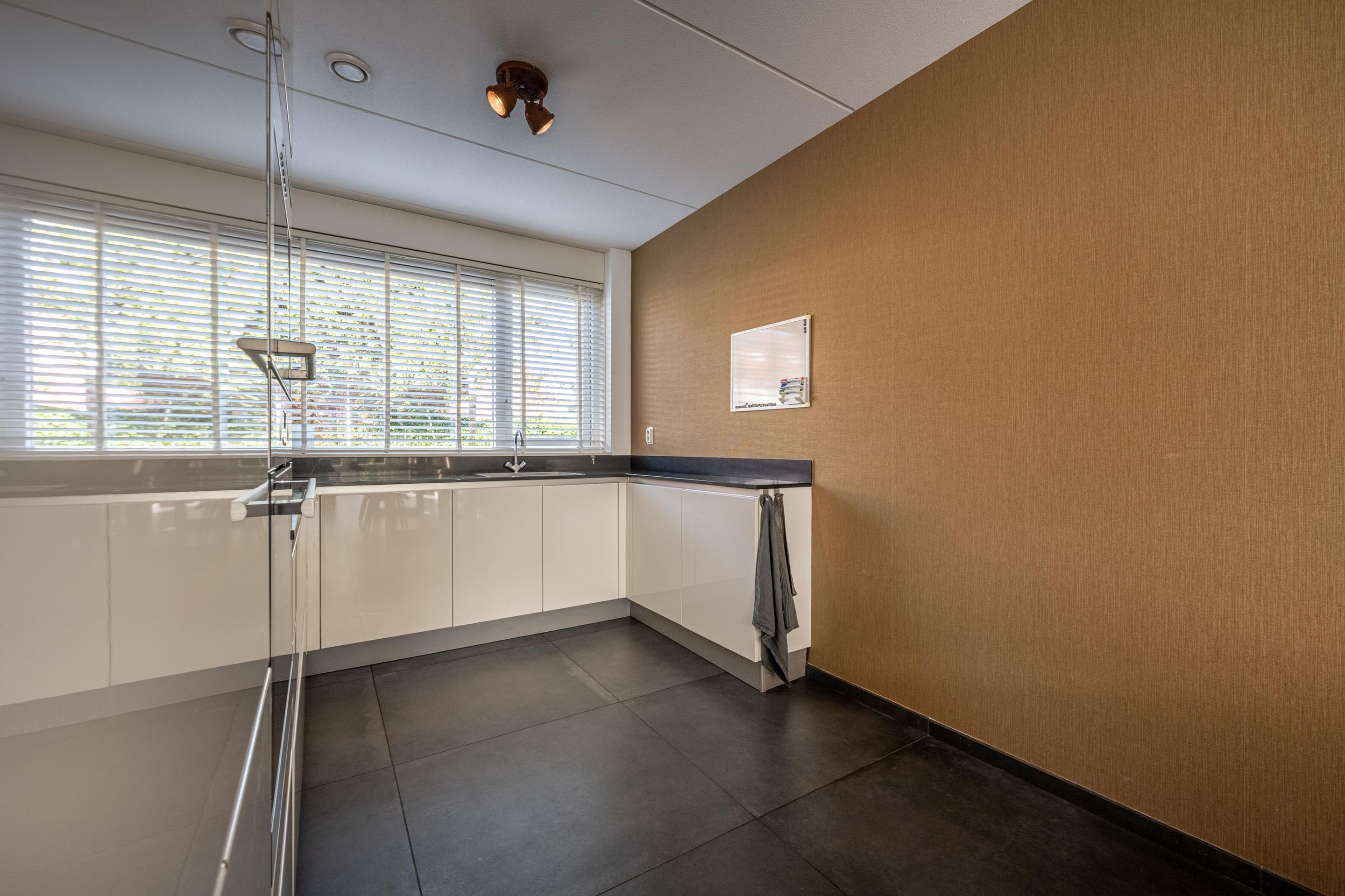 Aan de voorzijde van de woning bevindt zich de moderne open keuken. Deze is praktisch ingedeeld en voorzien van diverse inbouwapparatuur, waaronder een 5-pitsgaskookplaat, afzuigkap, combimagnetron, oven, vaatwasser en koel-vriescombinatie. Dankzij de ruime kasten en lades is er voldoende bergruimte en kun je hier met plezier koken en tafelen.