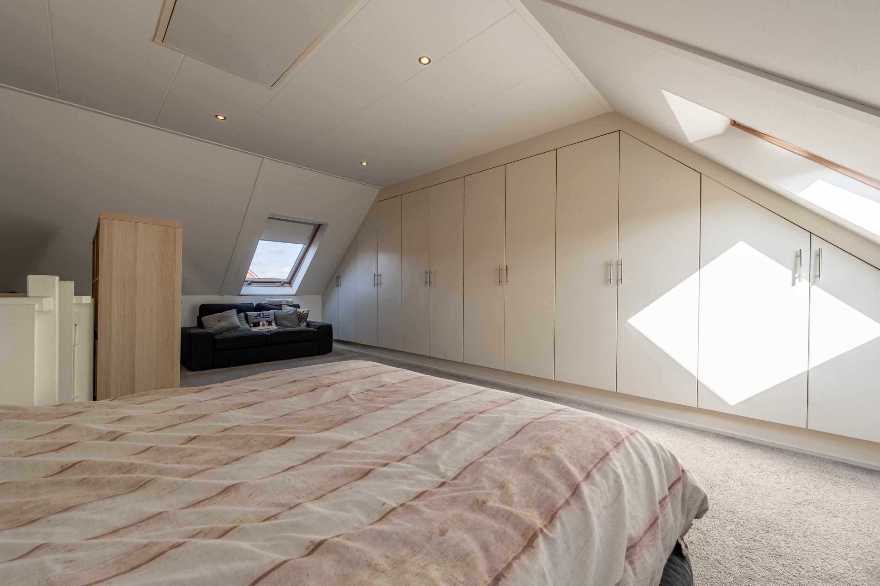 Via de vaste trap bereik je de ruime zolderverdieping. Deze open ruimte wordt momenteel gebruikt als vierde slaapkamer, maar biedt volop mogelijkheden. Met een dakkapel is hier eenvoudig een of zelfs twee volwaardige slaapkamers of een fijne thuiswerkplek te realiseren. De zolder beschikt over voldoende bergruimte achter de knieschotten en biedt plaats achter de kastenwand voor de wasapparatuur en de cv-installatie.