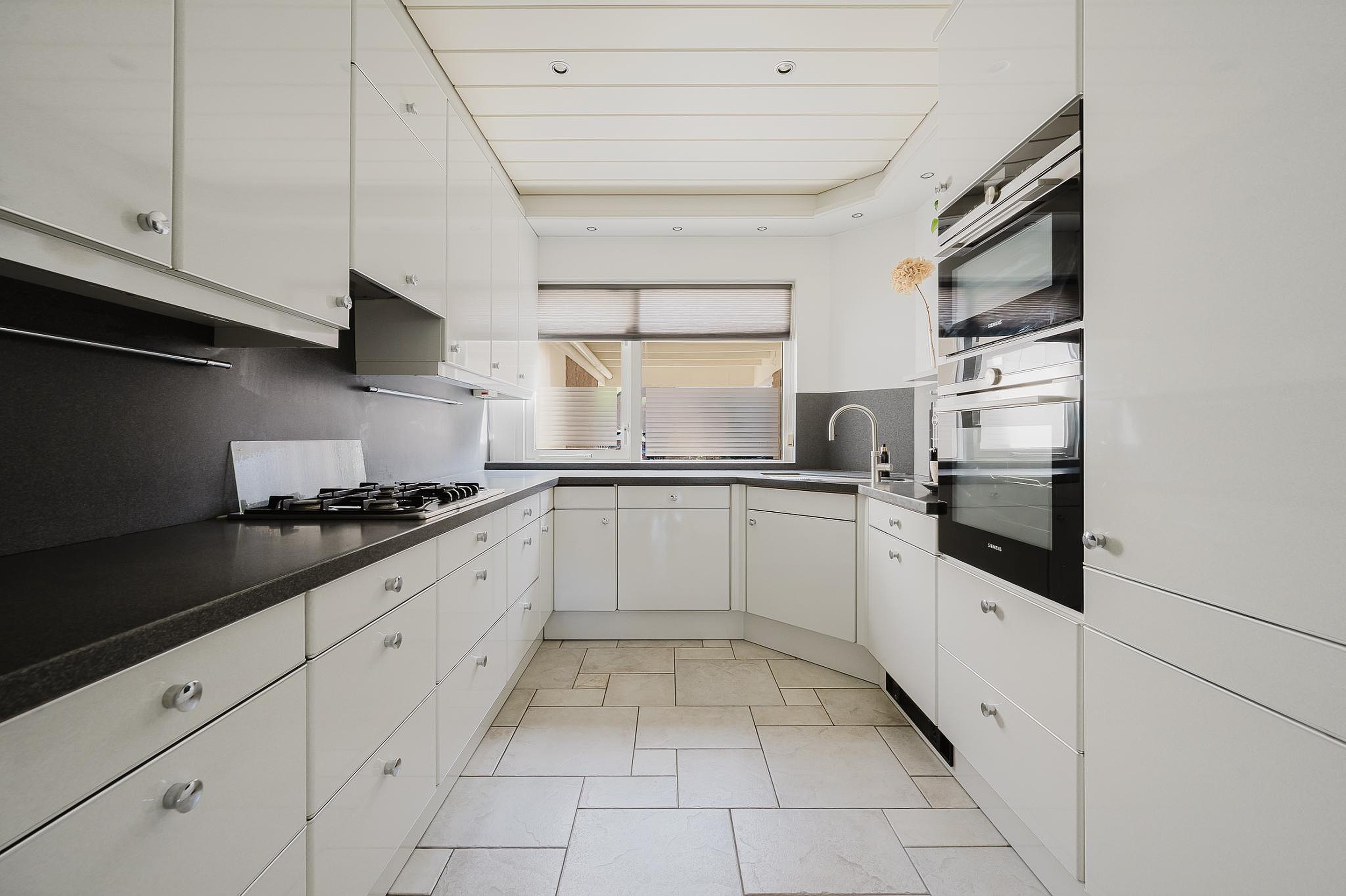 Aan de voorzijde van de woning bevindt zich de keuken, voorzien van inbouwapparatuur en een Quooker kraan.