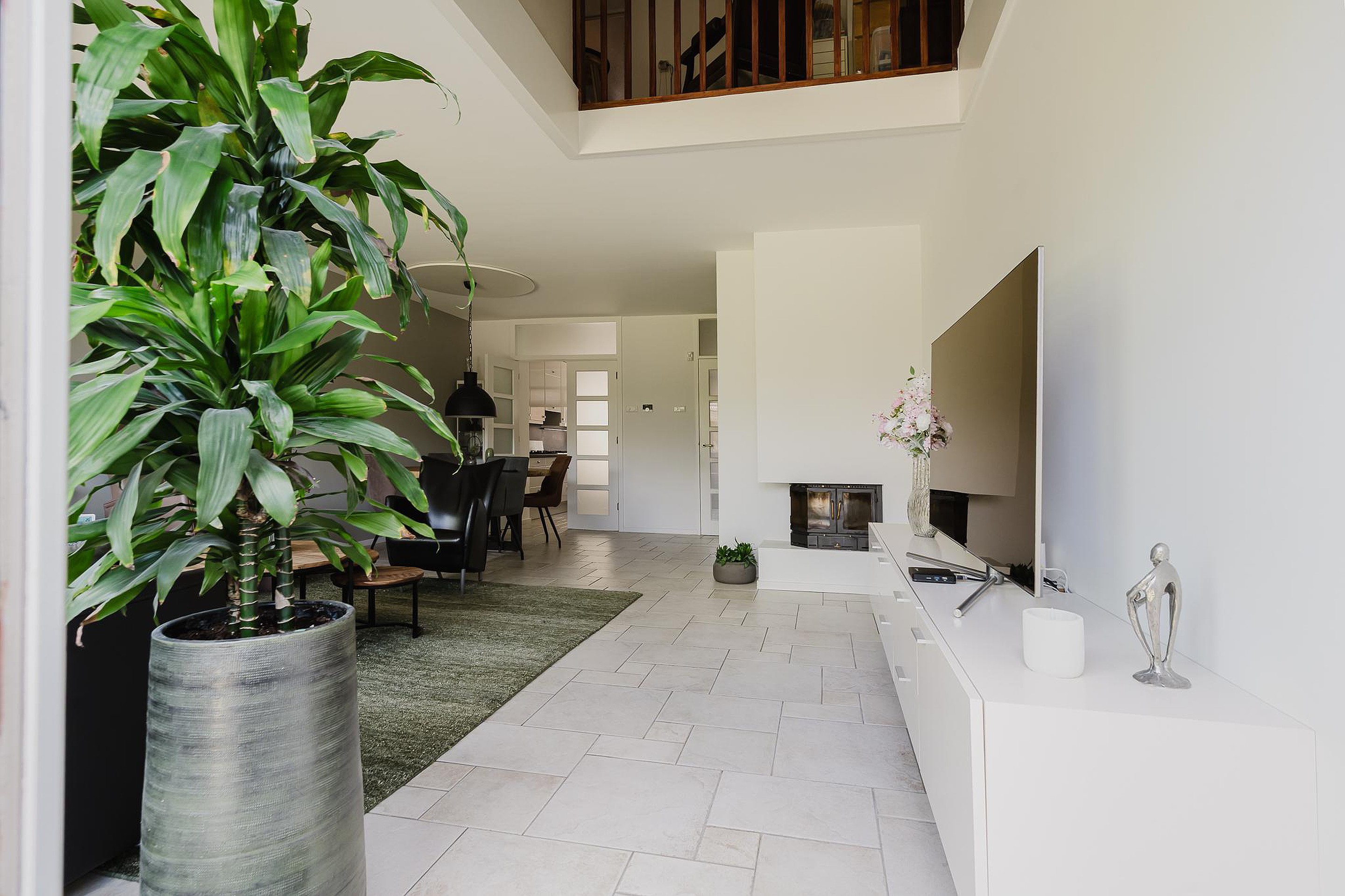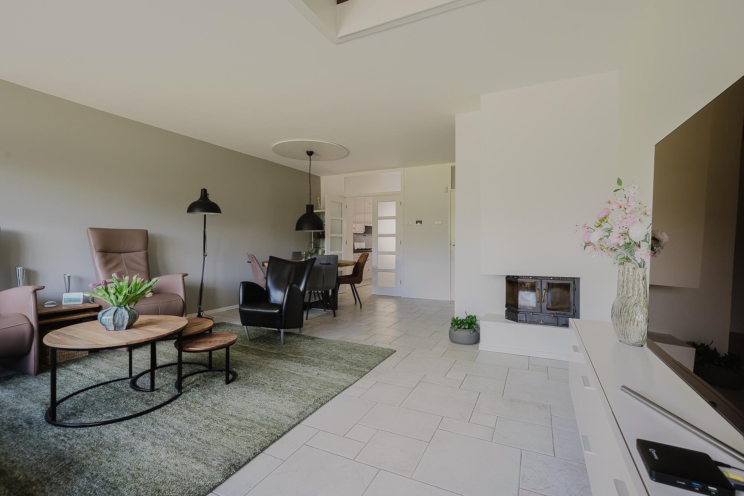 Je komt binnen in de hal met garderobe en het toilet. Vanuit hier stap je de ruime woonkamer binnen. De woonkamer heeft een speelse indeling dankzij de vide, een gezellige voorzet open haard en openslaande deuren naar de tuin.