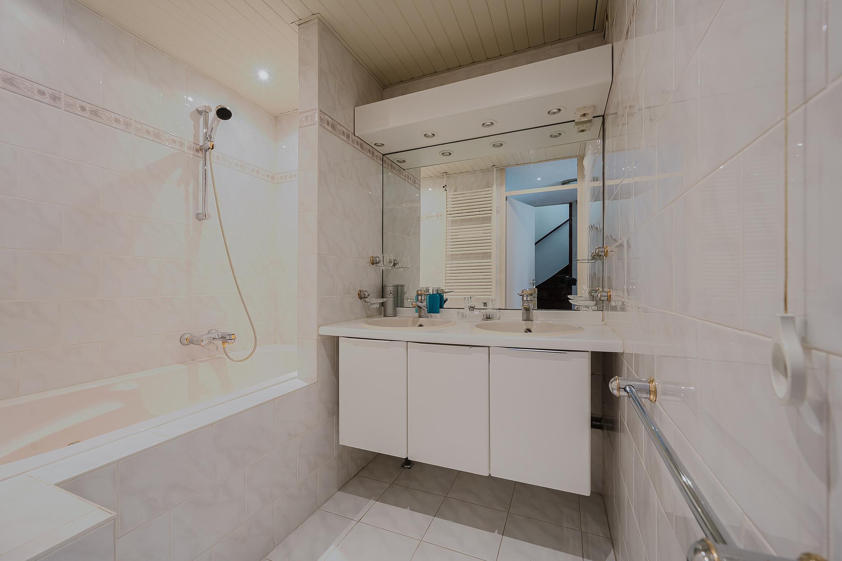 Daarnaast vind je hier een separaat toilet en de eerste badkamer, uitgerust met een bubbel-ligbad, dubbele wastafel met meubel en mechanische ventilatie.