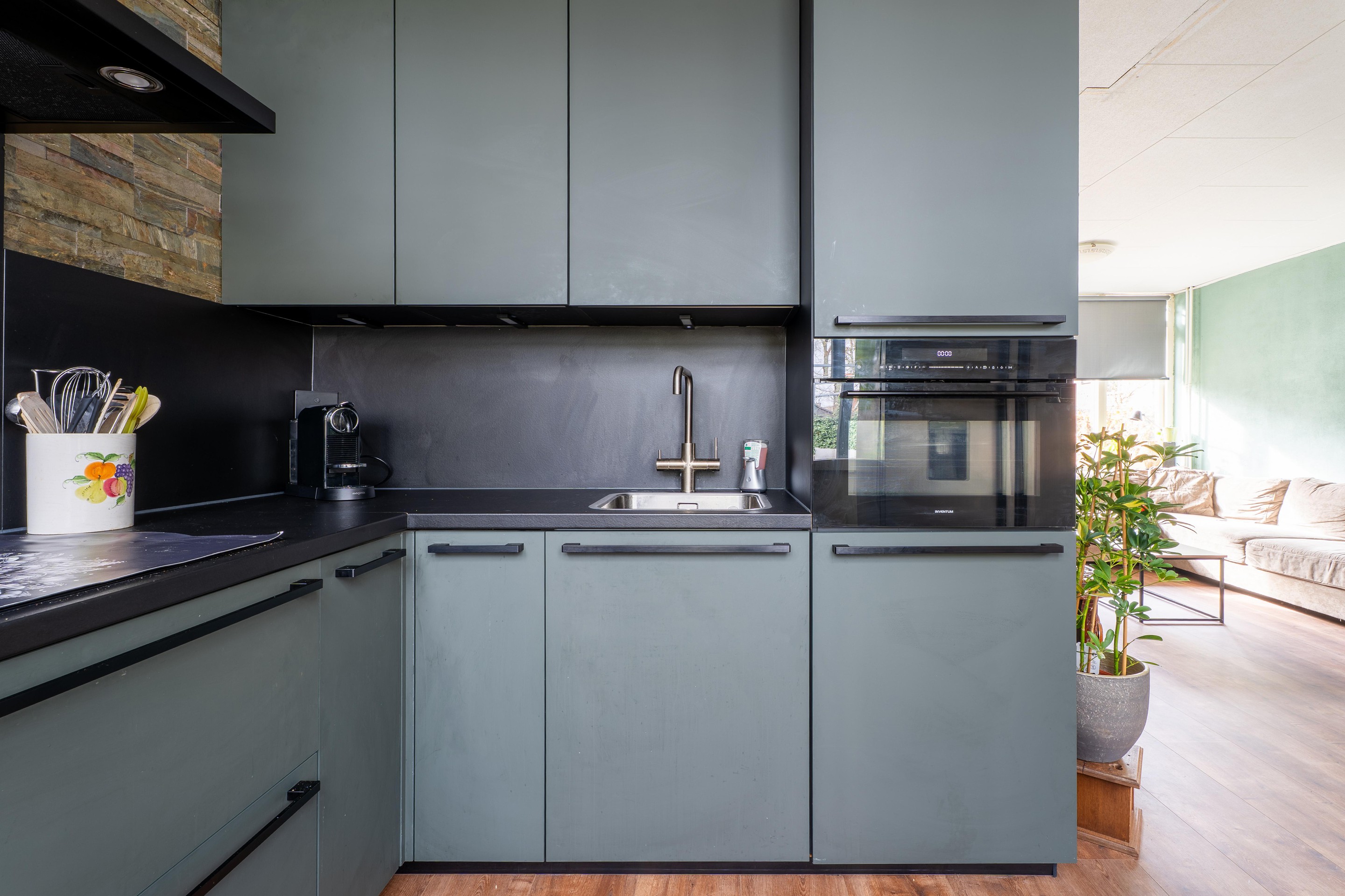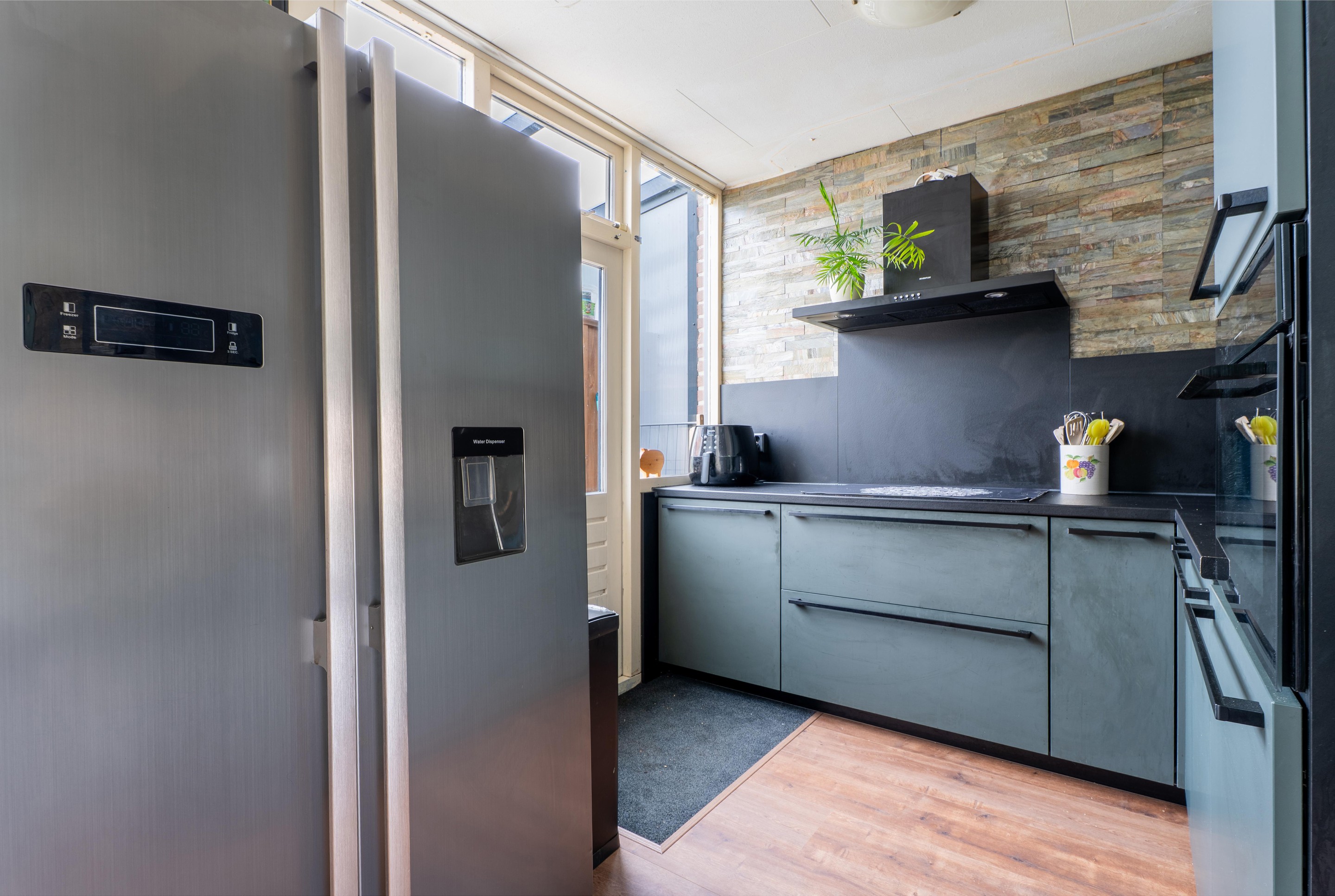 De keuken is gesitueerd aan de achterzijde van de woning en staat in directe verbinding met de tuin. De opstelling is in 2025 volledig vernieuwd en is voorzien van een vaatwasser, een losse koel-vriescombi, een combi-magnetron, een 4-pits inductiekookplaat en een kokendwaterkraan.