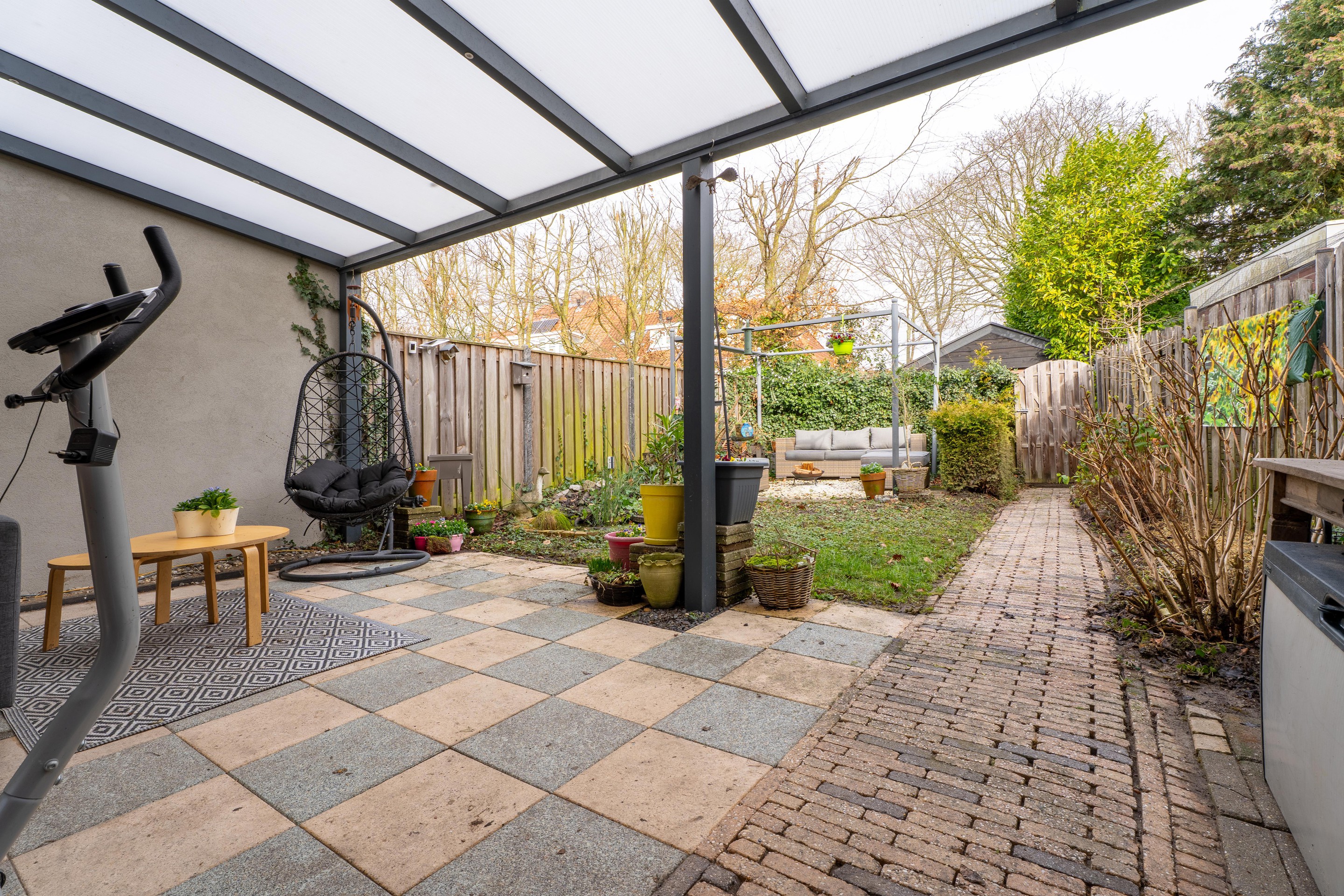 Vanuit de keuken heb je toegang tot de achtertuin. Direct aan de woning bevindt zich een moderne aluminium overkapping. De tuin beschikt over een achterom en via het overpad bereik je de vrijstaande stenen berging, perfect voor het stallen van fietsen en het opbergen van tuinspullen.