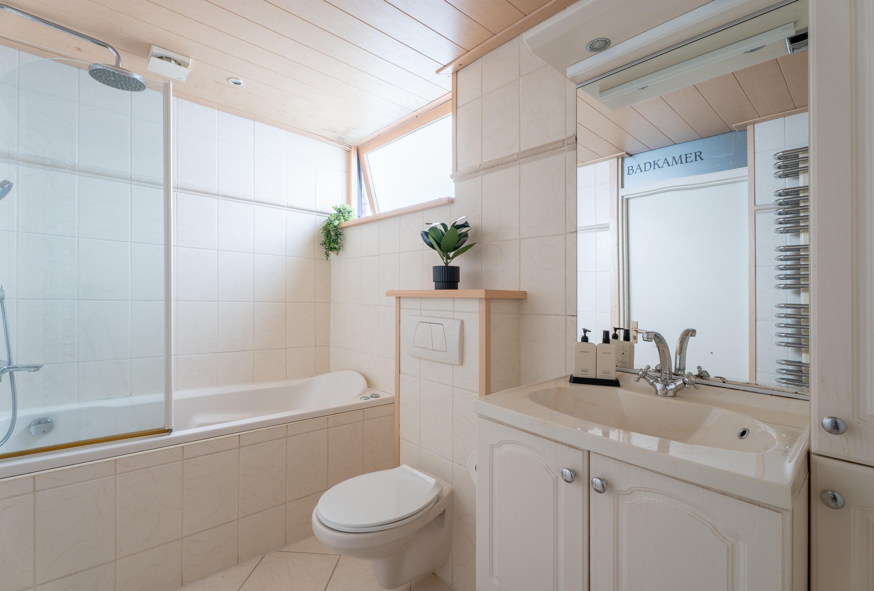 De badkamer is volledig betegeld en is voorzien van een ligbad met douche, een hangend toilet en een wastafel- met meubel.