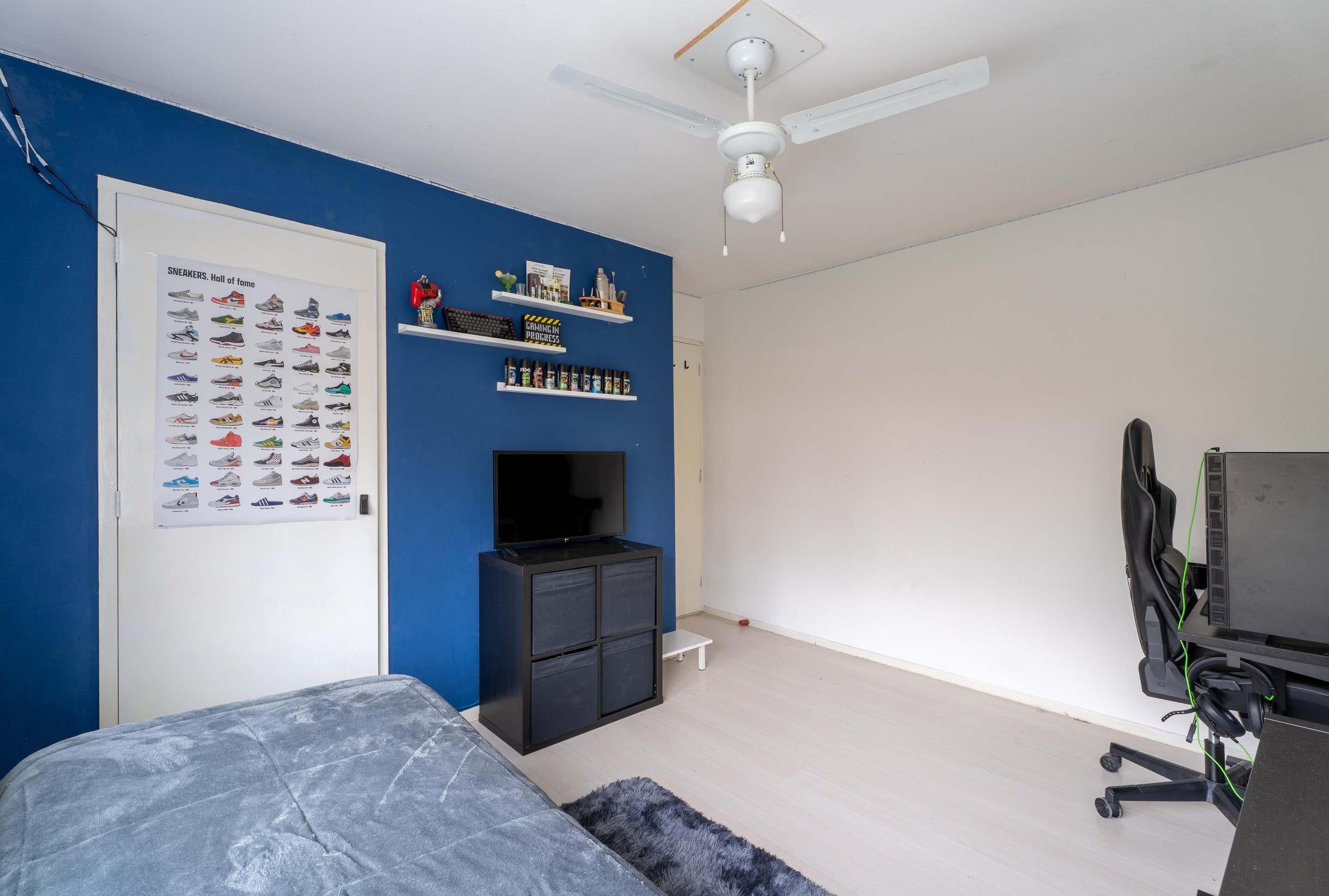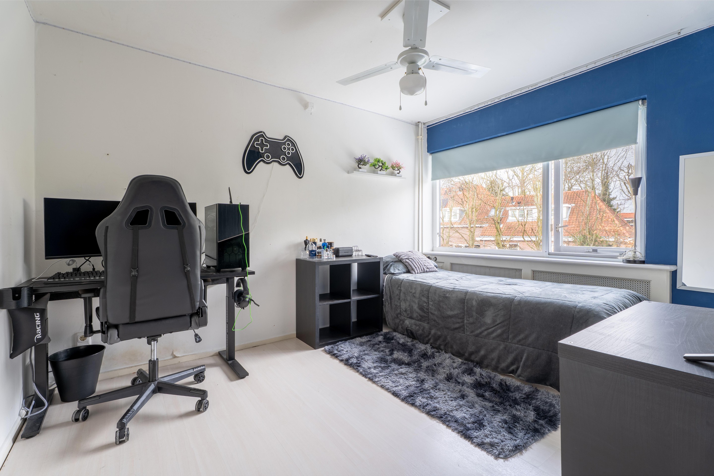 De zolderkamer is voorzien van een dakkapel voor extra ruimte. Verder is de verdieping afgewerkt met een laminaatvloer en zijn hier bergschotten gesitueerd.