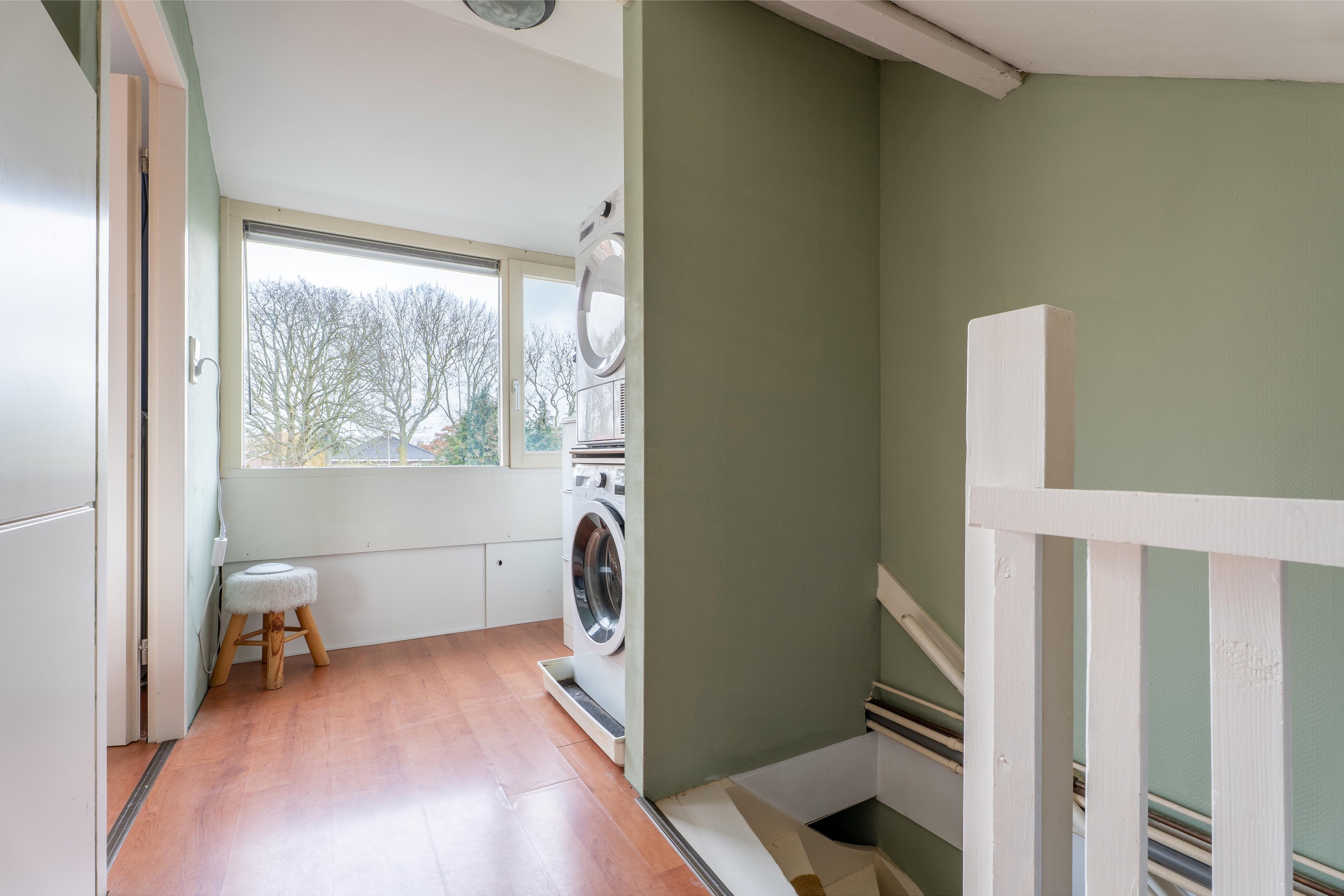 Via de trapopgang bereik je de tweede verdieping welke is verdeeld in een overloop en een zolderkamer. Op de overloop bevinden zich de cv-installatie en de aansluiting voor wasmachine- en droger.