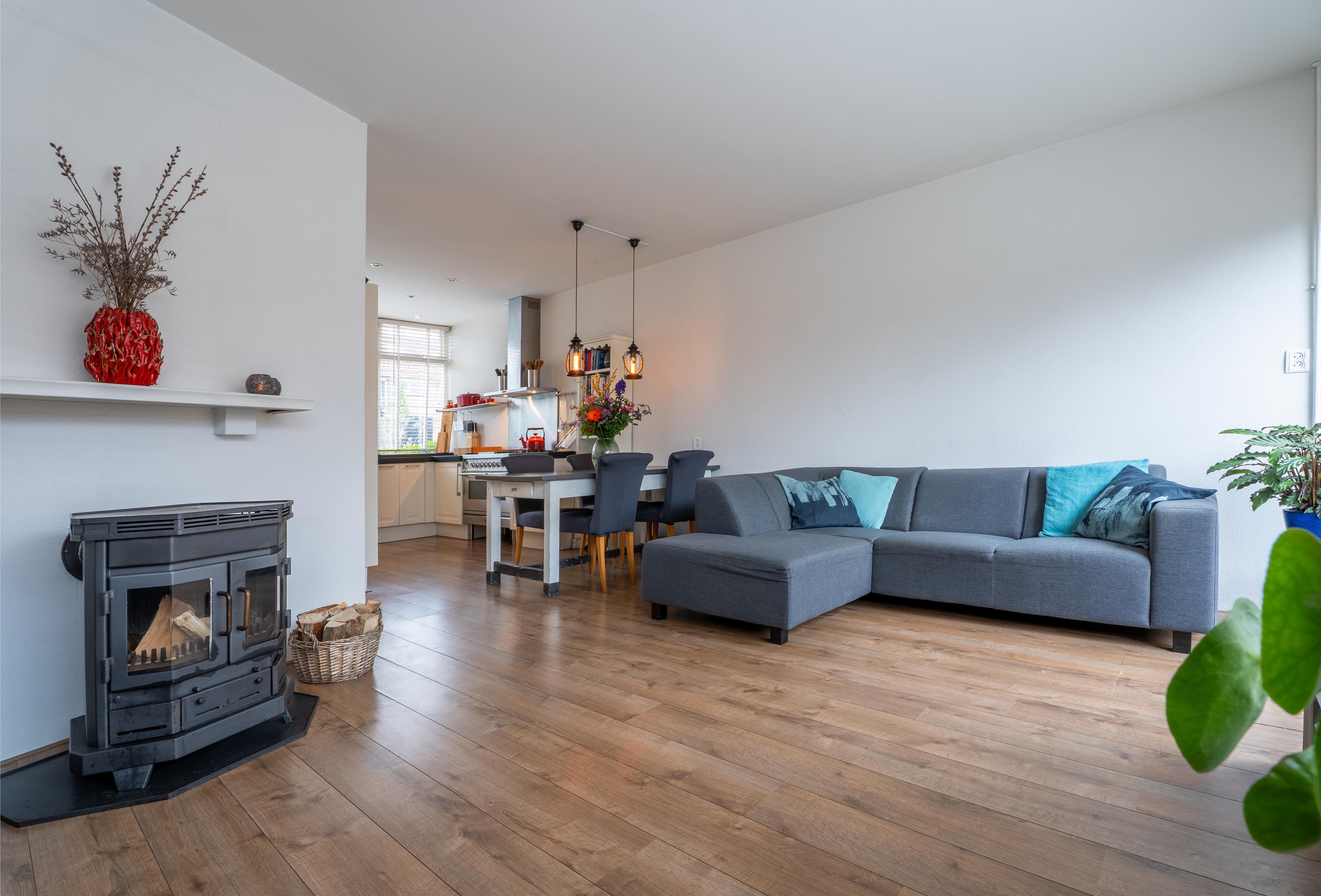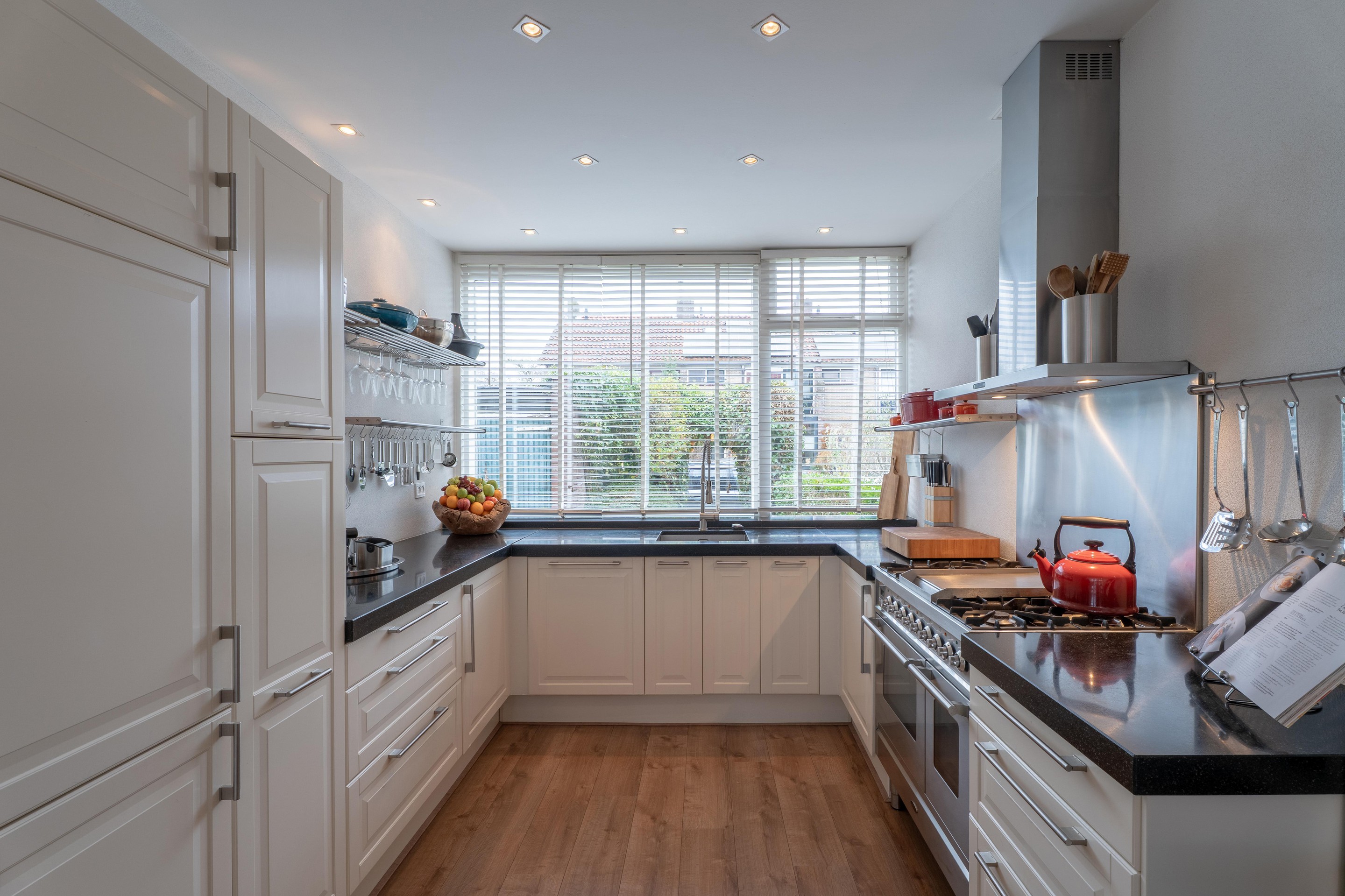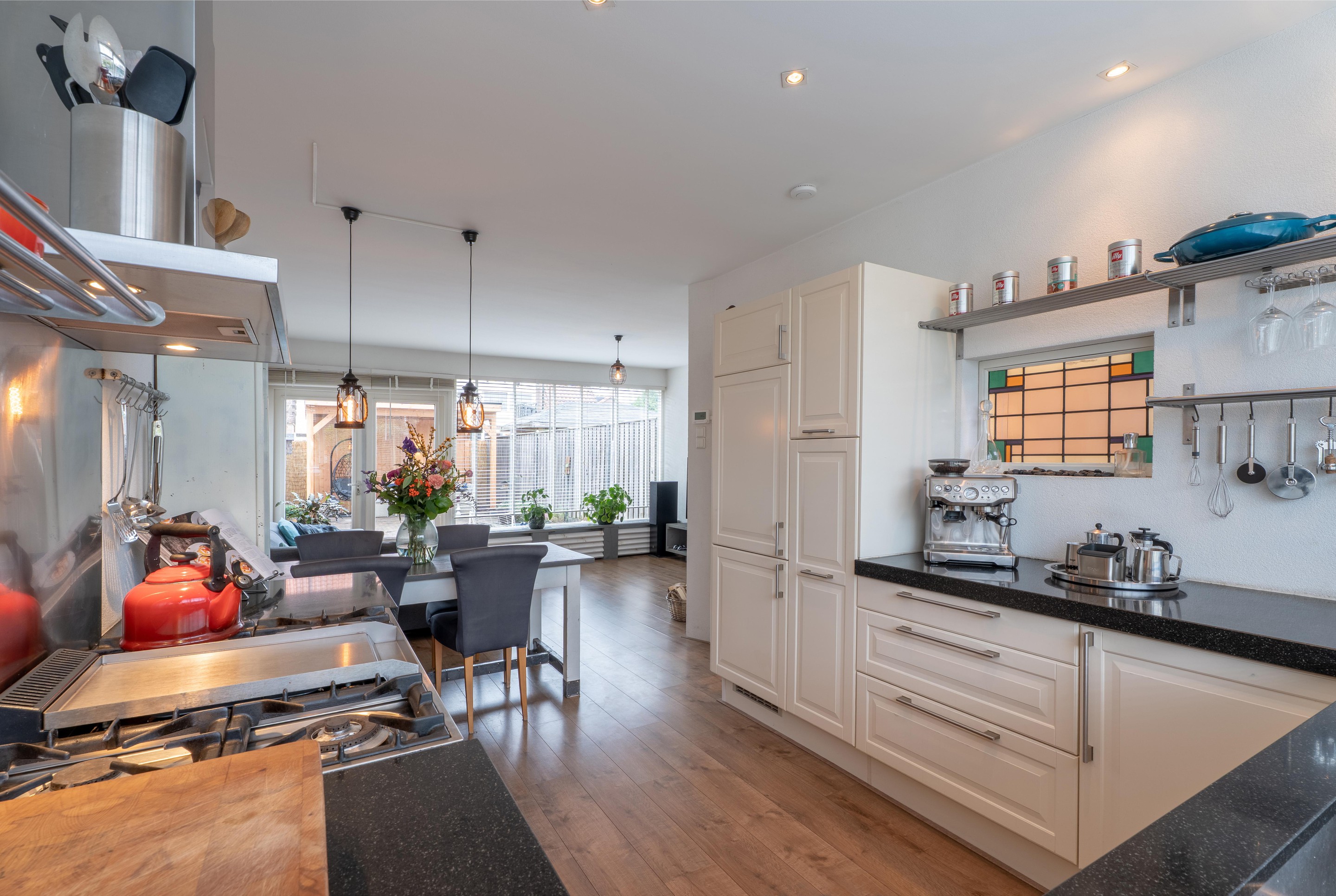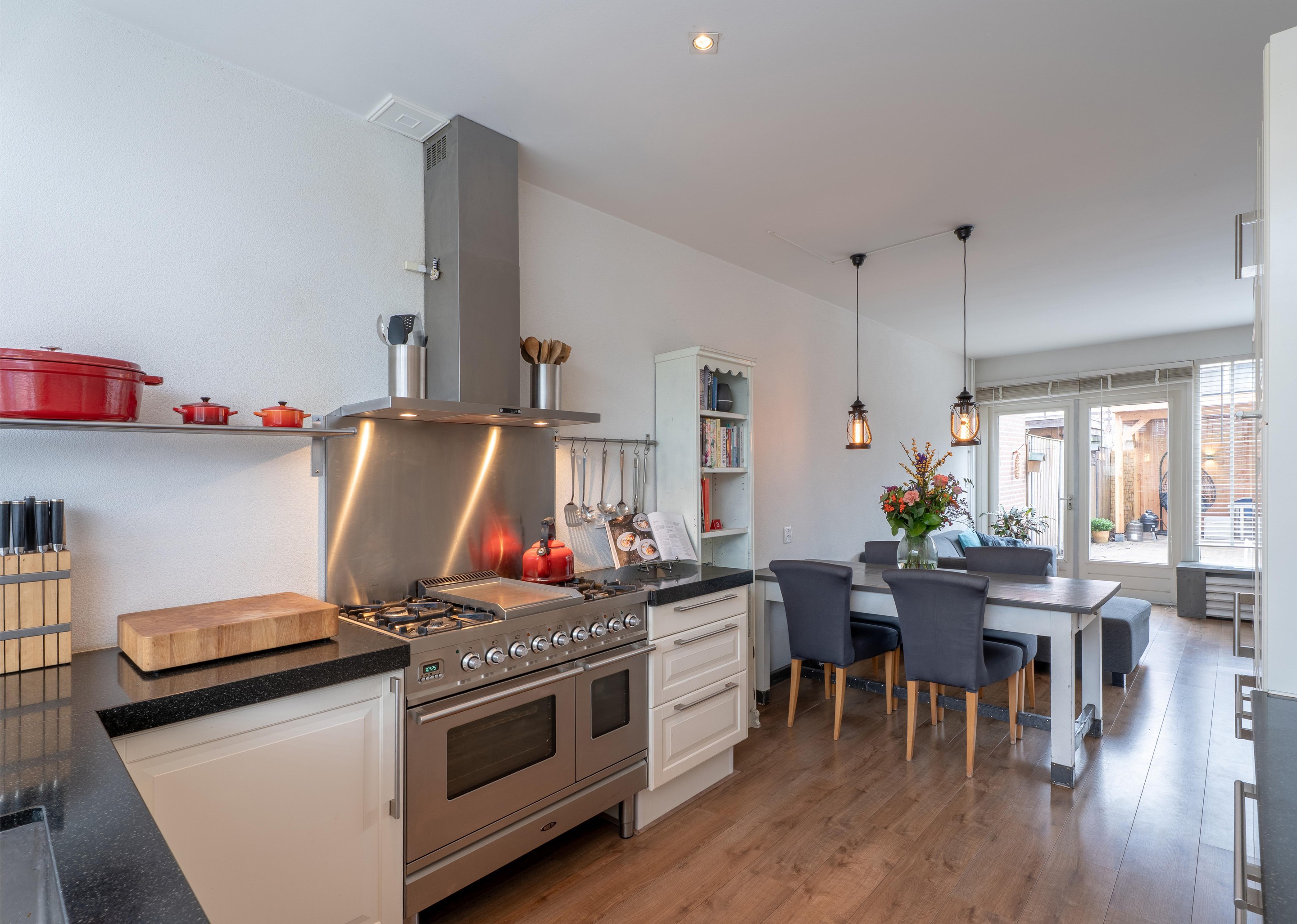 Eenmaal terug in de woning vind je aan de voorzijde de fijne, goed ingedeelde keuken met diverse inbouwapparatuur. De keuken in u-opstelling is voorzien van een Boretti fornuis met dubbele oven, een 4-pits kookplaat en een grillplaat/frytop, een koel-vriescombi en een vaatwasser.
